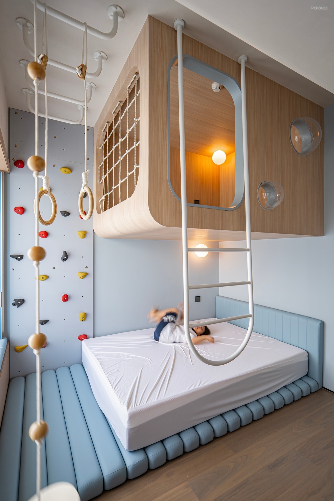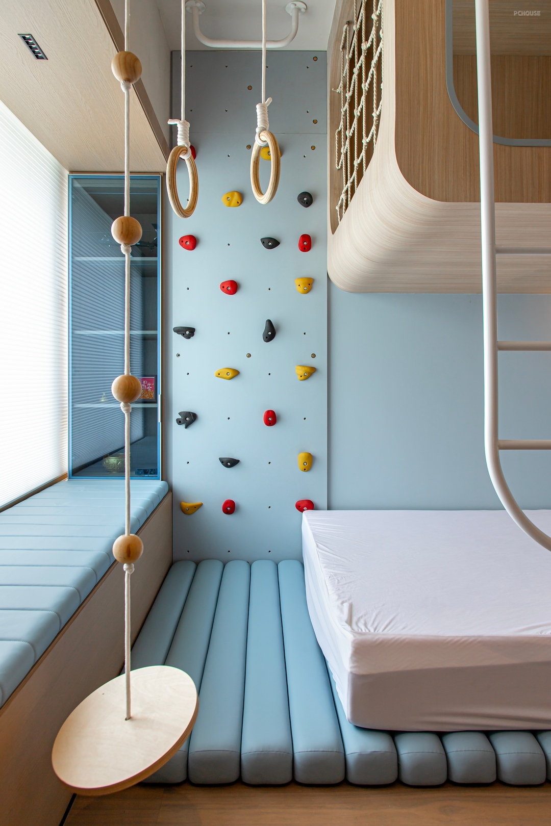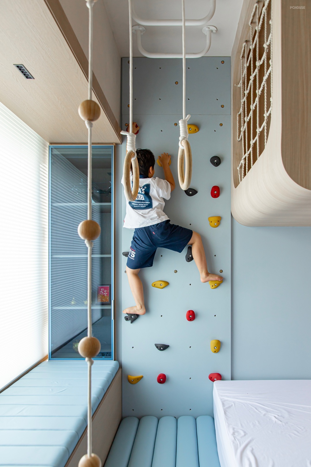 冠军宝宝的卧室也与常规儿童的家不一样,它是一个需要爬上去的树屋,这个小角落成了他的秘密基地,墙面的攀岩墙和梯绳也让他有了充分的活动空间。