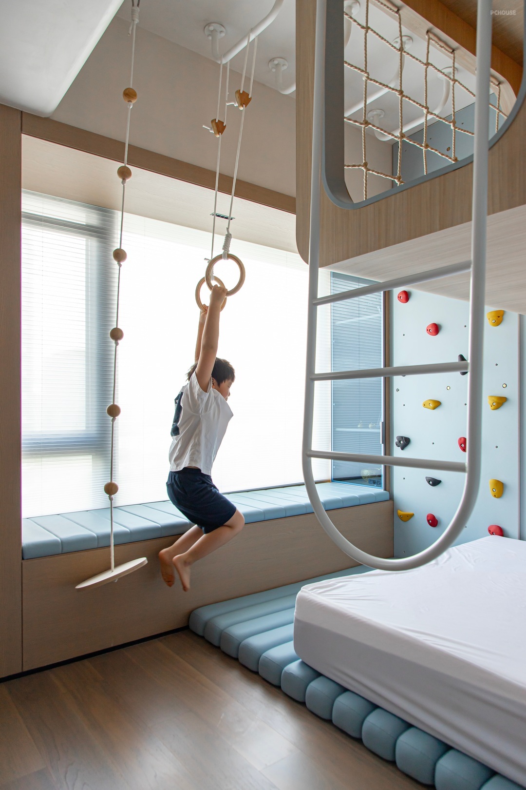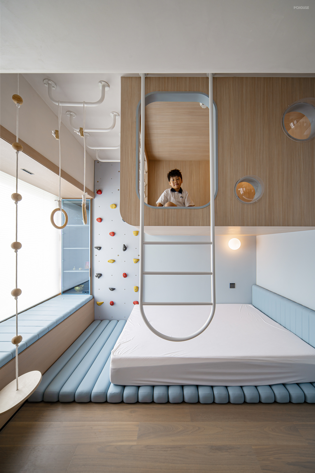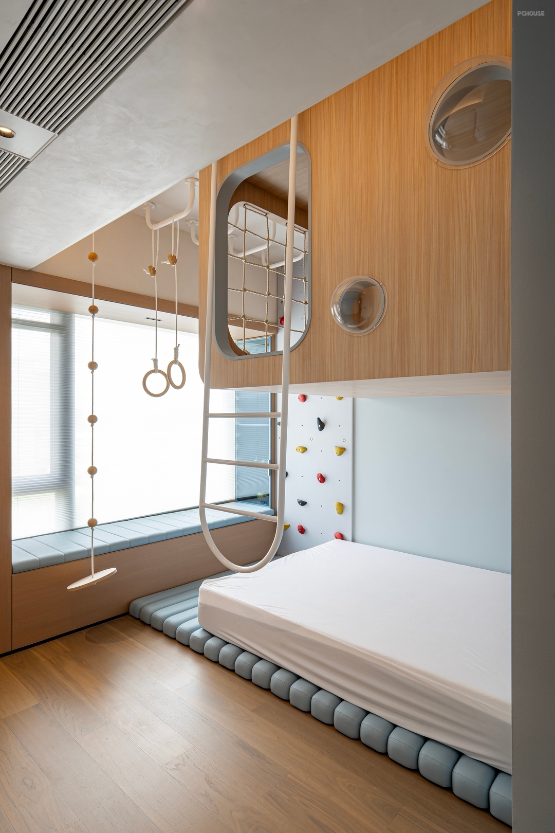 冠军宝宝的卧室也与常规儿童的家不一样,它是一个需要爬上去的树屋,这个小角落成了他的秘密基地,墙面的攀岩墙和梯绳也让他有了充分的活动空间。