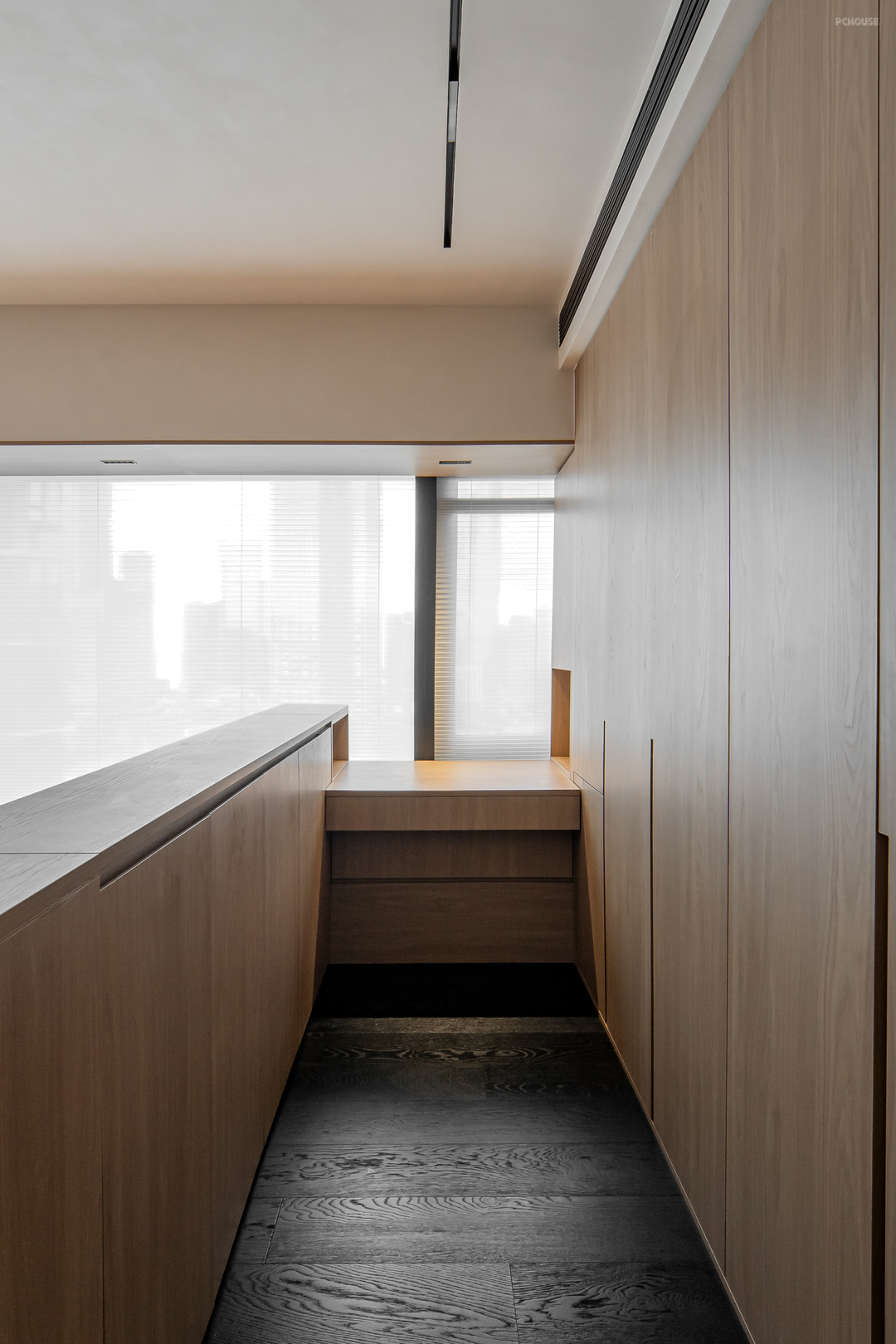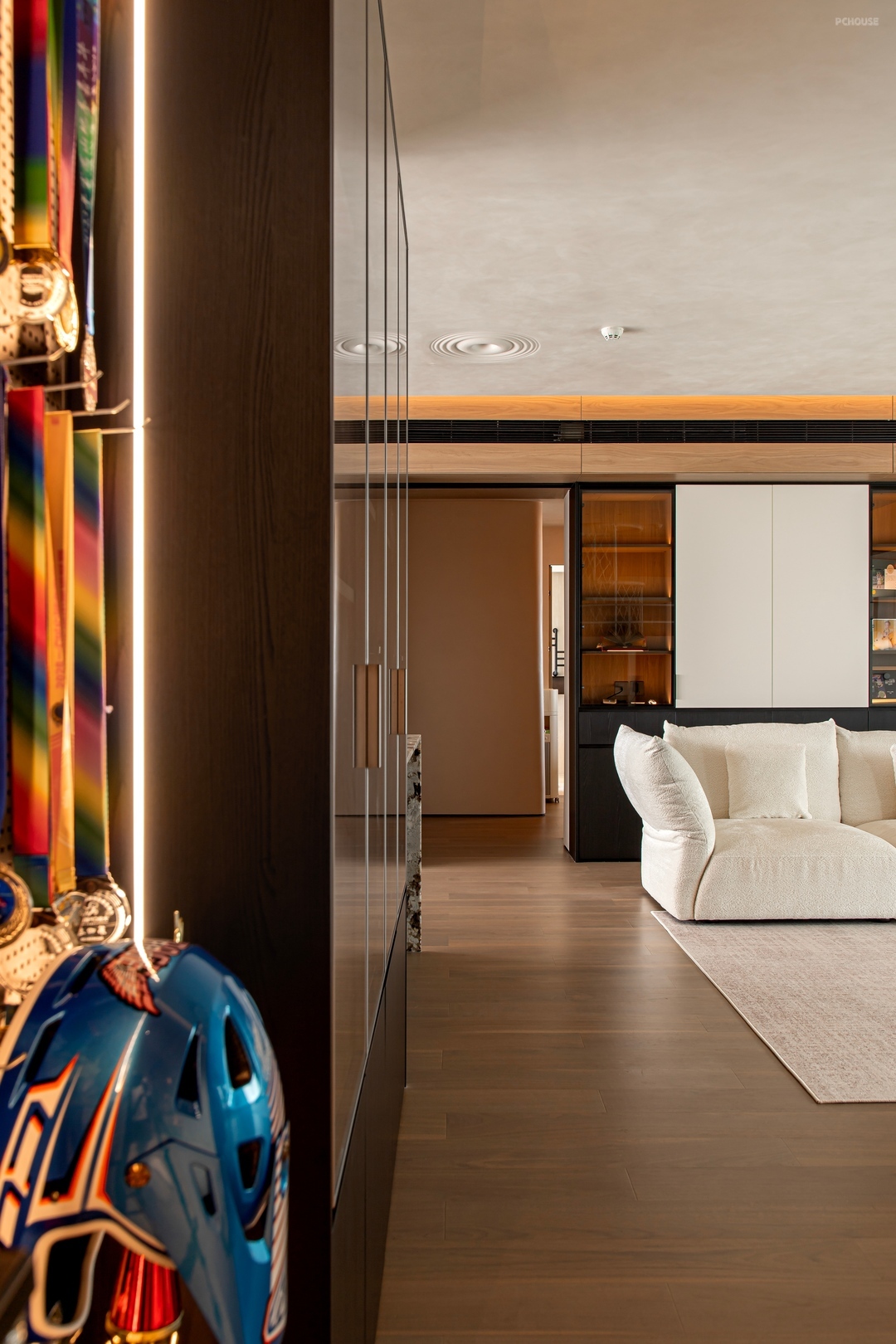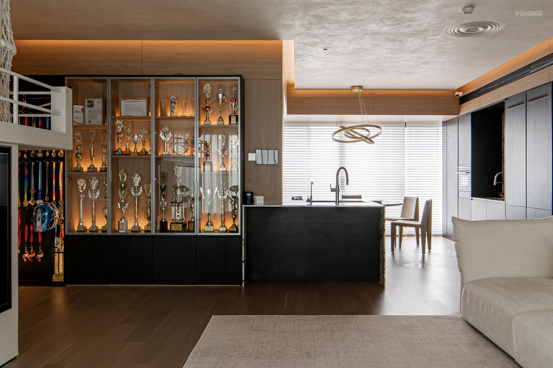 而在回家的过道路上,则设置了一整排奖杯和山地车的展示柜,充分展示属于孩子自己的荣誉,奖杯柜还巧妙地和厨房的台面连成一体,形成了一个小吧台的功能。