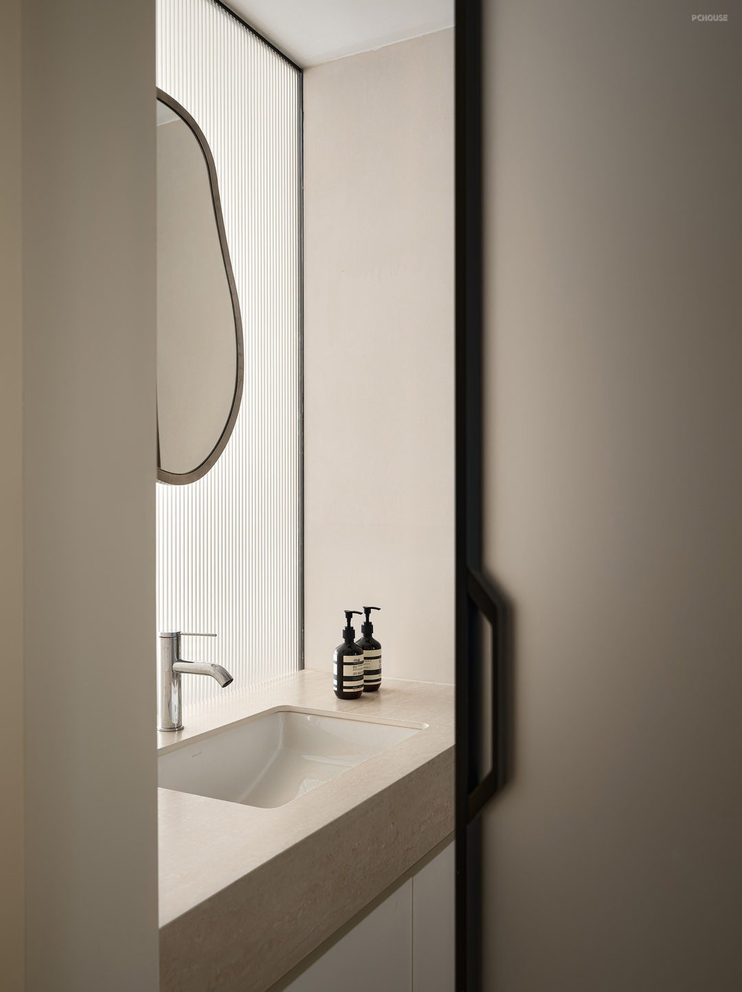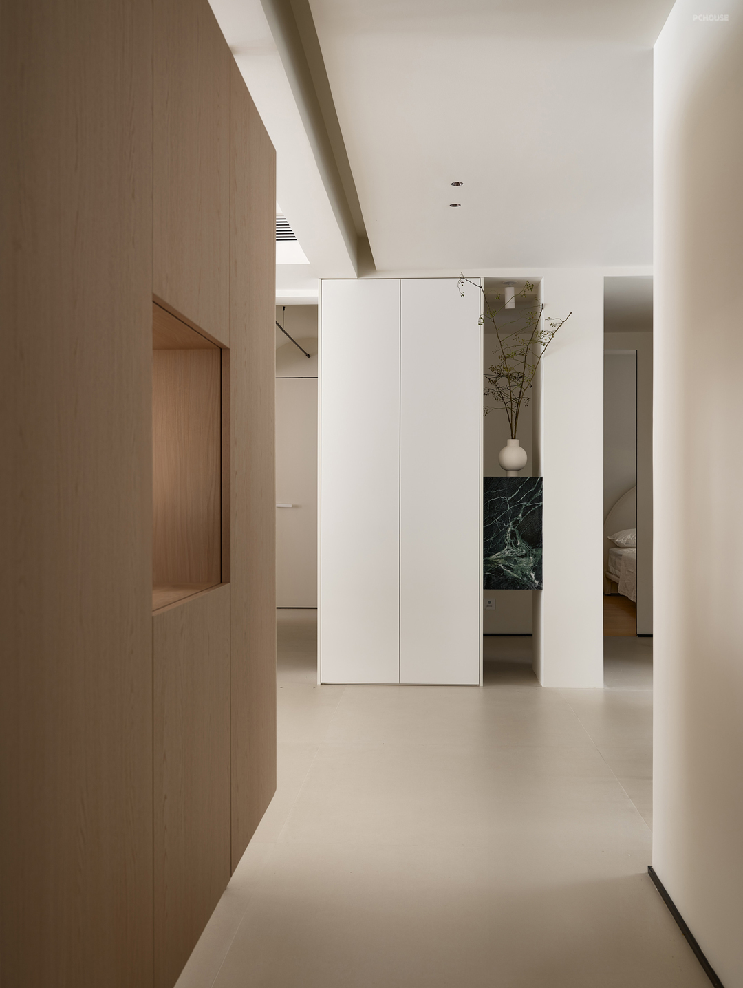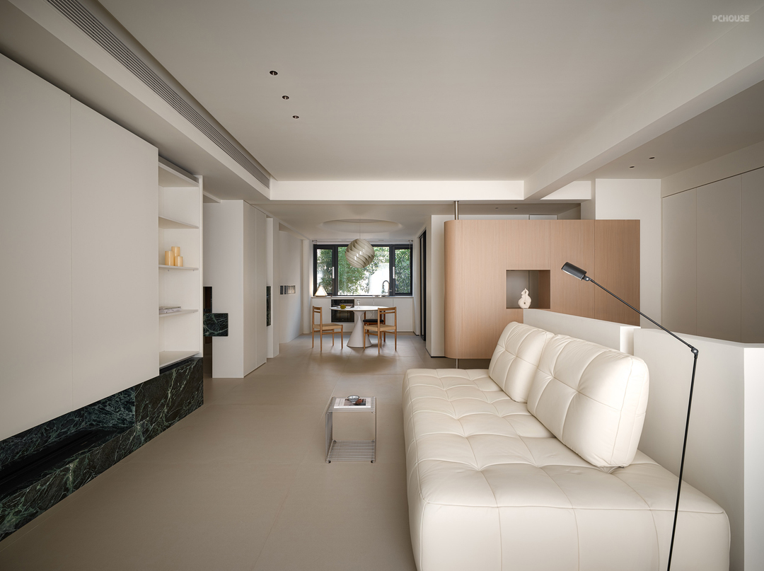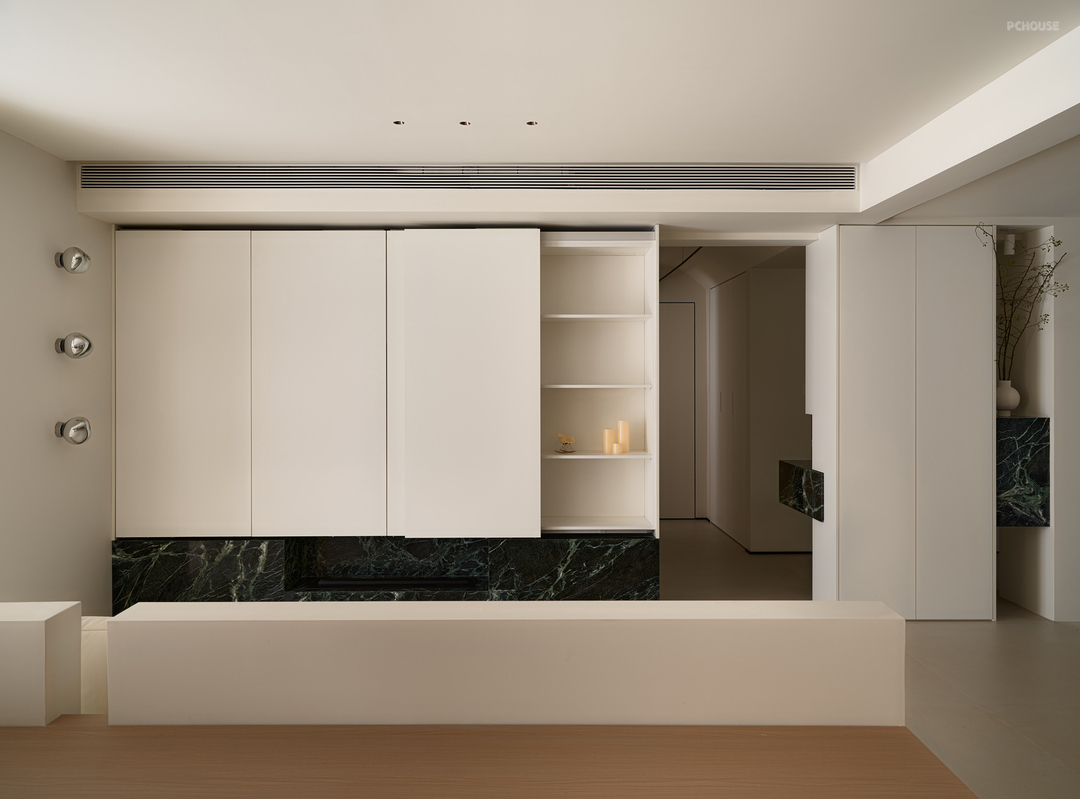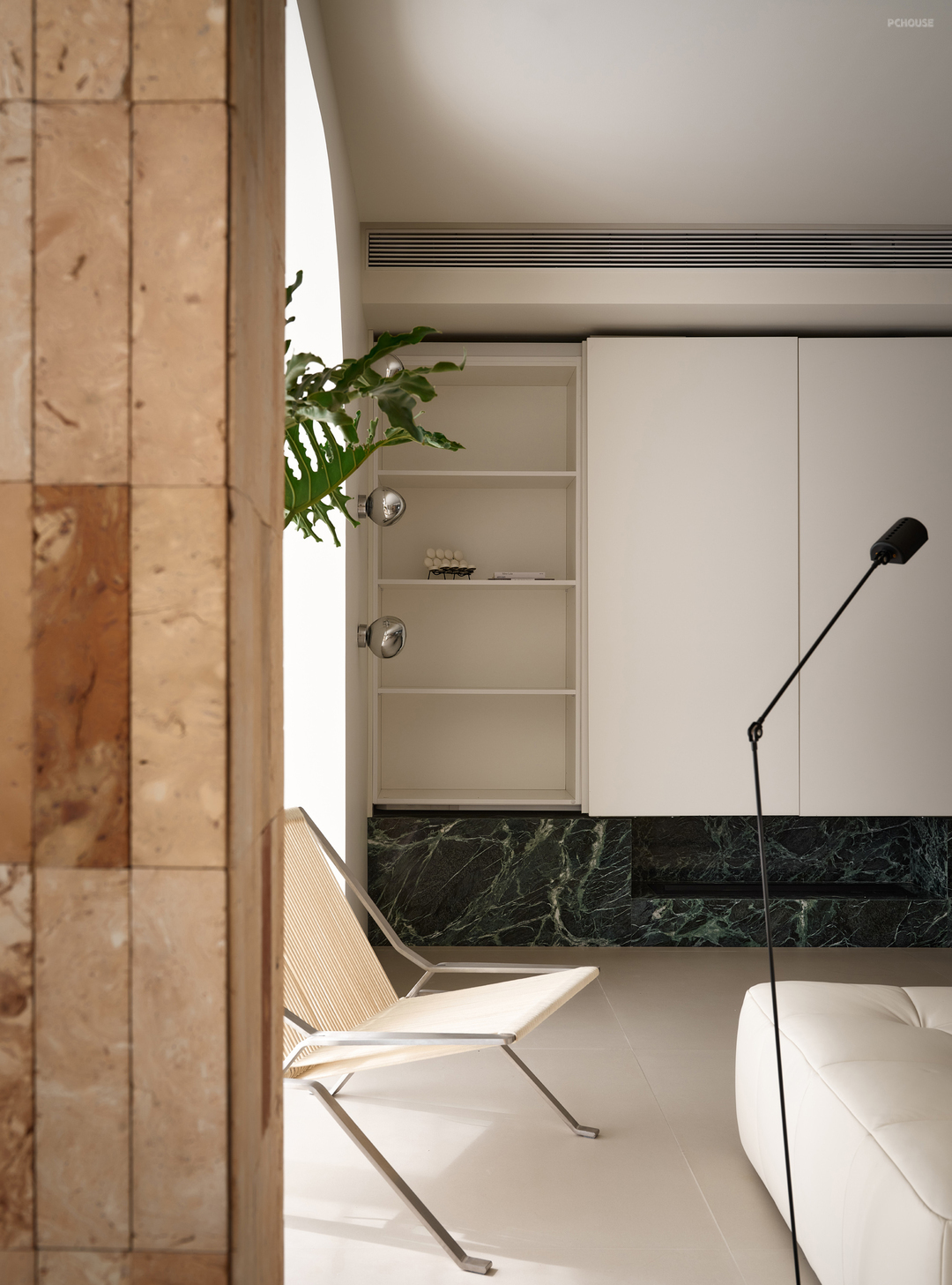 玄关,作为家的起始,犹如故事的序幕。左侧顶部保留了原始的横梁,而右侧则与餐厅空间的平顶相连,呈现出一种不对称且带有镂空美感的设计。正对着的,是悬空而立的Prada绿石材,与电视机背景墙形成视觉上的呼应。