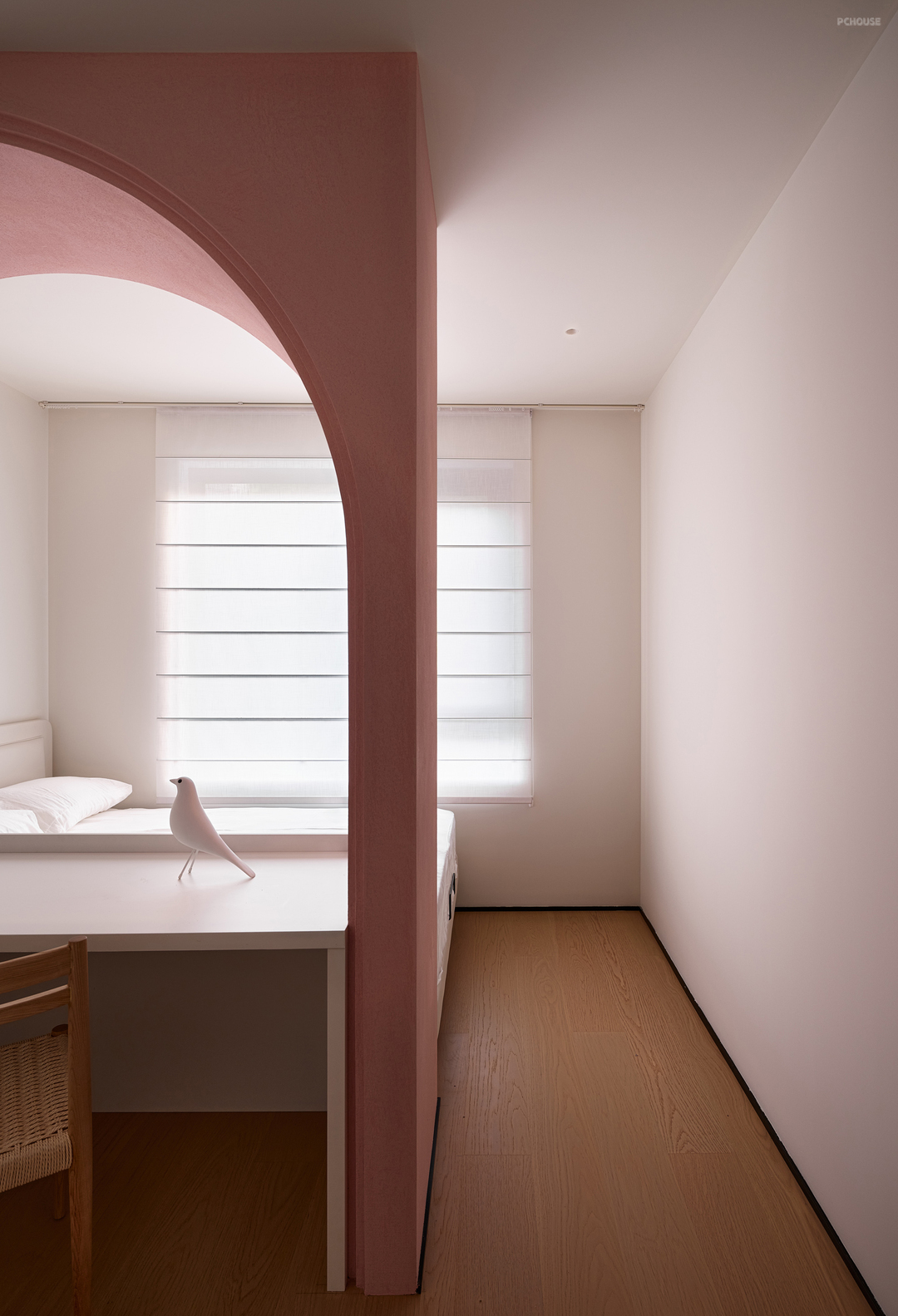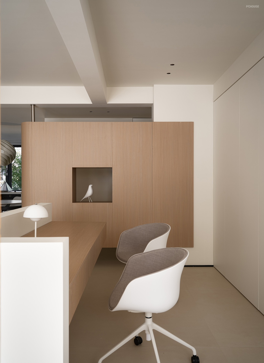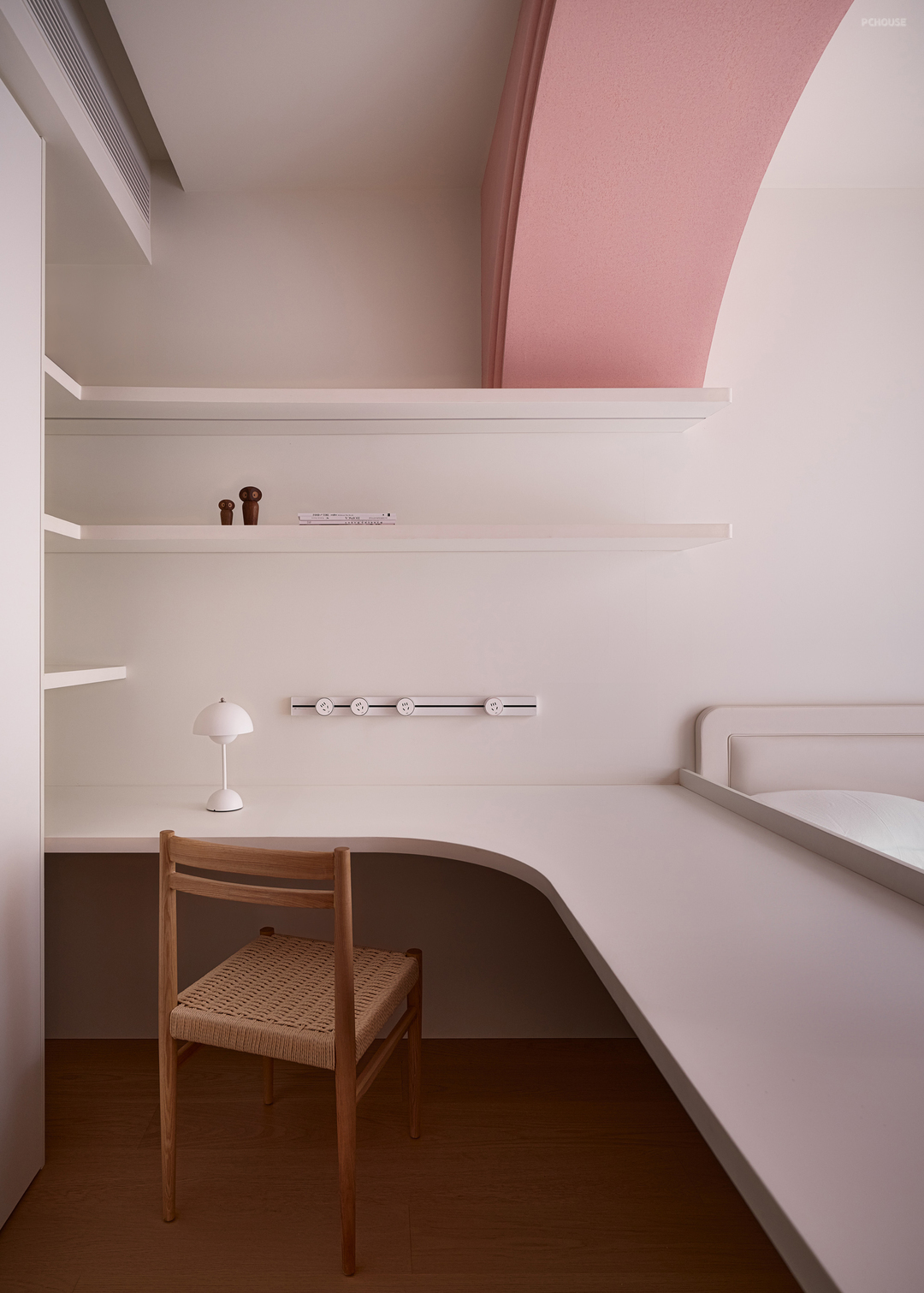书房的色彩搭配延续了客厅的简约雅致风格,以白色和淡木色为主调,营造出一个宁静而舒适的学习和阅读环境。改造后的书房与客厅相连,实现了空间的无缝过渡,既确保了私密性,又不失开放感。在书房的一侧,设计师巧妙地融入了一个白色圆弧格栅设计,软装以白鸽为装饰元素,为这个空间增添了一丝艺术气息,使孩子在学习之余也能享受到艺术的熏陶。
