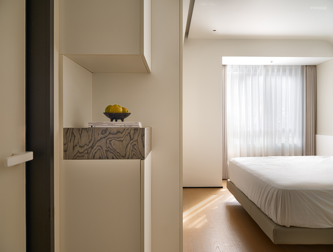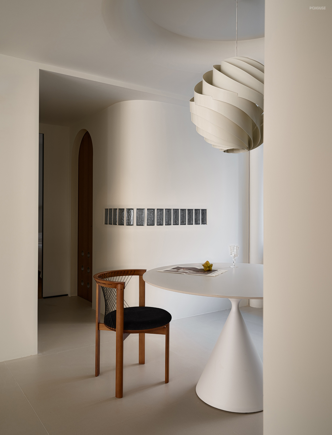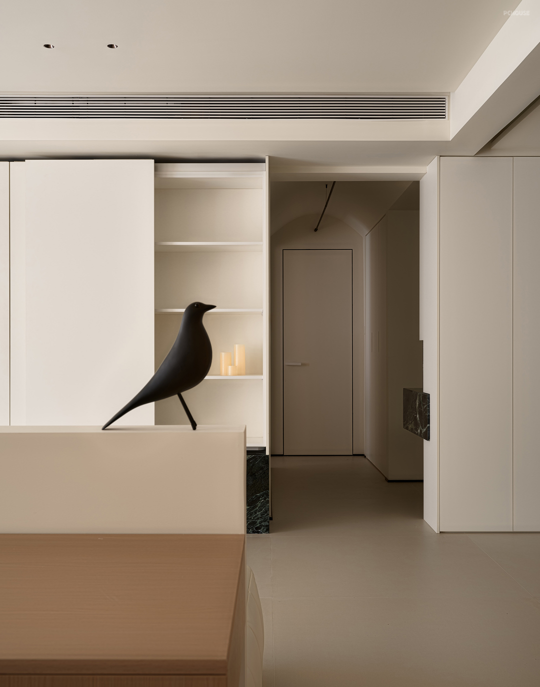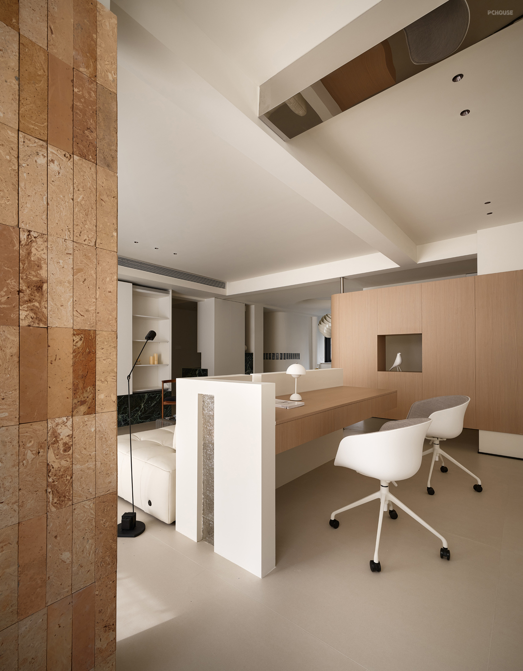 书房的色彩搭配延续了客厅的简约雅致风格,以白色和淡木色为主调,营造出一个宁静而舒适的学习和阅读环境。改造后的书房与客厅相连,实现了空间的无缝过渡,既确保了私密性,又不失开放感。在书房的一侧,设计师巧妙地融入了一个白色圆弧格栅设计,软装以白鸽为装饰元素,为这个空间增添了一丝艺术气息,使孩子在学习之余也能享受到艺术的熏陶。