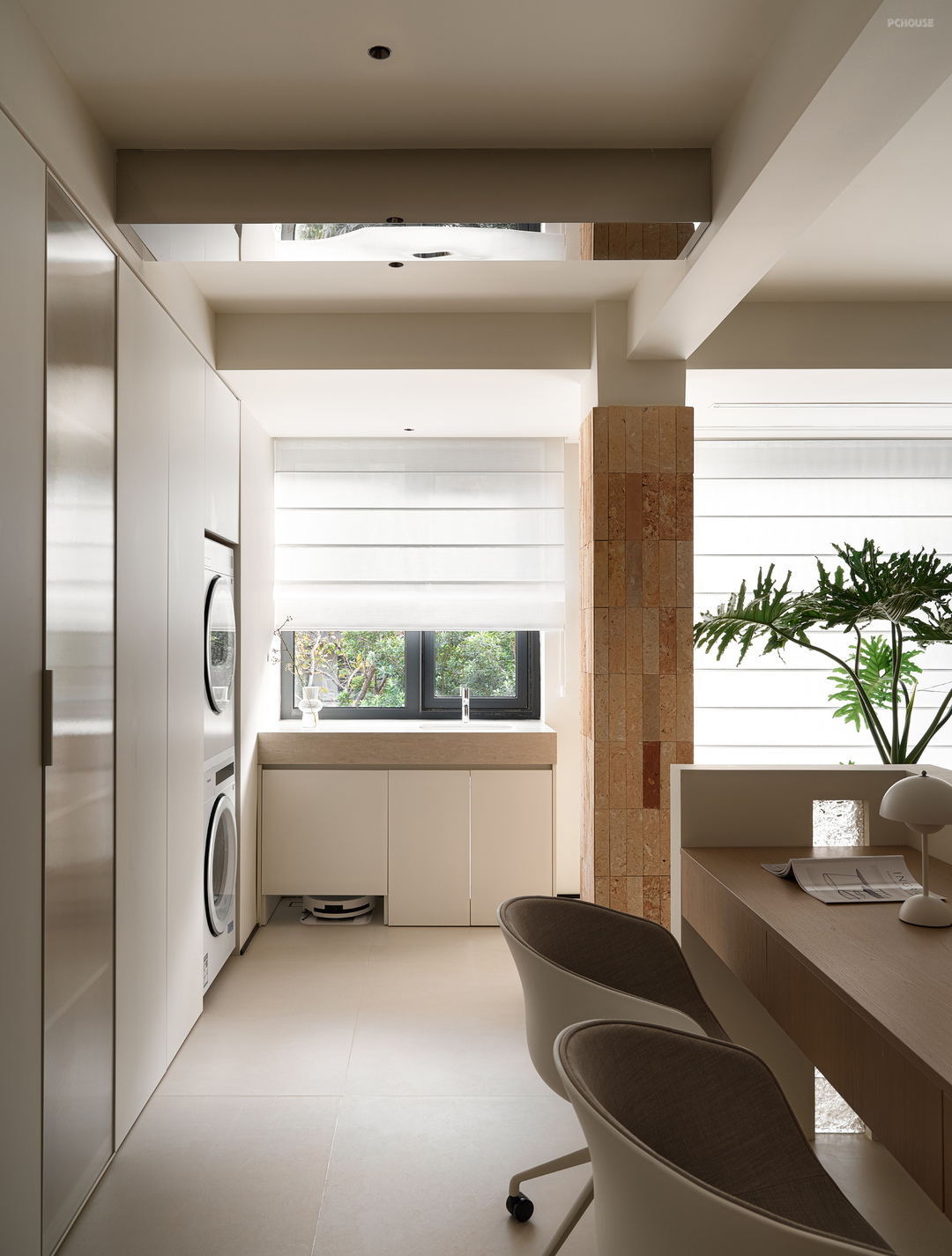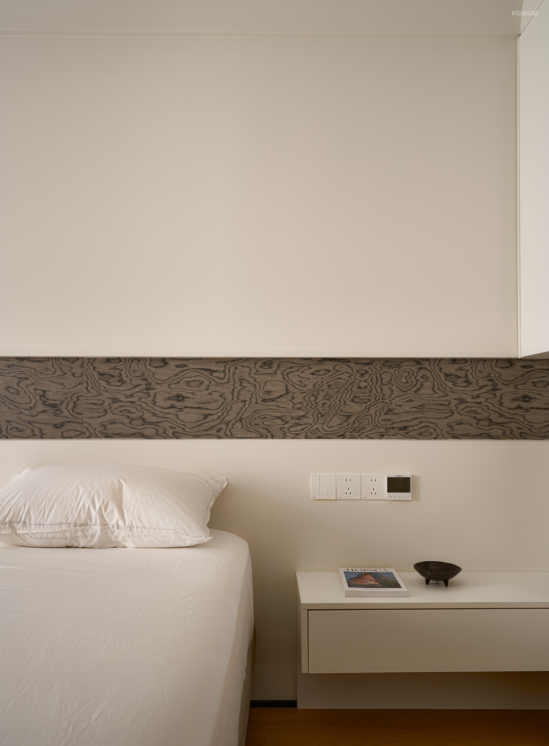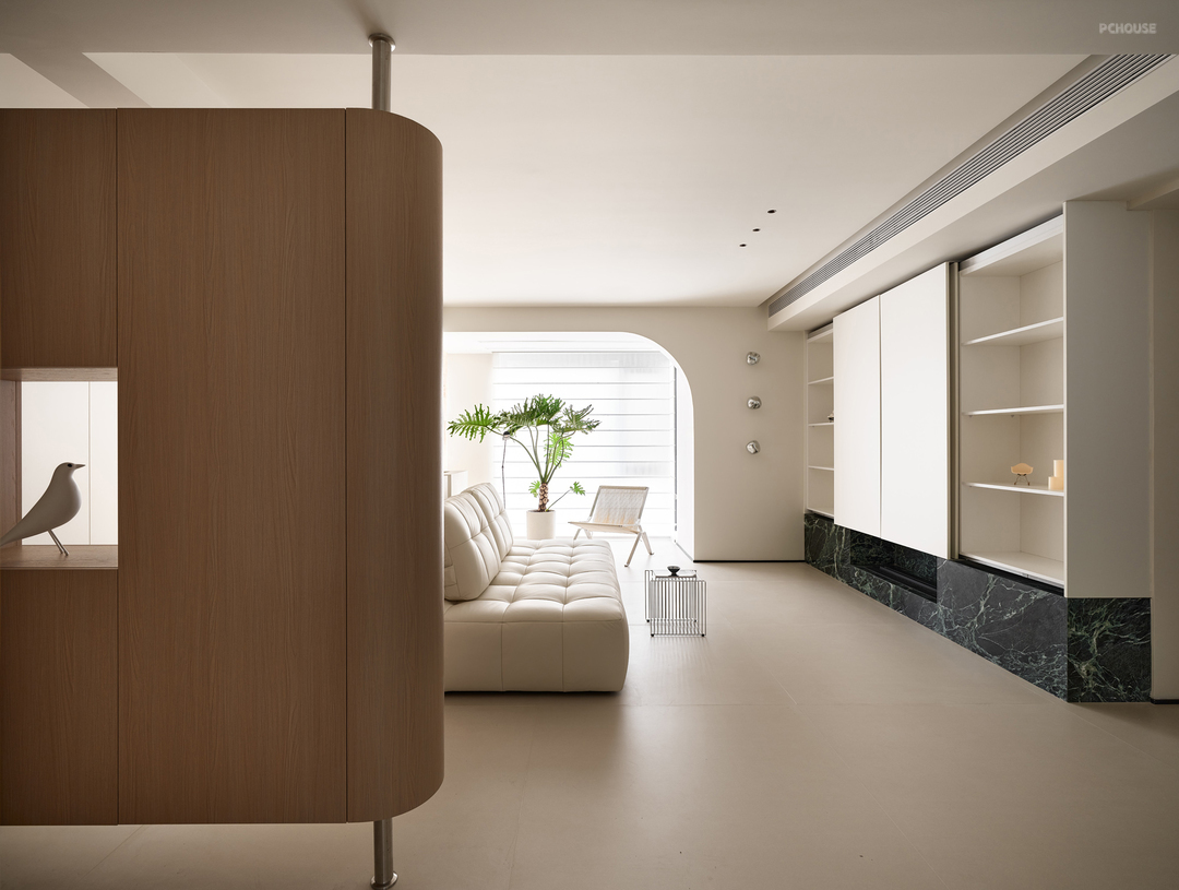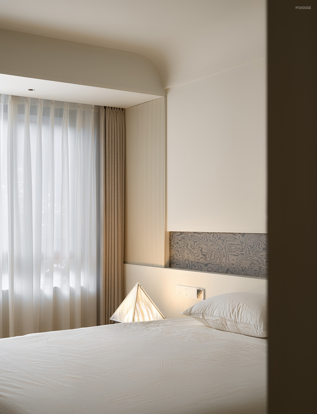 书房的色彩搭配延续了客厅的简约雅致风格,以白色和淡木色为主调,营造出一个宁静而舒适的学习和阅读环境。改造后的书房与客厅相连,实现了空间的无缝过渡,既确保了私密性,又不失开放感。在书房的一侧,设计师巧妙地融入了一个白色圆弧格栅设计,软装以白鸽为装饰元素,为这个空间增添了一丝艺术气息,使孩子在学习之余也能享受到艺术的熏陶。