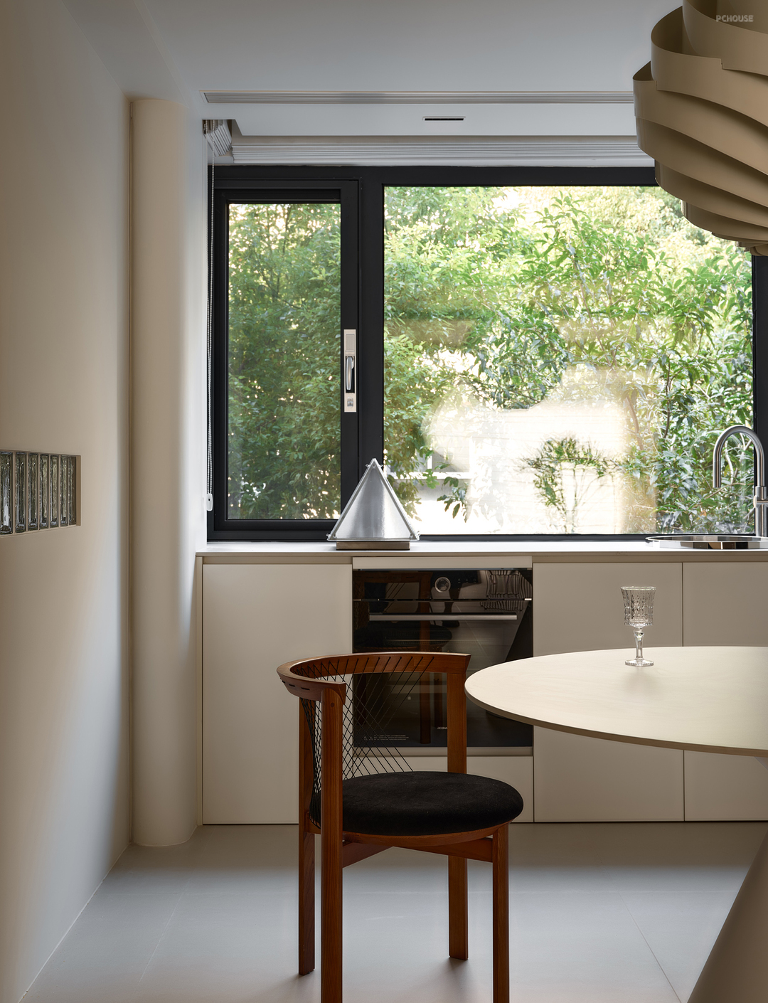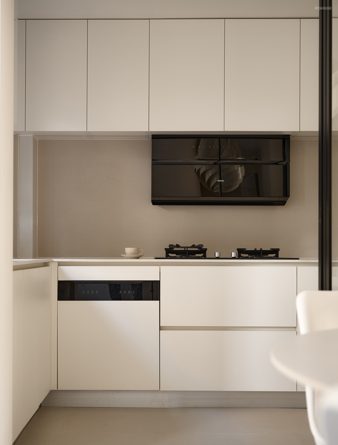 尽管厨房和餐厅位于同一空间内,一个纯白色的厨房确实拥有极强的治愈效果。厨房内部布局简洁而有序,纯白色的橱柜和墙面不仅让整个厨房看起来更加宽敞明亮,还带来了一种清新脱俗的感觉,仿佛能够瞬间治愈人们心中的疲惫和烦躁。