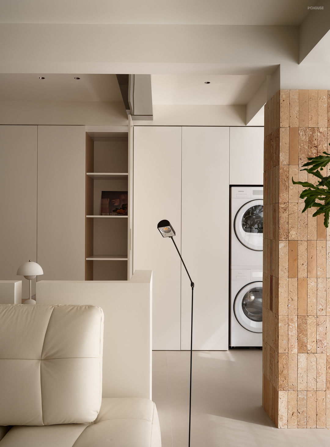 家中的每一根线条,每一根柱子都不是“孤单”的存在的,它们之间都有着紧密的联系。客厅中这根特别的柱子,设计师希望将其保留下来!让空间回归原始感!因此设计师特地选用采用天然手工陶土砖做成的。砖块表面呈现自然的纹理和大地色系的天然质感,每块砖纹理的差异性赋予了整个空间一种“呼吸感”,从而营造出一个自然且舒适的生活环境。