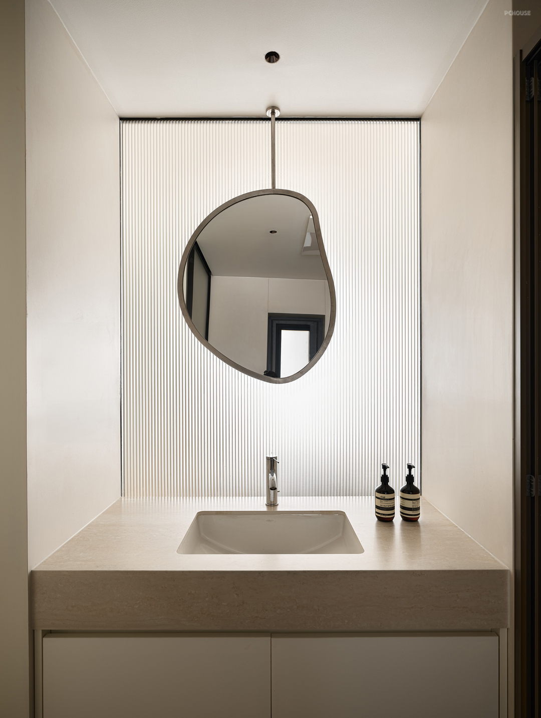 原先的圆形餐桌用餐区域,与卫生间干湿区形成两个90°的对角,用餐体验并不理想。因此,设计师对玄关与餐厅的连接处进行了精心的布局调整。他们引入了流线型的设计元素,使得从玄关进入餐厅的动线更加流畅自然,减少了直角转弯带来的生硬感。同时,餐厅区域采用了柔和的灯光设计,营造出温馨舒适的用餐氛围,进一步提升了用餐体验。
