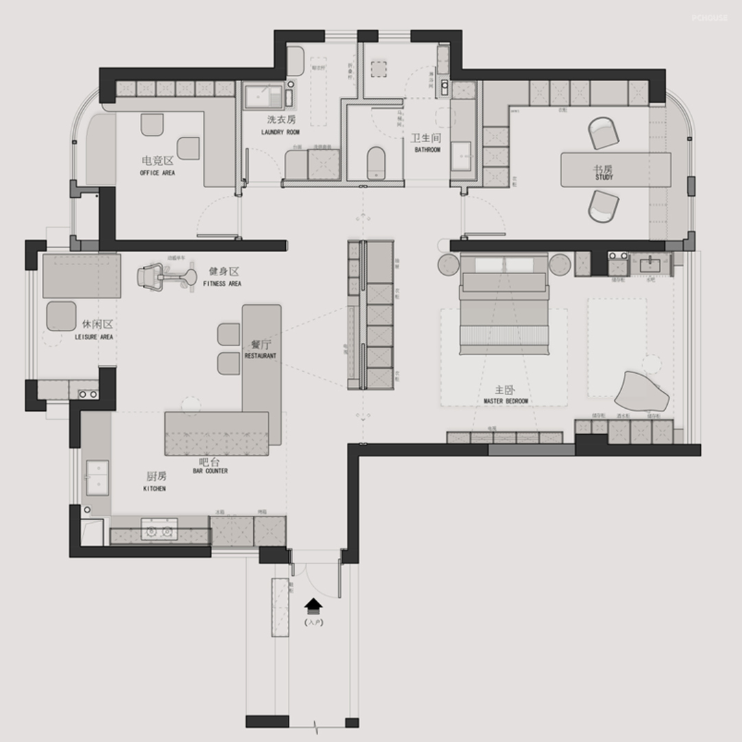 平面布置图:1.玄关:增加洞洞板与全身镜组合,增加进出户的场景功能;顶部改为悬浮顶+无主灯,提升视觉轻盈感。??2.LDK客餐厨一体:吊顶斜顶设计化解全屋最低梁,吊顶内置中央空调和新风系统,减少日常开窗通风频次,进一步减少灰尘;增设岛台与餐桌L形组合,形成洄游动线,去客厅化设计增强空间灵活性。??3.主卧套间:原客厅改为主卧,双口袋门连通公区,引入江景,打造更为灵活多变的休憩空间。??4.书房(多功能房):整合衣帽间、书房与茶室,优化功能融合与收纳布局。??5.电竞房:设计L形悬浮桌与一字型书柜,结合原木窗框,最大化利用景观与空间。??6.卫浴:改为四分离设计,提升功能独立性与使用效率。??7.洗衣房:原次卫改为独立洗衣房,内置扫拖机器人自动上下水基站(离家自动扫拖)、洗烘套装、独立台面私密洗衣机、晾晒衣架和洗衣池,优化功能与动线。