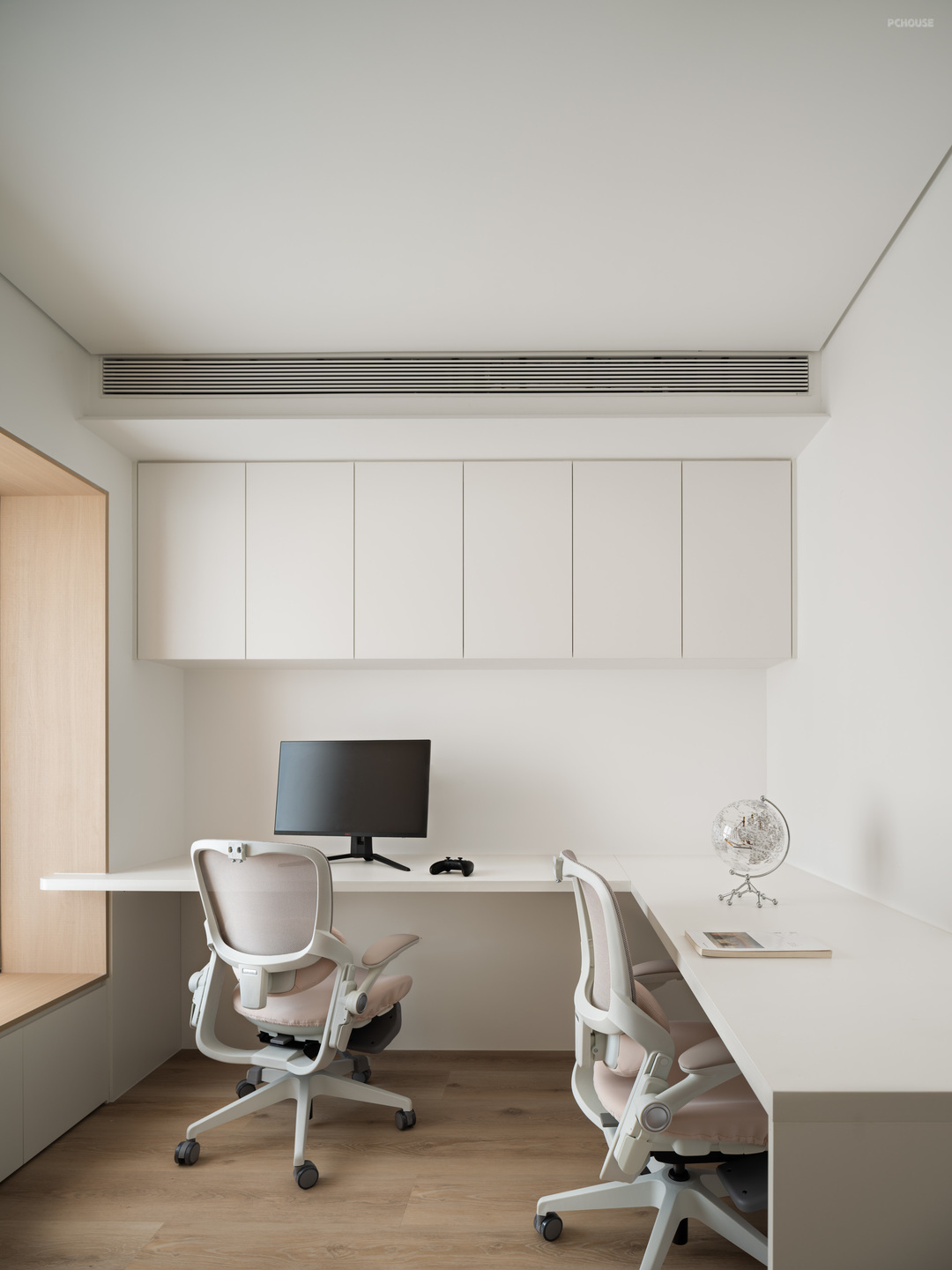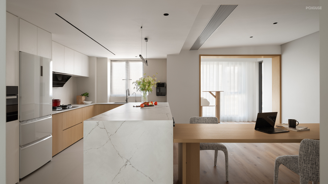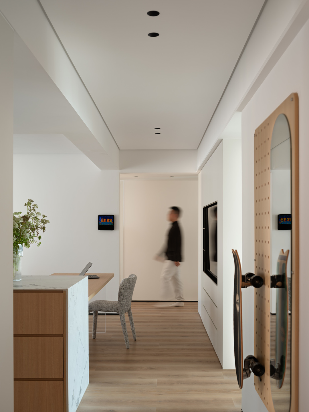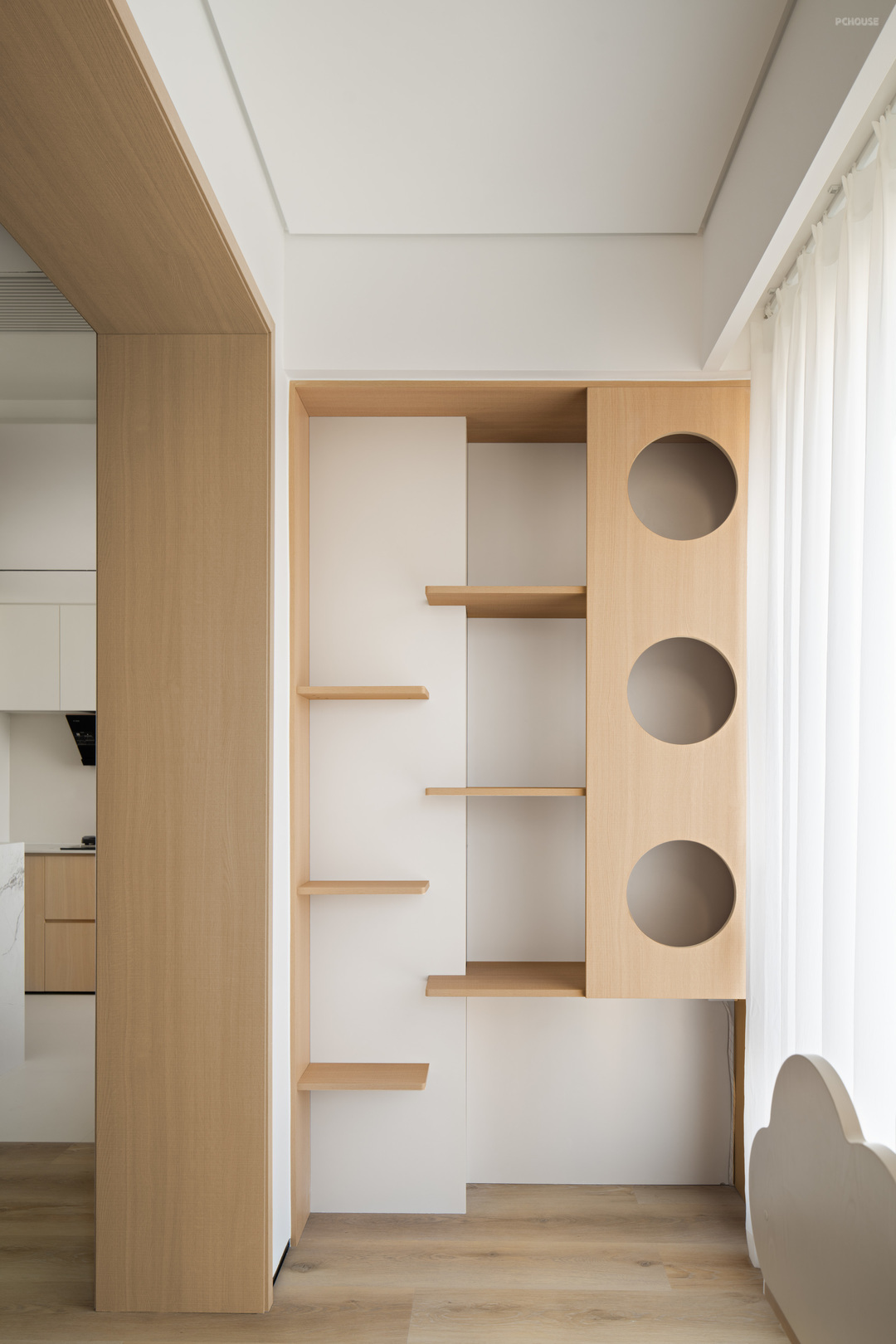 前言: 本案业主是一对年轻情侣,养了一只橘猫主子,想要一个原木柔和、温馨简单的家。喜欢彼此间能够随时互动交流,接受开放式厨房和去客厅化设计理念;想要一间能够满足两人同时开黑的独立电竞房、一间满足1-2人办公的书房,需有供宠物自由活动的空间;还有充裕的储物空间;需要减少人工打扫或清洁的频次。