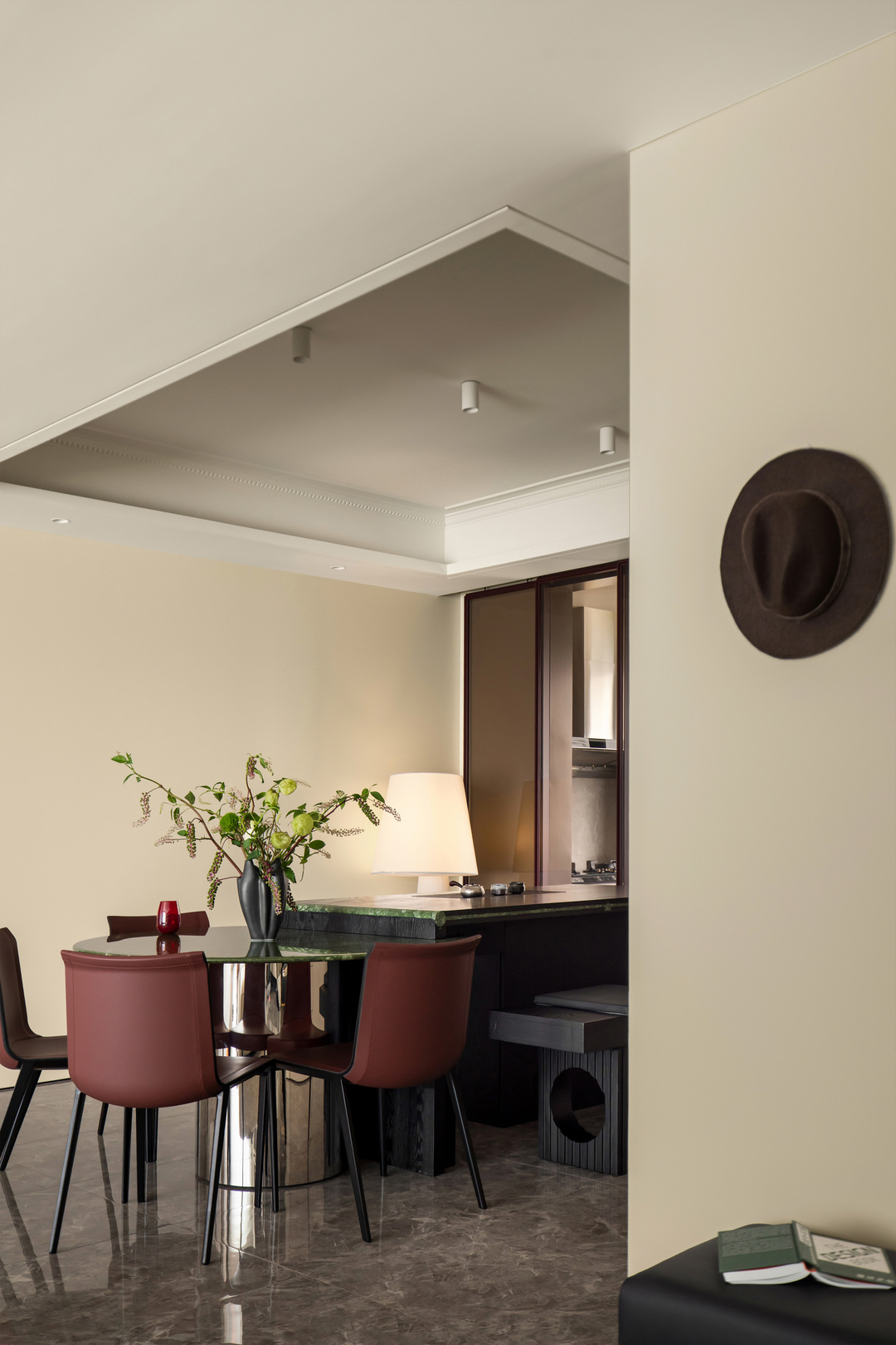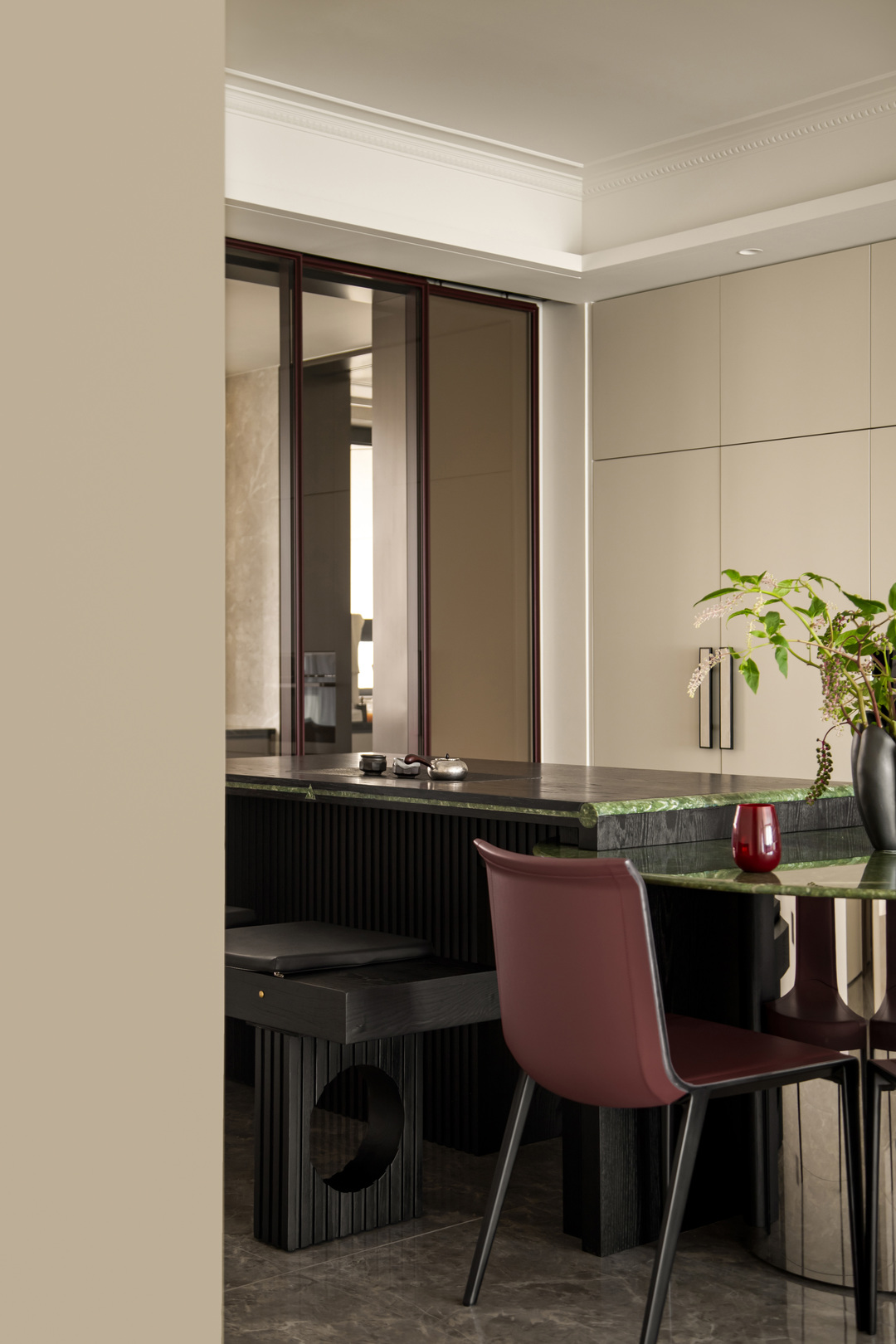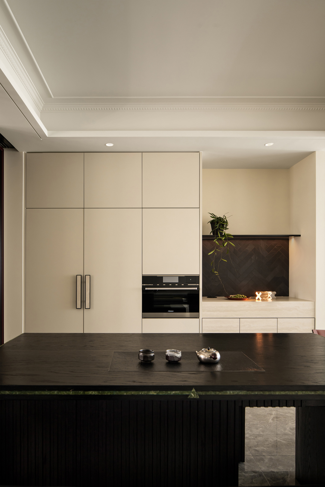 屋主不常做饭但需要有厨房的功能,多功能的岛台,让餐厨不再只是传统意义上的用餐场所,它是一个交流情感的空间,满足多场景的需求,三五好友、亦或夫妇二人,烹茶而语间,共得一方自在天地。