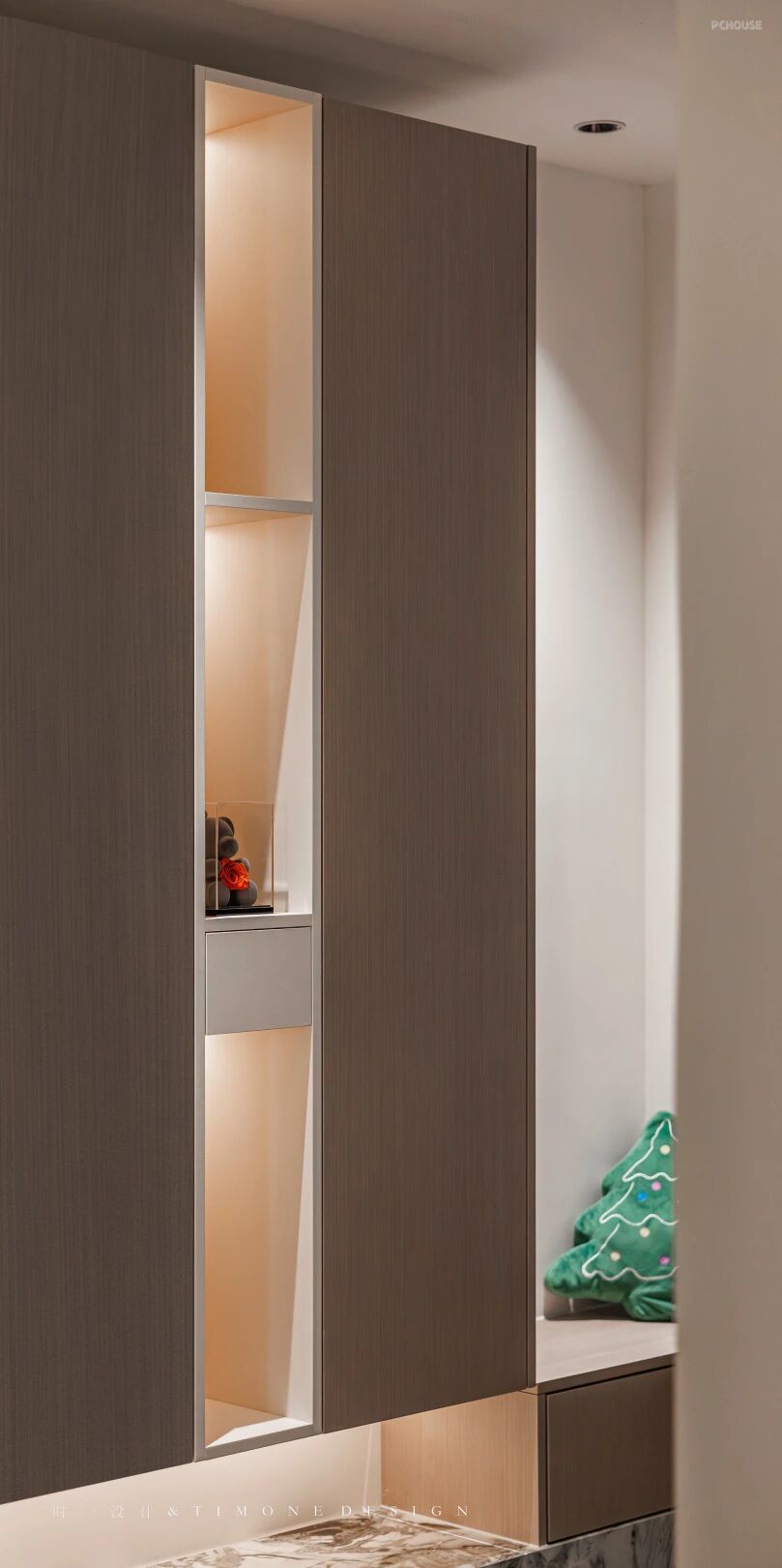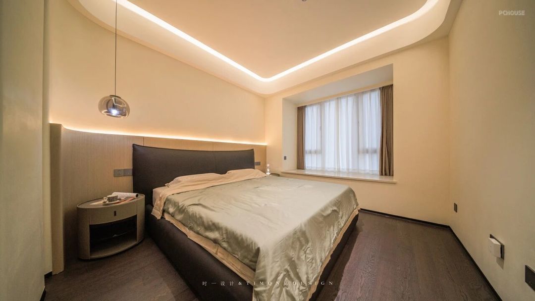 主卧以大地色木饰面为基调,加以氛围灯光衬托,使得整个卧室都变得轻松温馨起来。