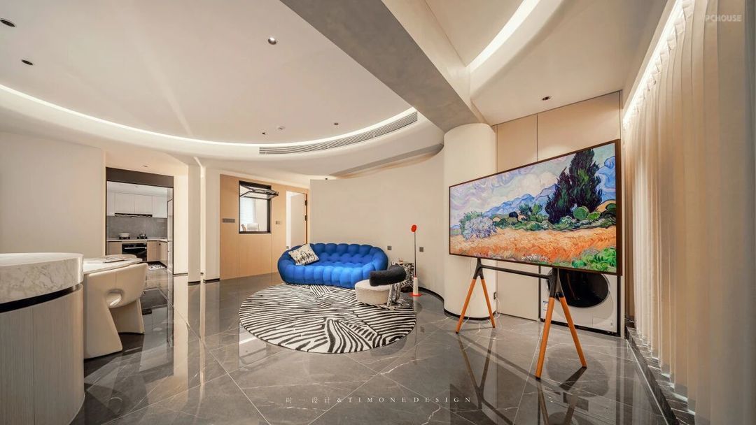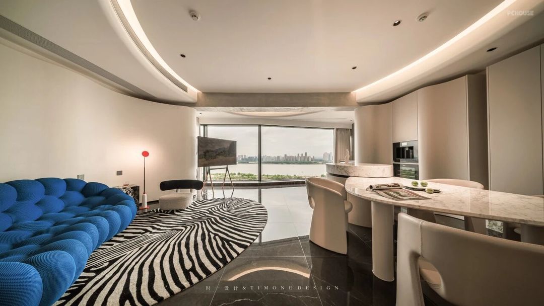 客厅与开放式餐厨空间贯通一体,天花板以圆润的弧线勾勒,几何线条交错,勾勒出层次丰富的空间感。