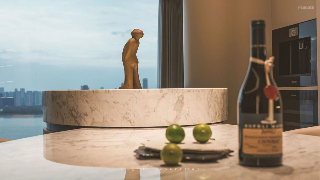 异形的白色餐桌与吧台搭配,使整个空间的色调明亮而又高级,营造出一种既现代又温馨的氛围。