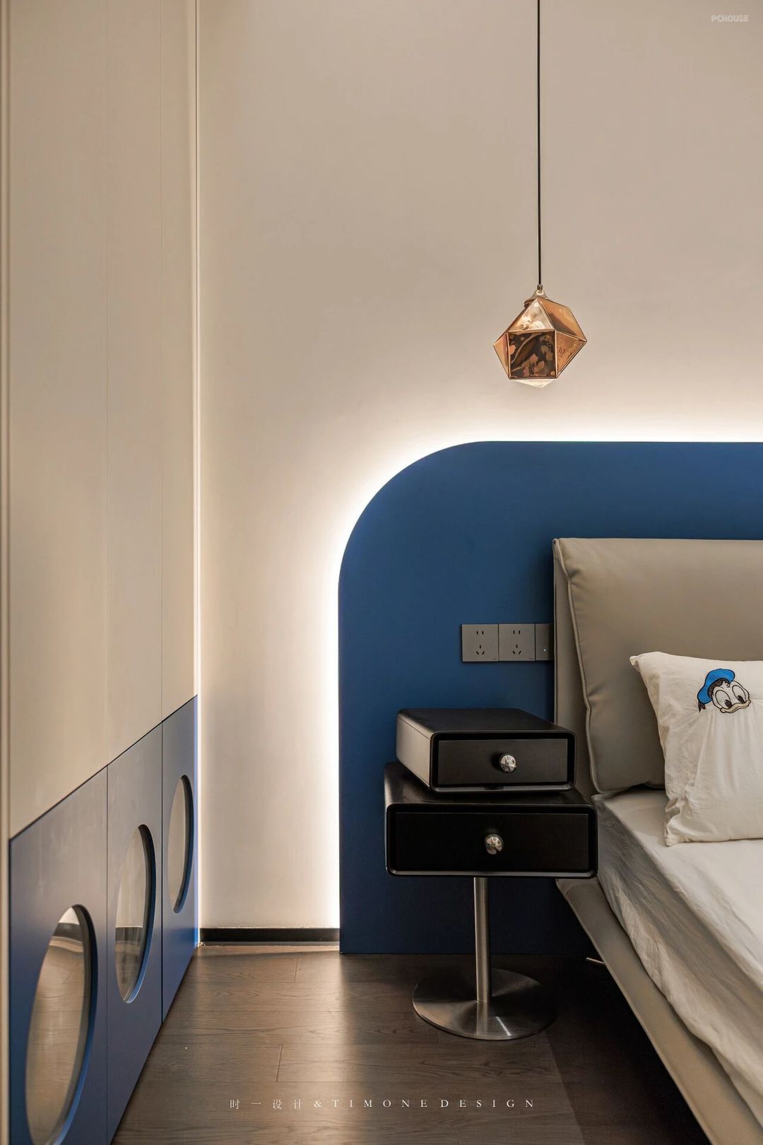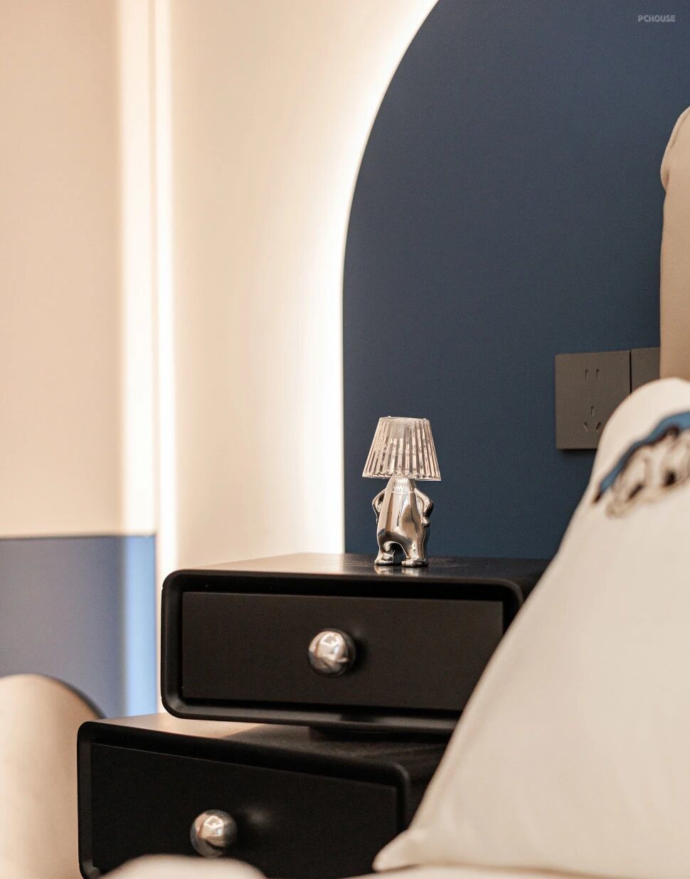 床头背景与天花板都是弧形有种被包裹的感觉使空间线条更加流畅,让整个卧室显得更加柔和、温馨。