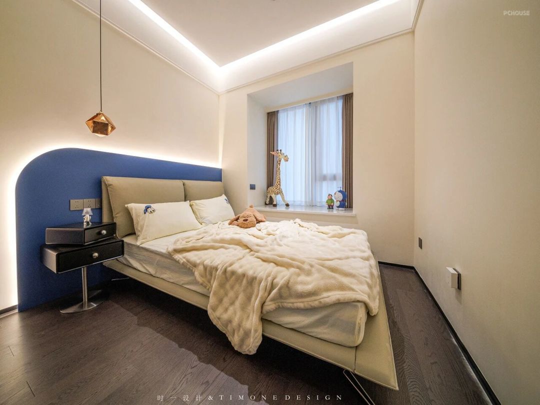 大地色与蓝色的组合,既符合儿童对自然的亲近感,又通过简约设计赋予空间长久生命力。