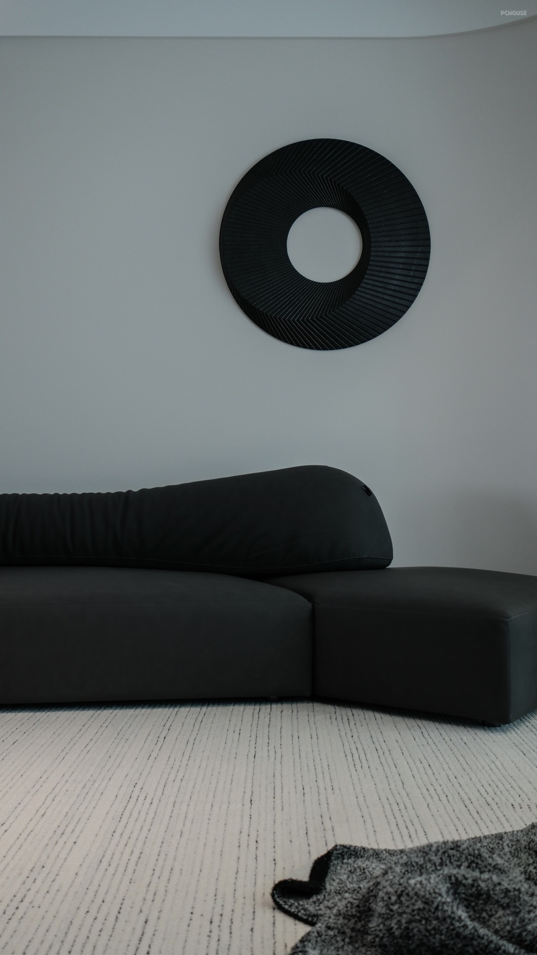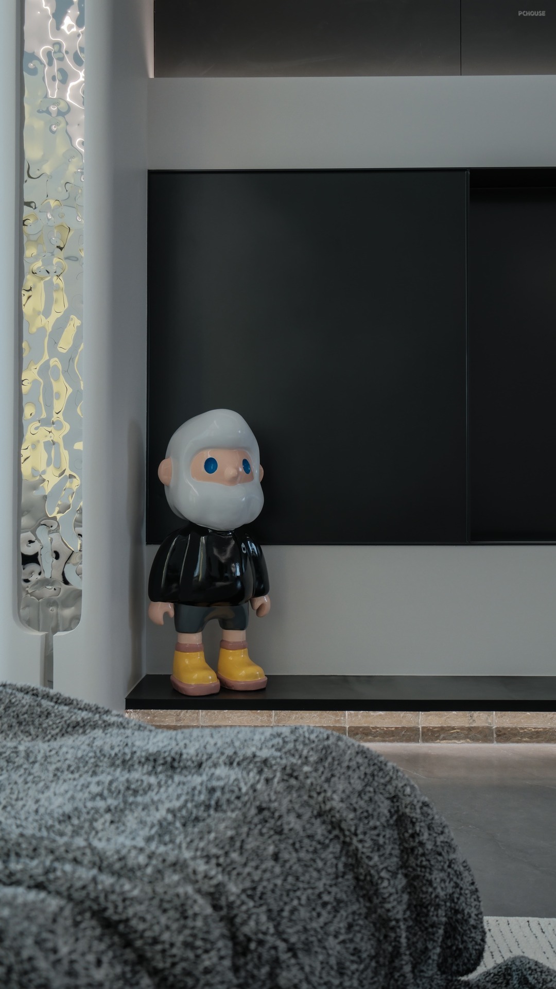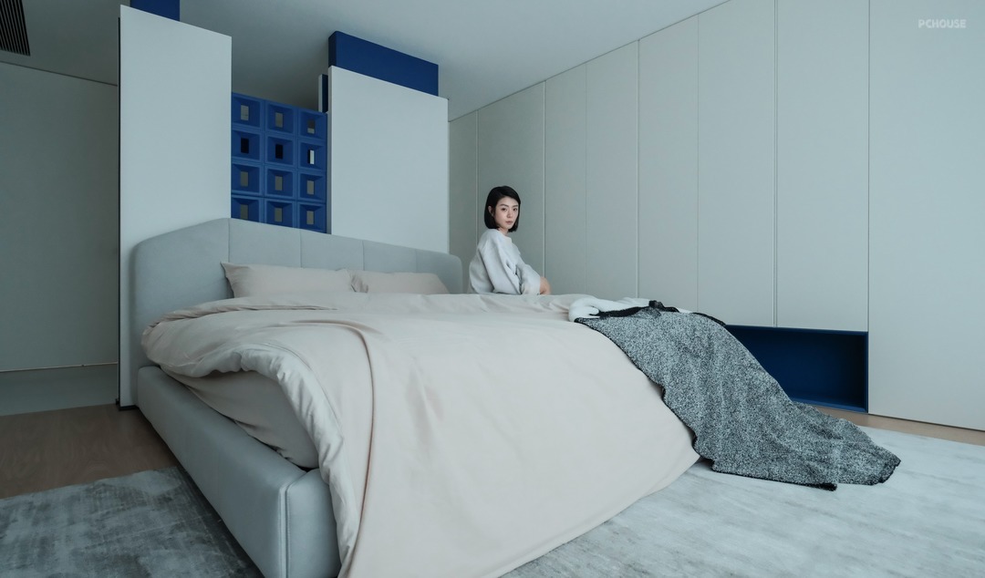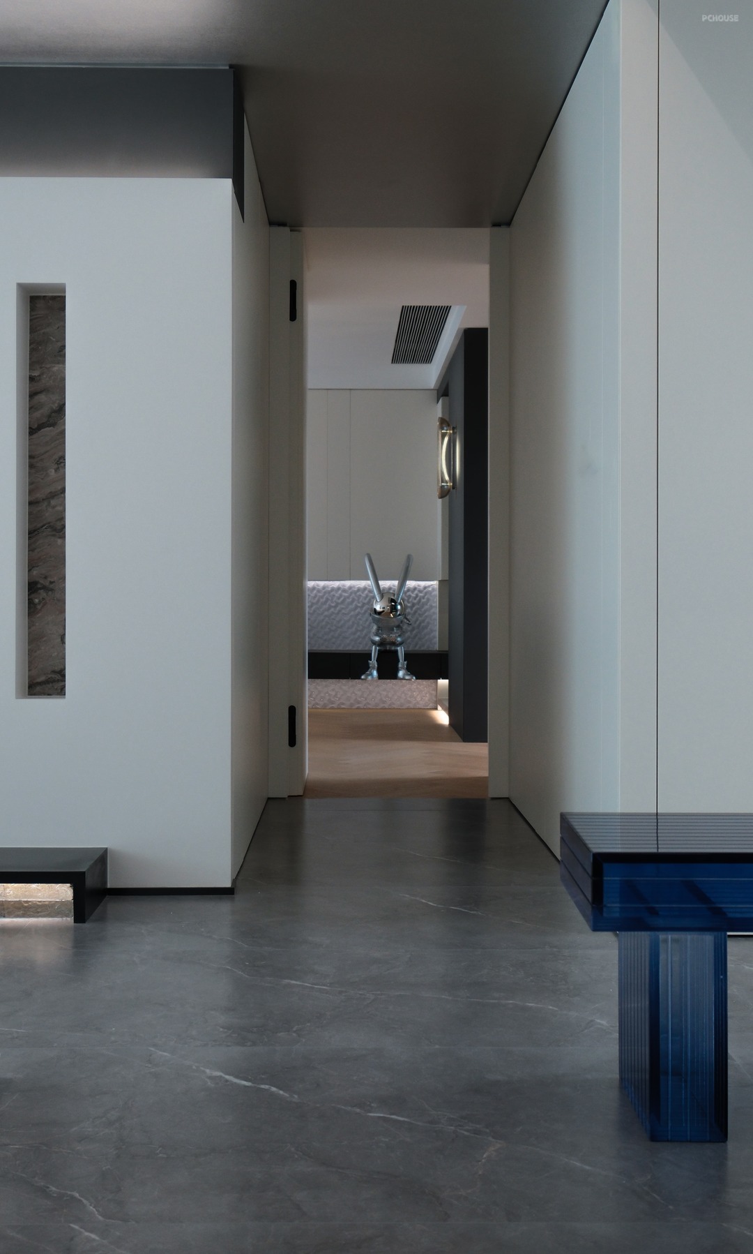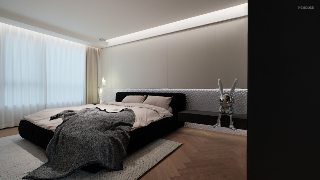 深海辽阔而不语,散发出一种幽深的静谧。推开海洋之门,弧形沙发如海浪翻涌,异形壁灯如水滴相汇,配合灯光的运用,赋予整个主卧以生命的灵动与自由。床头半腰屏采用透光水波纹亚克力,宛如打碎的余晖,呈现出璀璨的星河,仿佛置身于波光粼粼的海面。