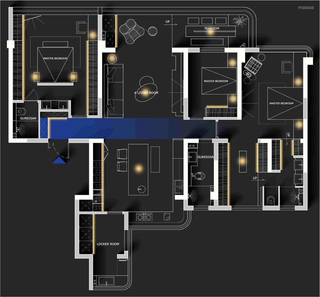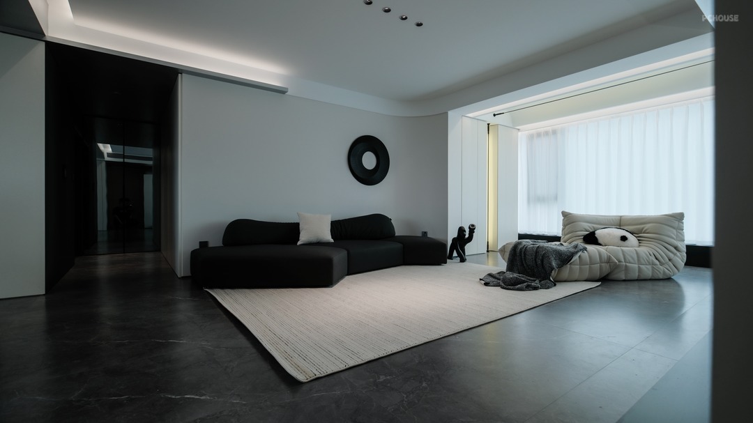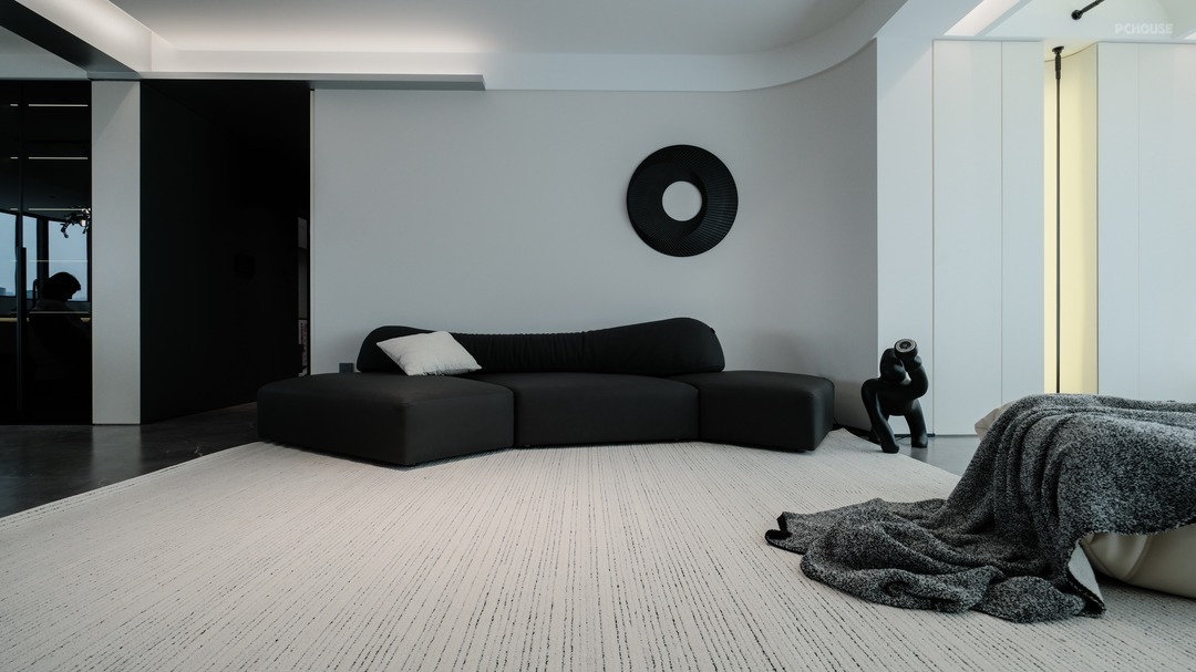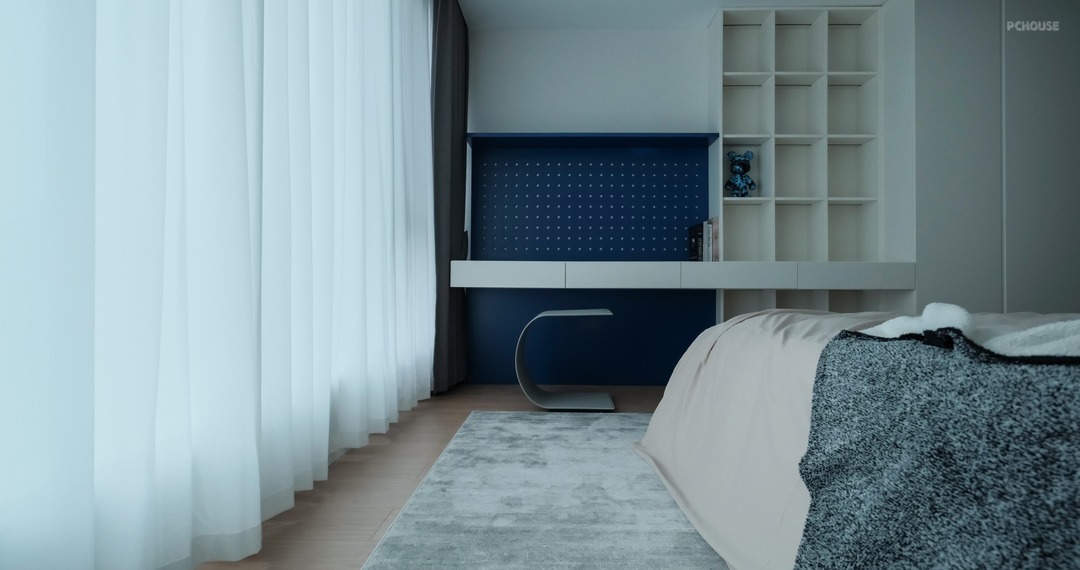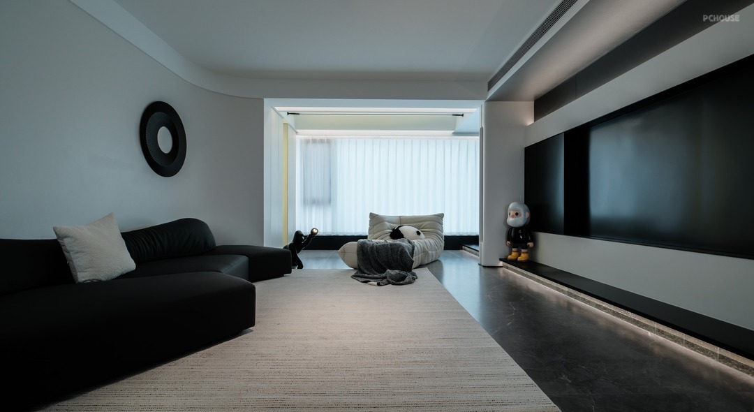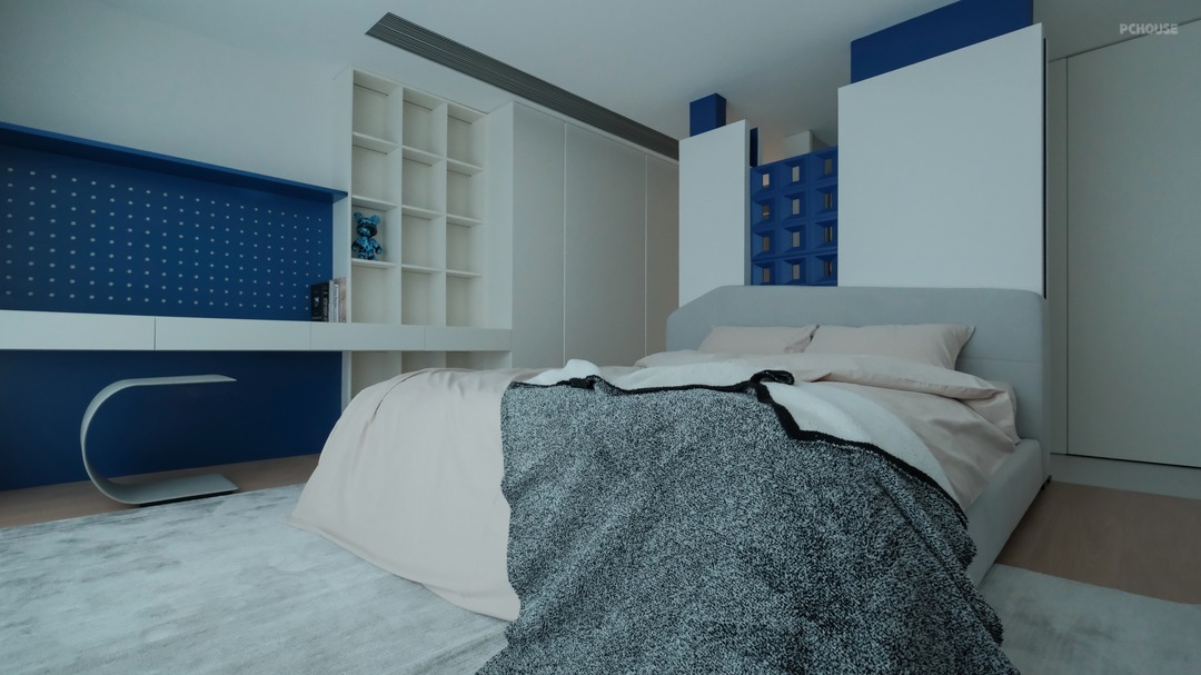 深海辽阔而不语,散发出一种幽深的静谧。推开海洋之门,弧形沙发如海浪翻涌,异形壁灯如水滴相汇,配合灯光的运用,赋予整个主卧以生命的灵动与自由。床头半腰屏采用透光水波纹亚克力,宛如打碎的余晖,呈现出璀璨的星河,仿佛置身于波光粼粼的海面。