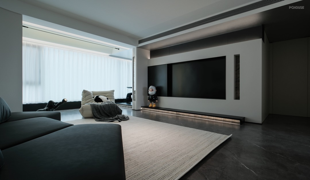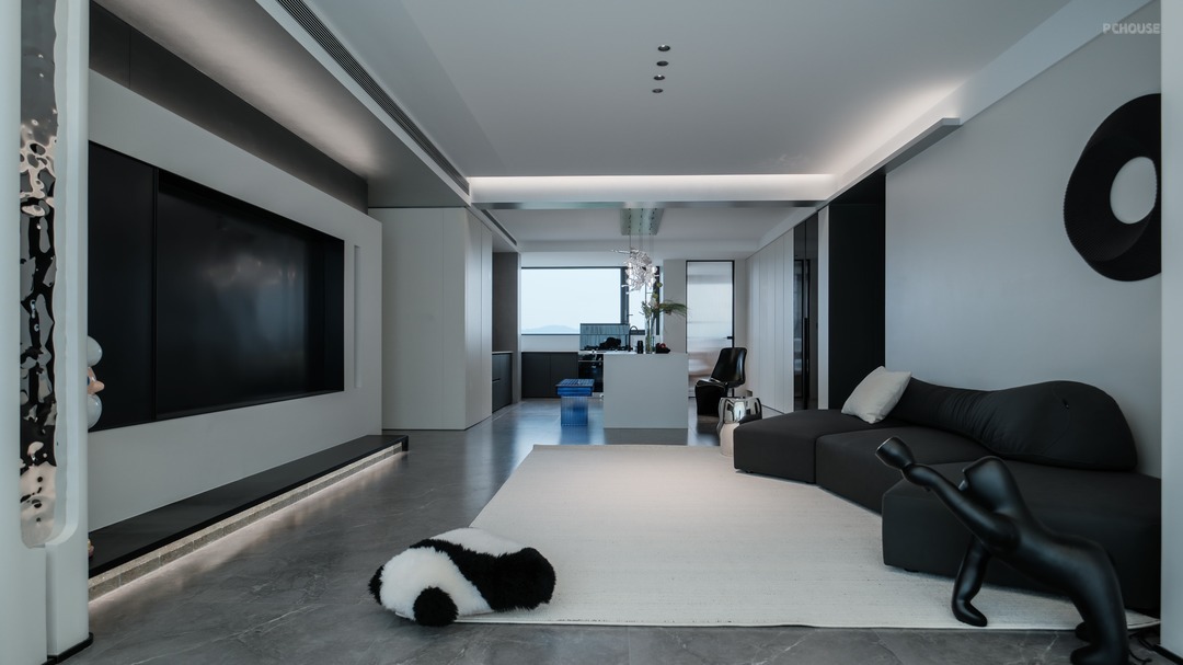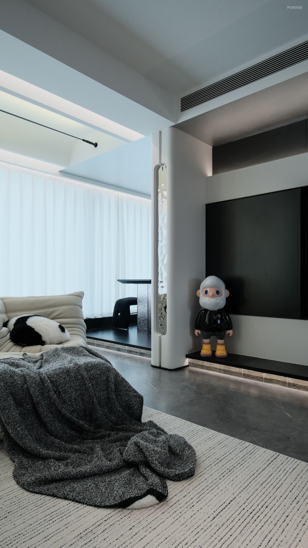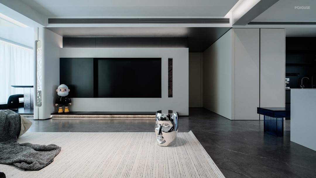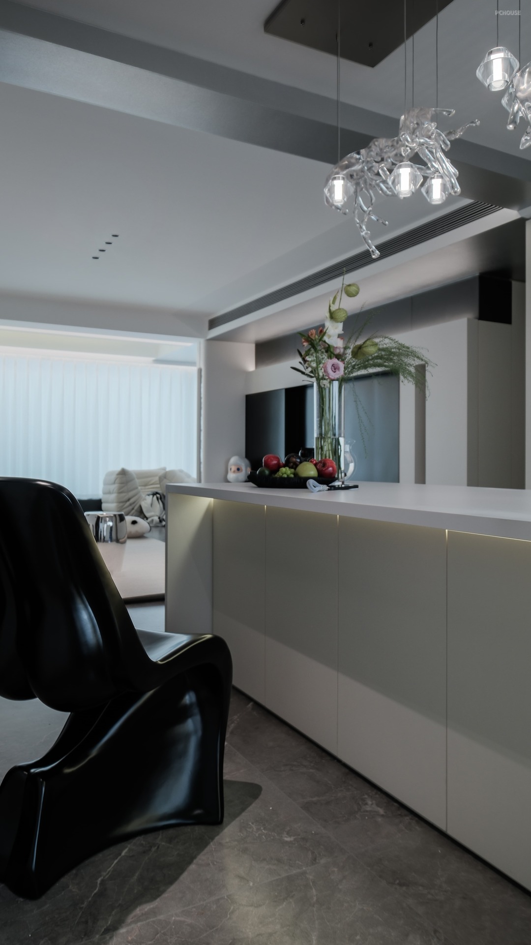 电视背景墙顶部采用镜面不锈钢设计,借助不锈钢的漫射,营造出似水波荡漾的海底世界。底部采用透光玻璃砖,搭配光源点缀,一虚一实之间,徐徐勾勒出包裹在水光中的柔和空间。