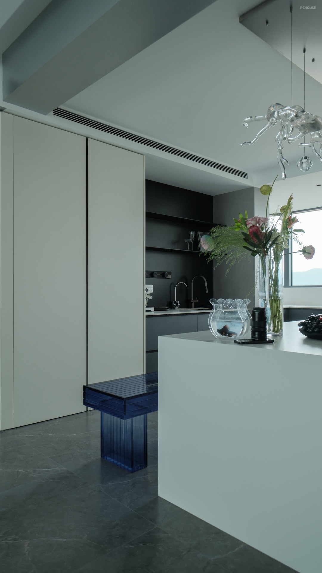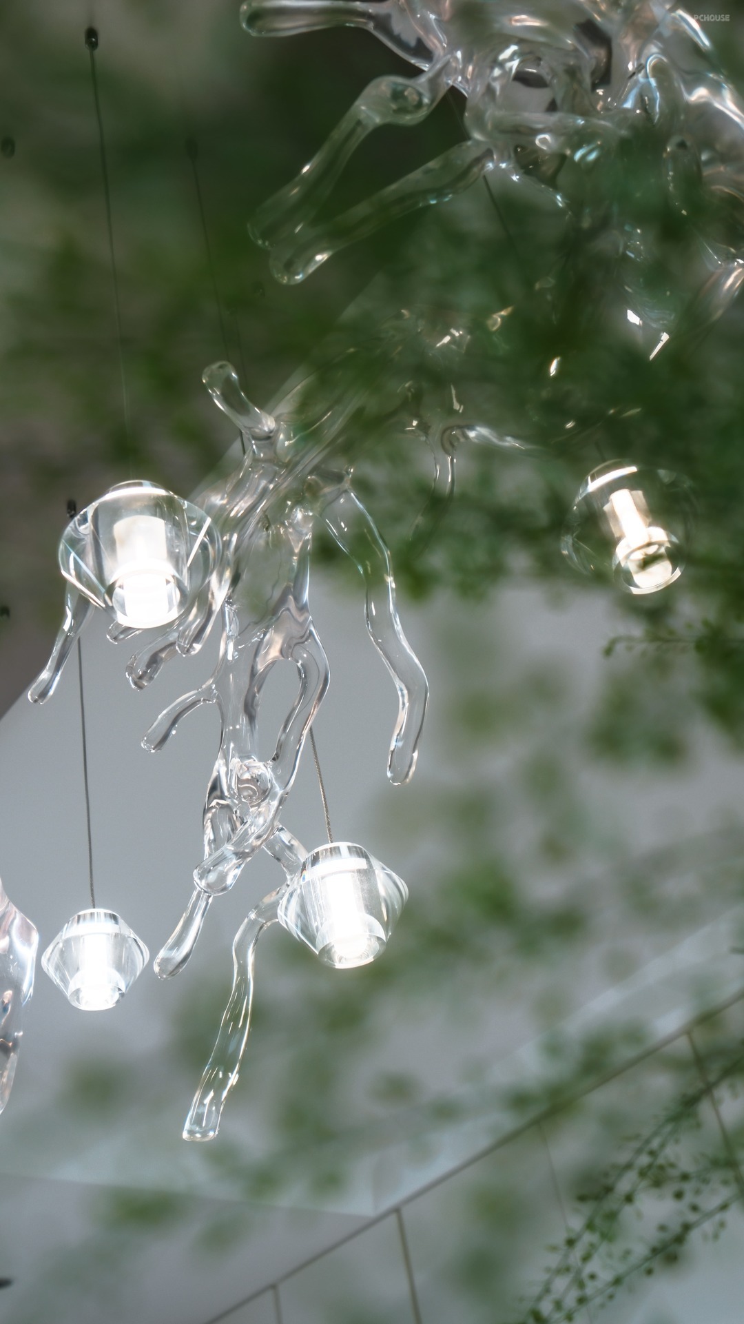 开放式的布局与低饱和度的色彩搭配,为餐厅增添了多种视觉的感官体验,海浪形态的吊灯似浪花在海里凝结、汇聚,在奔涌中壮大,在礁石上消散。阳光洒碎一地,与蓝色通透的长椅交相辉映,浮光掠影般的生活发生的浪漫且肆意。