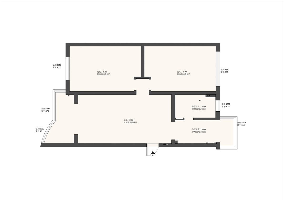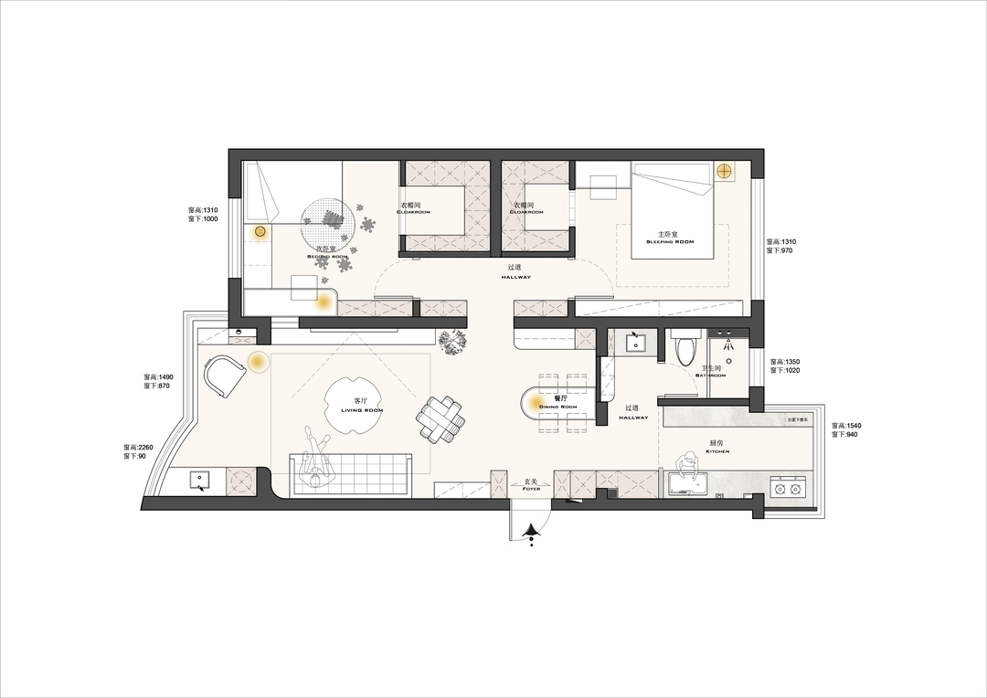 4、分别将两个卧室房门内推,为过道空间植入储物,并增加了两个衣帽间。