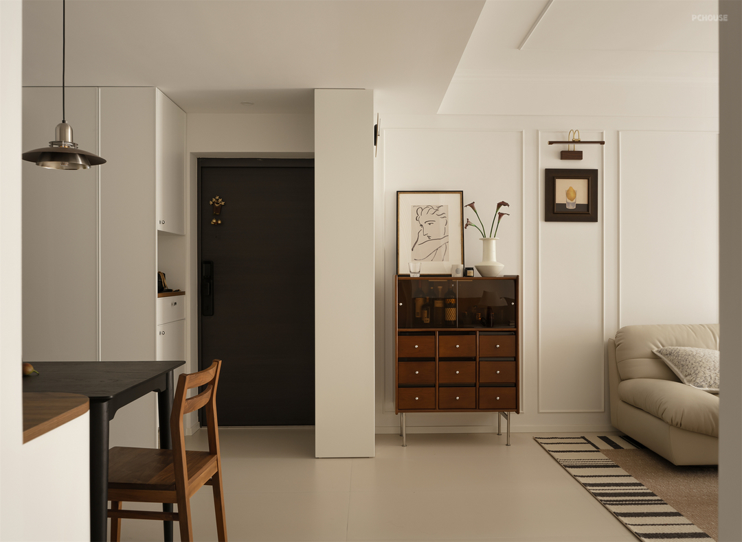 当空间变得更加清爽规整,不同空间之间的界限更加模糊之后,即便增加了一组玄关柜,压缩了物理尺寸之后,视觉上餐厅空间却不减反增,空间感被放大。