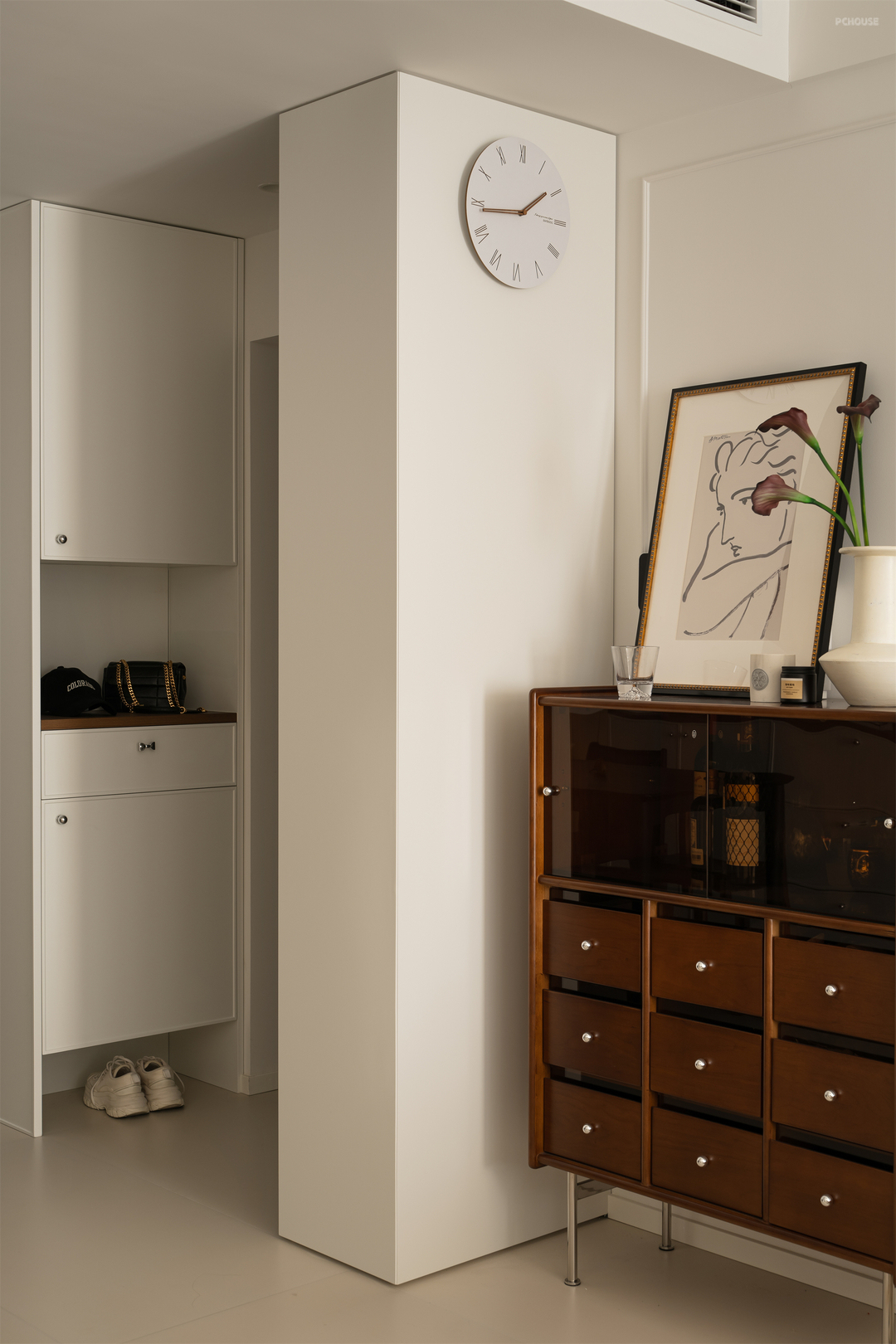 厨房推拉门内推后,释放出更多过道空间,保留一部分空间放置冰箱以及作为厨房收纳的补充,另一部分作为玄关柜使用。同时和客厅之间也增加一组高柜,既是为了增加储物量,也是出于提升隐私性的考虑。