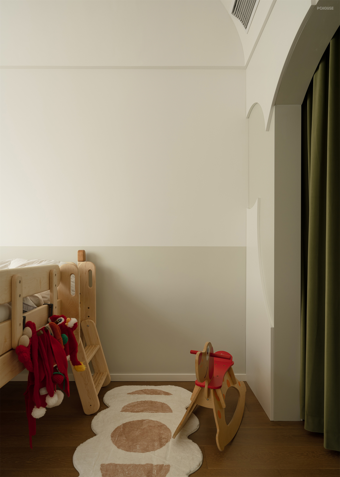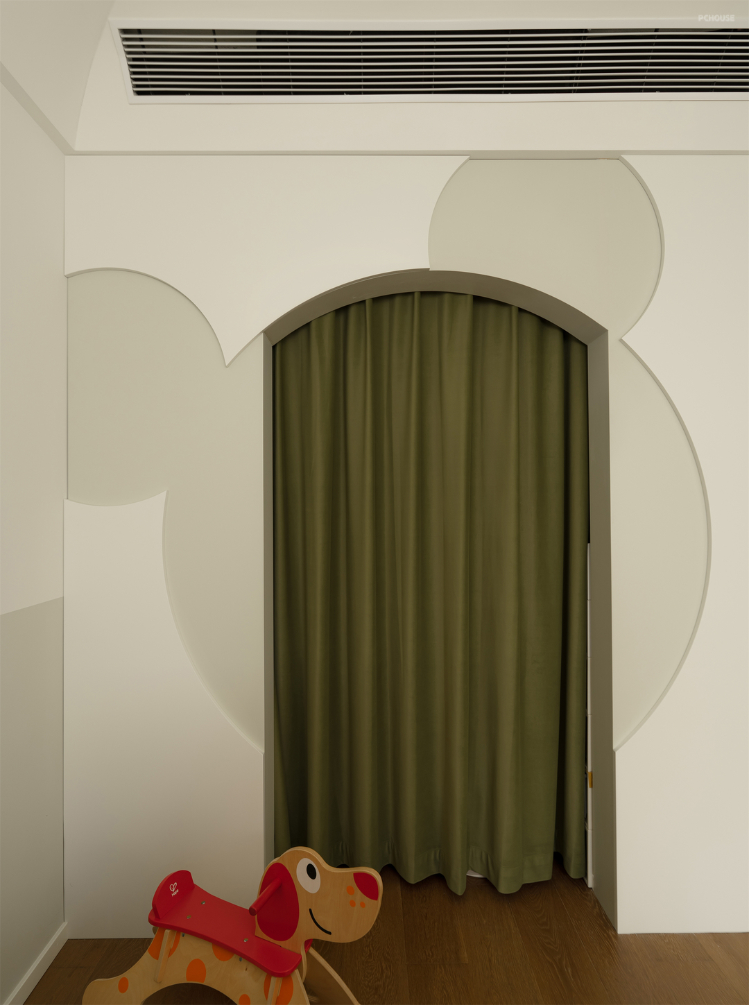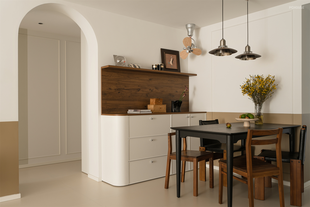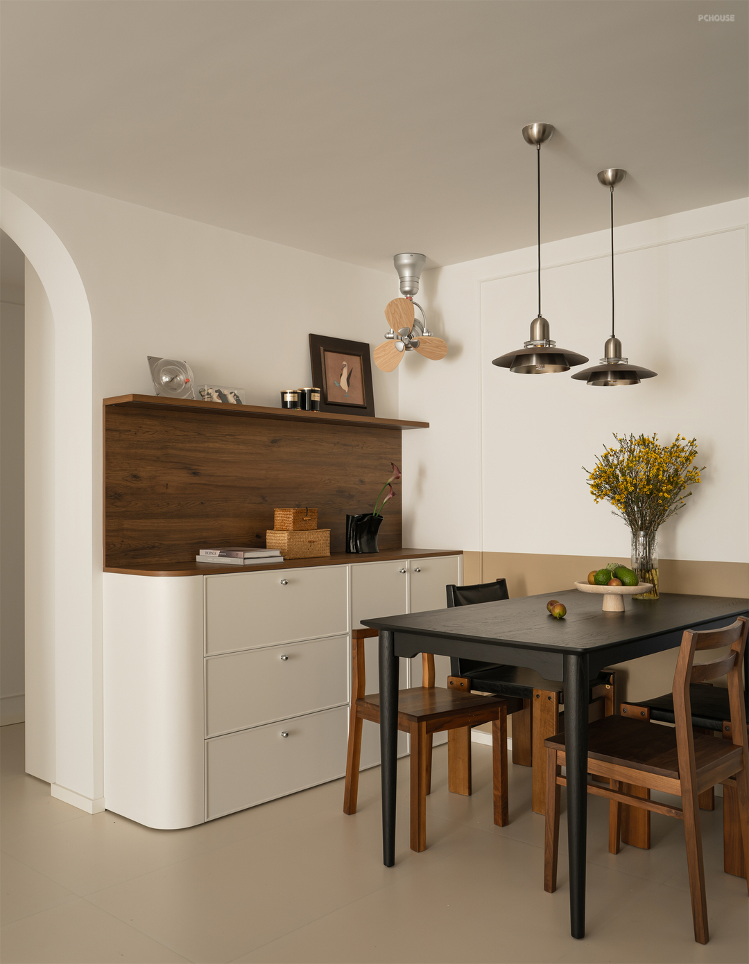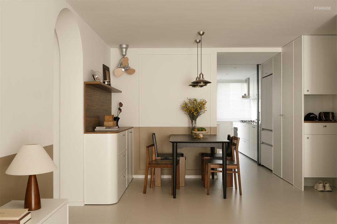 餐边柜与涂料分色高度一致,客餐厅之间门洞设计成拱形,是为了让空间自然过渡有延续性。过道侧弧形处理,规避磕碰风险;实木台面上返延伸出隔板架,丰富收纳形式。