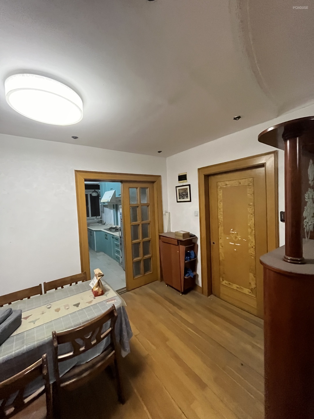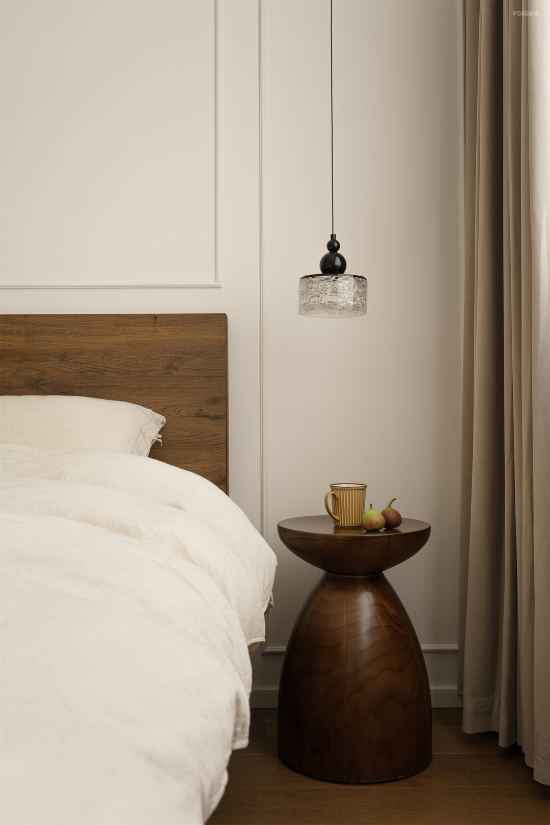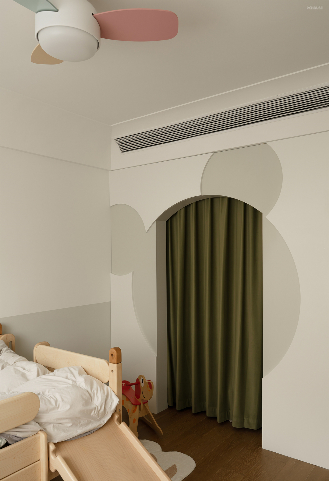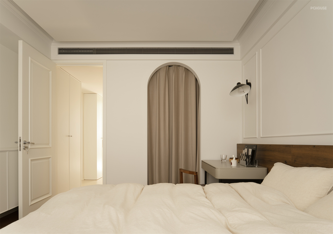 餐边柜与涂料分色高度一致,客餐厅之间门洞设计成拱形,是为了让空间自然过渡有延续性。过道侧弧形处理,规避磕碰风险;实木台面上返延伸出隔板架,丰富收纳形式。