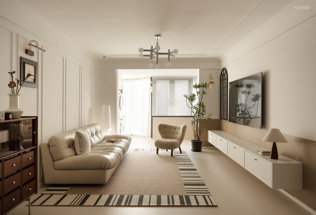 当阳台成为了客厅的拓展空间,某种程度上分散了客厅的收纳压力,一组悬浮电视柜和成品实木柜解决储物需求,让客厅得以最大化舒展。