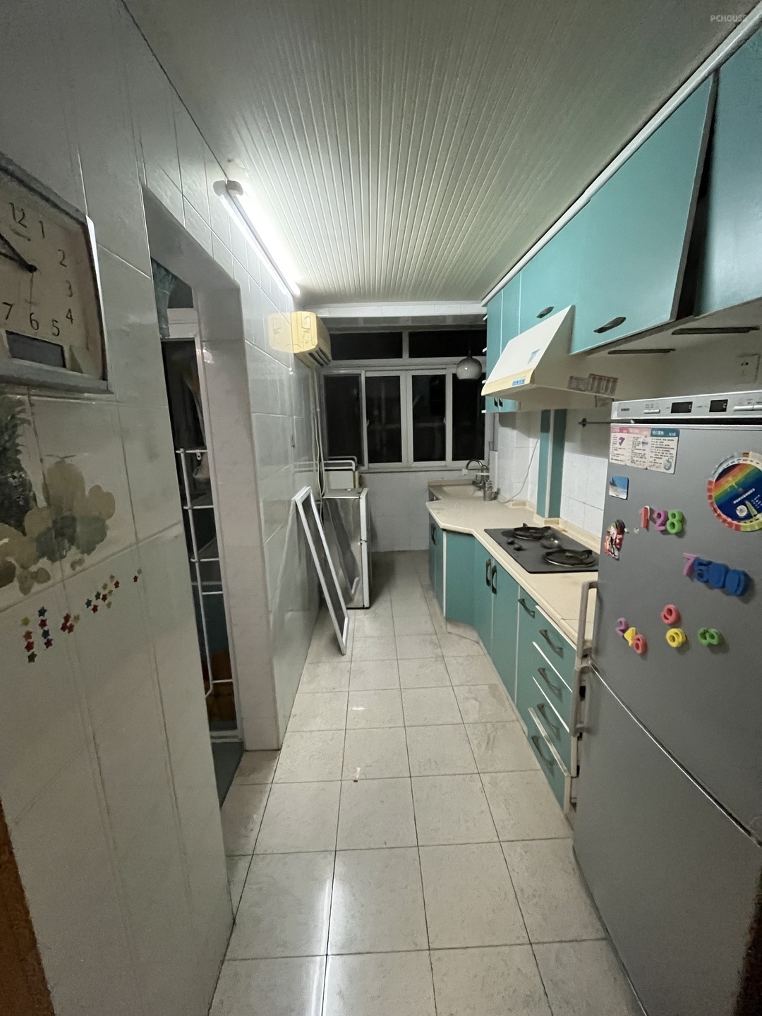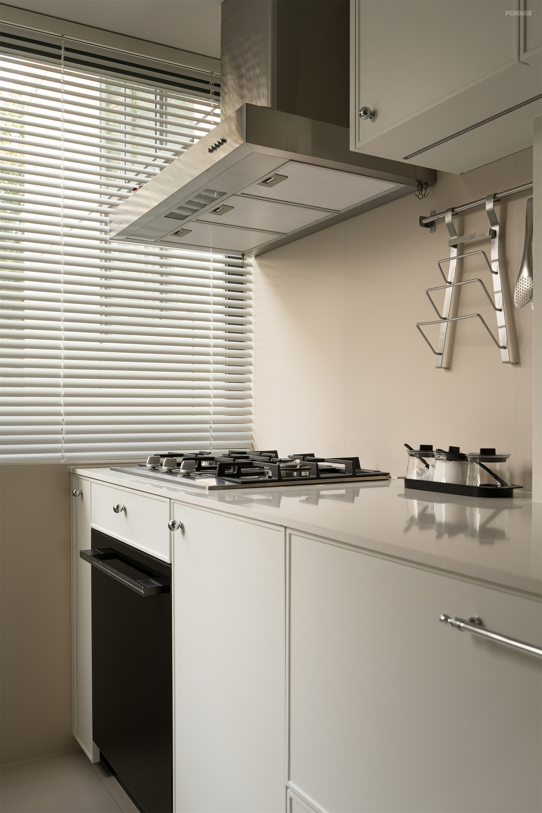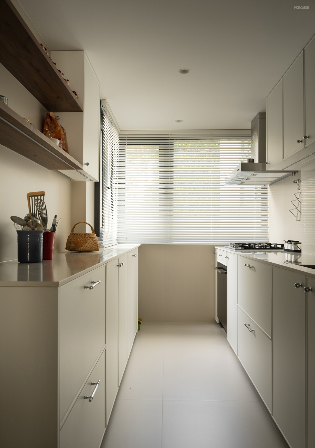 窗外绿树成荫,风景甚好,将厨房移门隐藏在柜子侧面,整个厨房采用素色大砖搭配米白色橱柜,减少视觉干扰,加强南北光线互通。原本逼仄封闭,被杂物占领的厨房,在改造后焕然一新,让下厨的心情也能够更加豁然轻松。