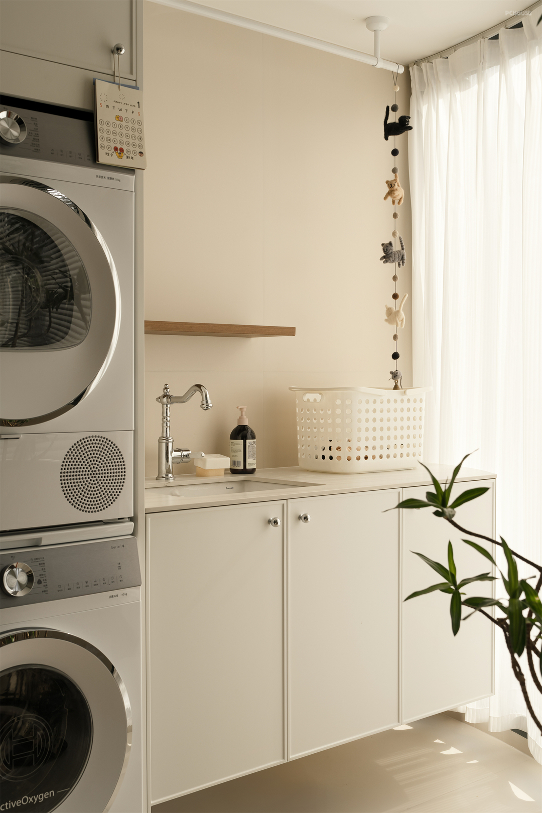把原来遮蔽光线、干扰视线的推拉门拆除,阳台纳入客厅,空间得以延展。借两端墙垛的遮蔽分别增加洗烘区和书柜,丰富功能。