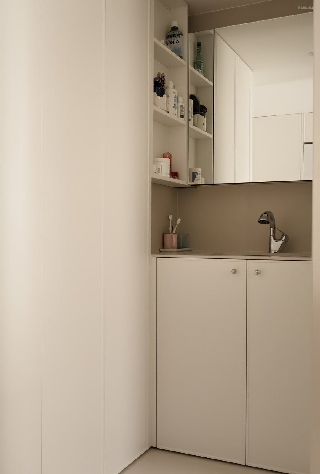 分别将两个卧室房门内推,不但将过道空间利用起来,植入储物,还为两个卧室内分别增加了一个衣帽间。简单的格局调整,却让收纳空间成倍提升,直接收益就是大幅减轻收纳负担,更好的保证家中整洁有序。