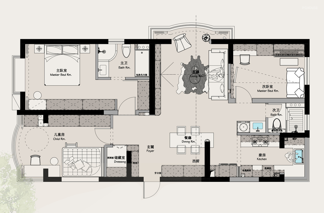 玄关&储藏室:儿童房墙体内推,新增玄关柜+独立储藏室,集中收纳露营装备、儿童车等大件物品。