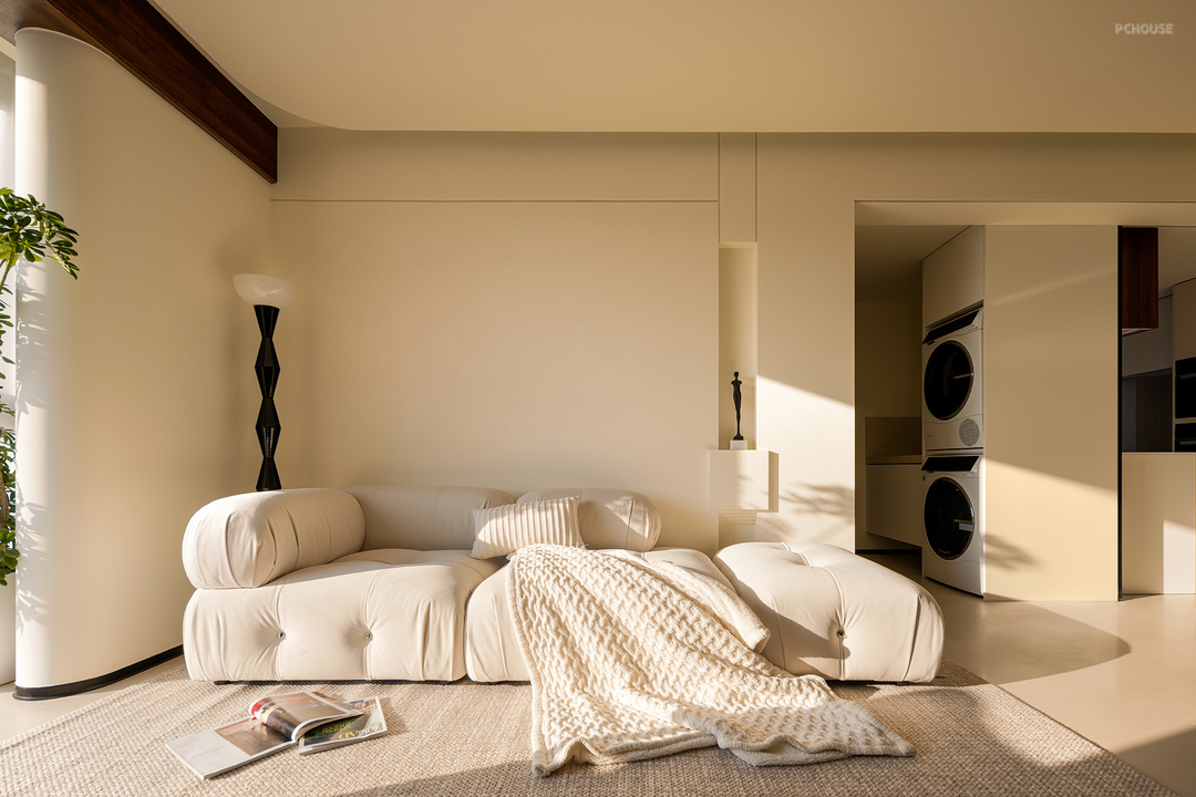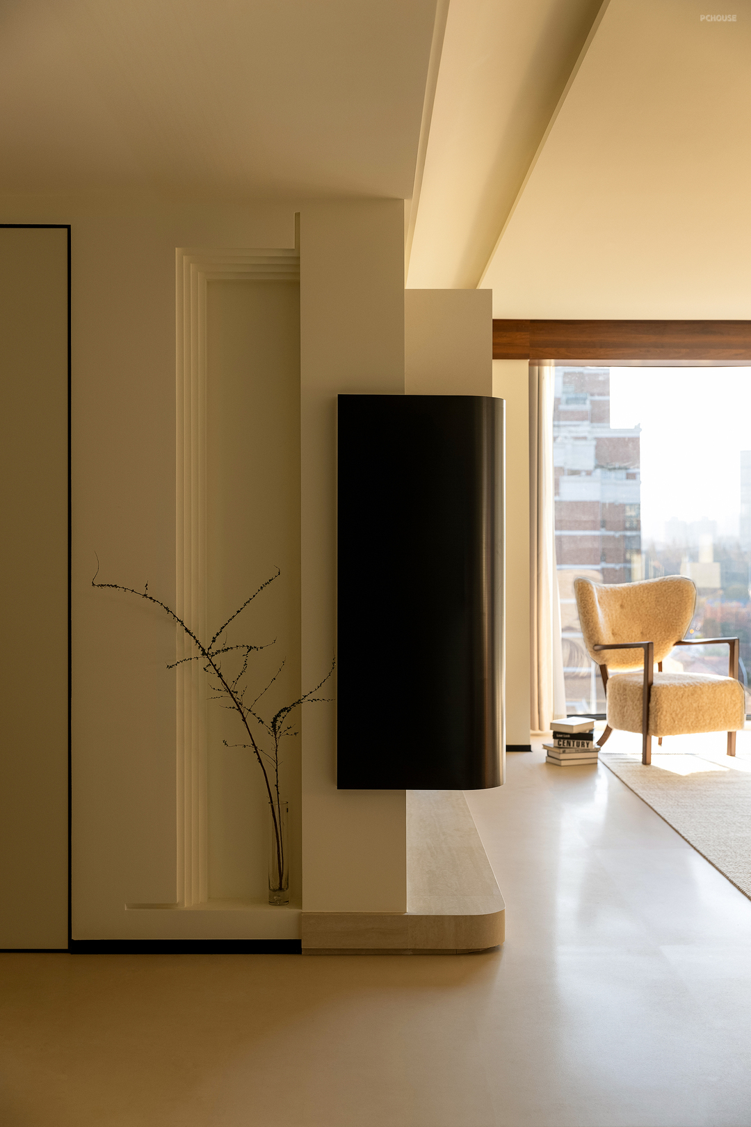 岩板包裹承重柱,水电阶段借用粉层墙体的厚度,实现圆形造型与灯饰、地台、阳台转角的弧形元素呼应。