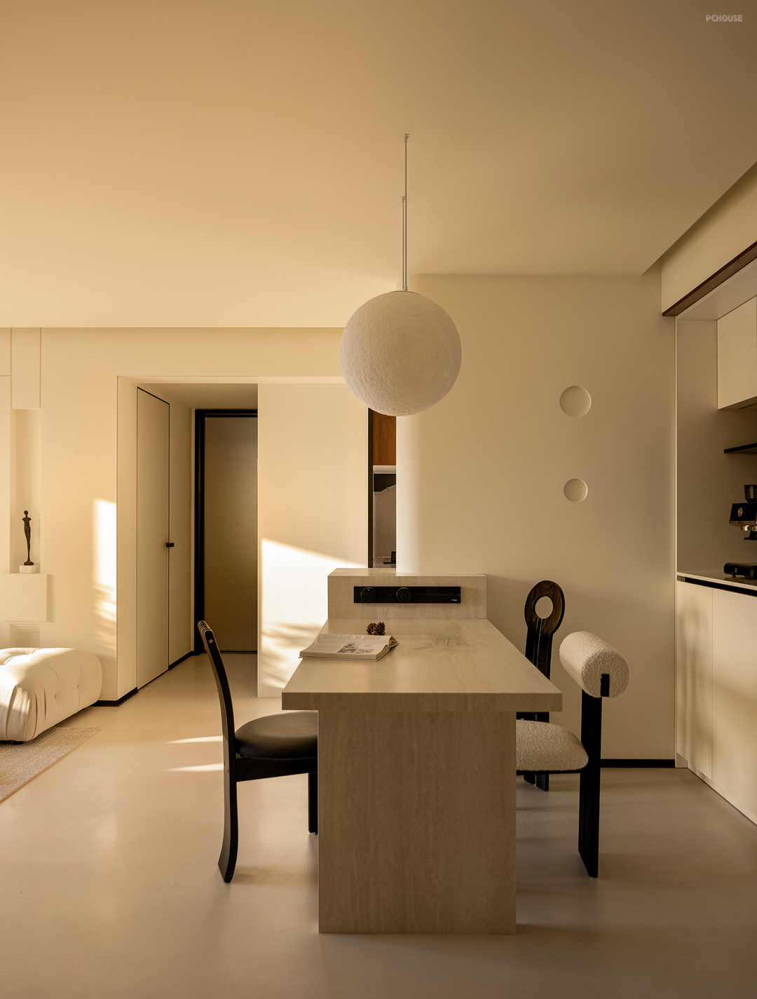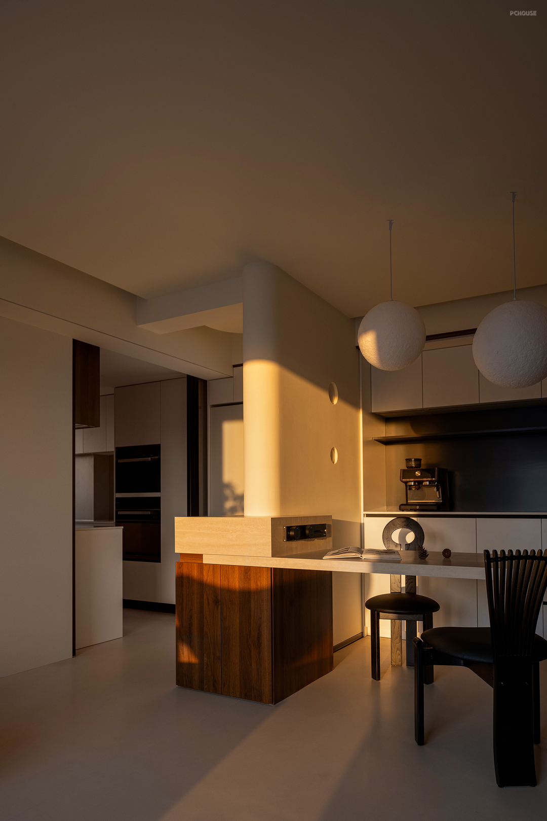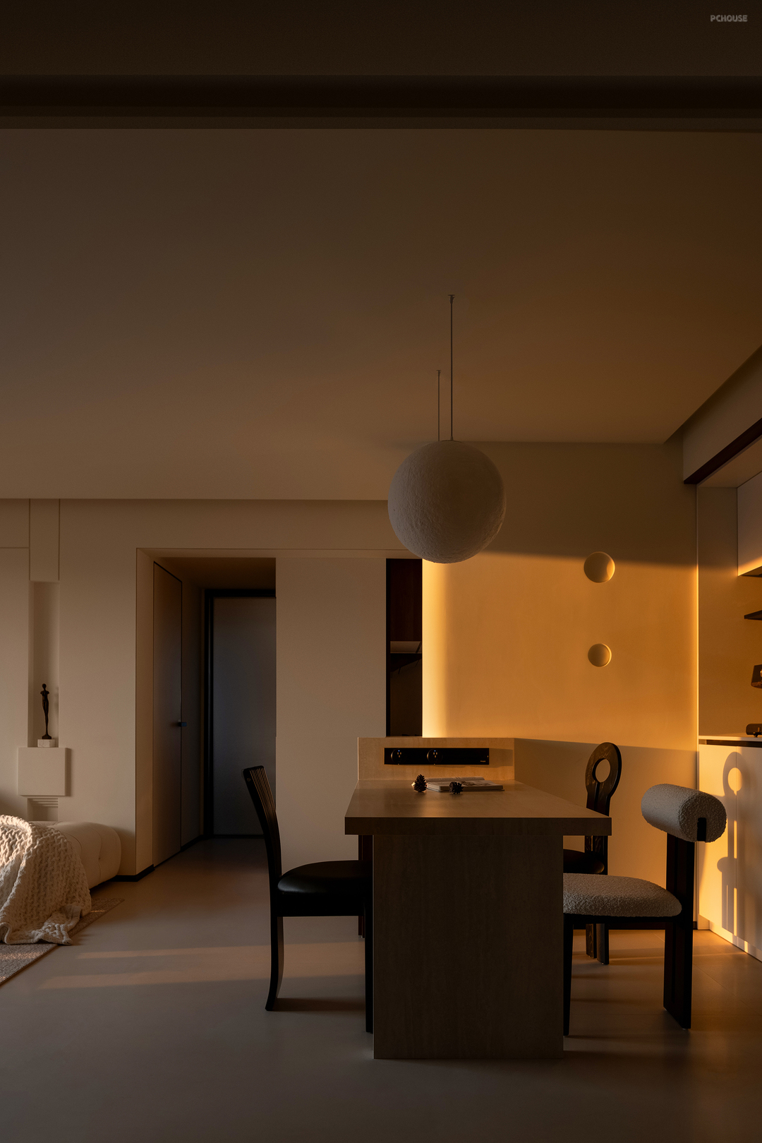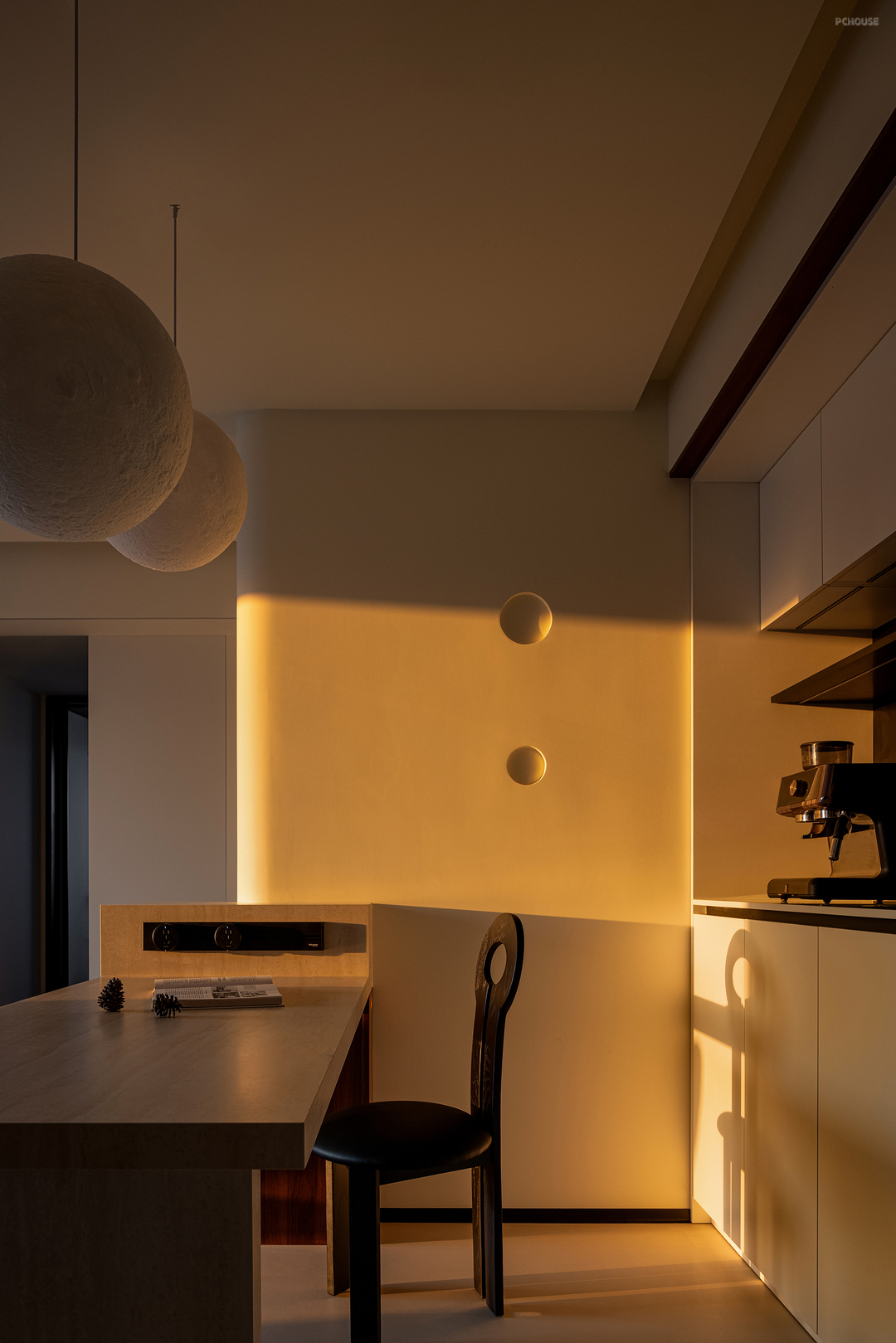 原厨房打开之后,依托承重墙体两侧布置餐岛一体与西厨,开放式布局动线、采光流畅一体。灯光是氛围的灵魂,无主灯低调,但角落里的落地灯、餐桌上的吊灯、墙上的壁灯像是悄悄打下的高光,暖光一洒,家的温度瞬间拉满。悬浮吊顶采用四边弧角工艺,以建筑级施工标准完成极简美学的完美诠释。
