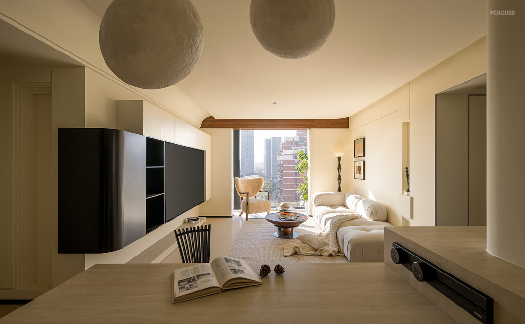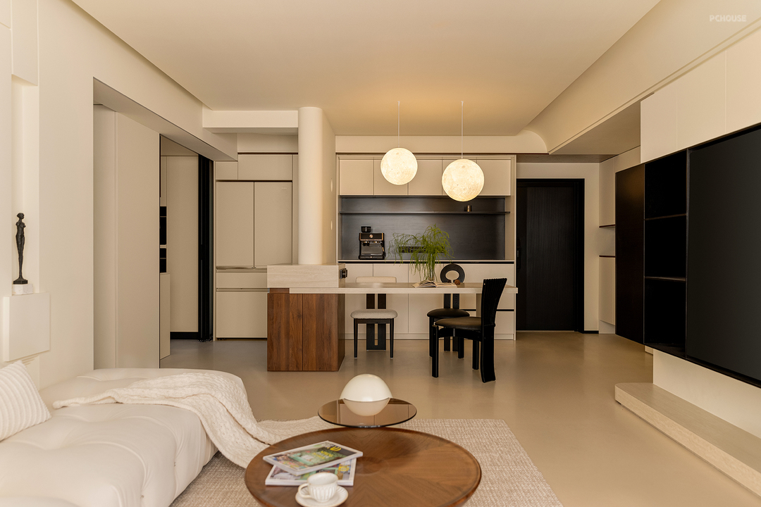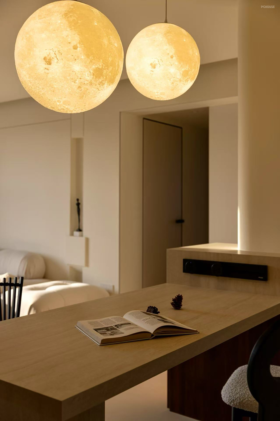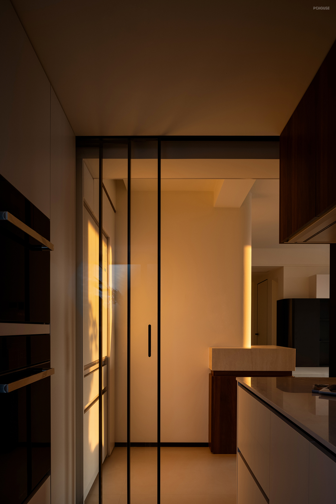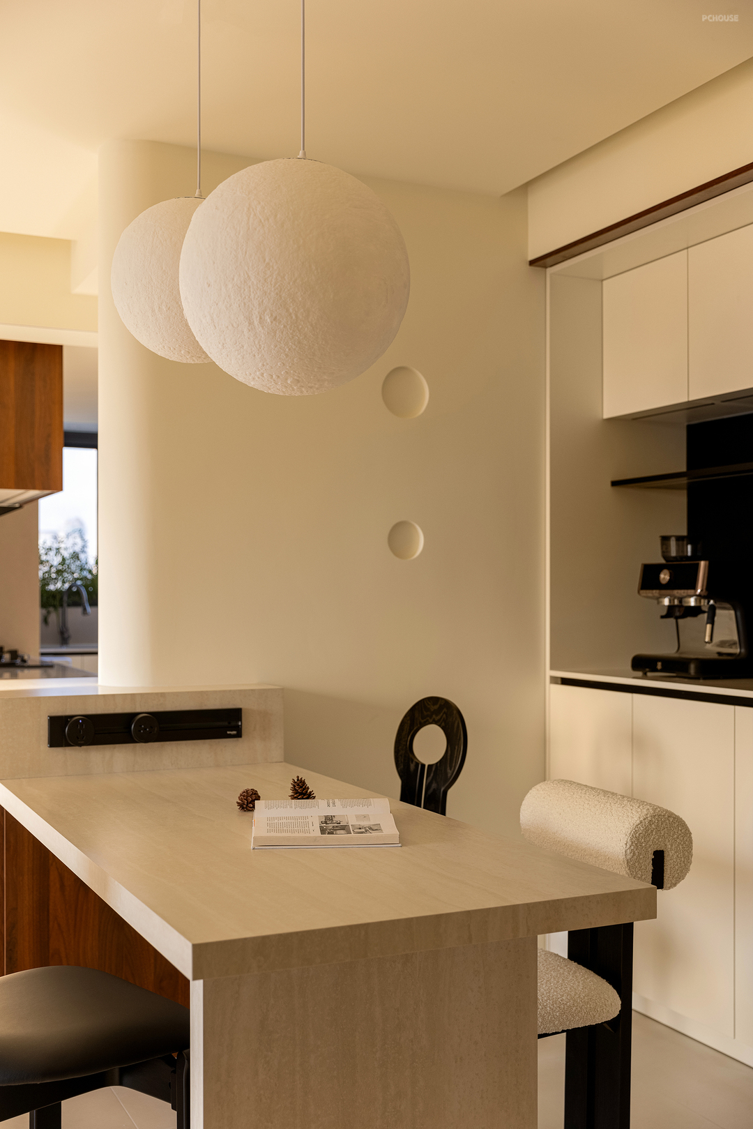 原厨房打开之后,依托承重墙体两侧布置餐岛一体与西厨,开放式布局动线、采光流畅一体。灯光是氛围的灵魂,无主灯低调,但角落里的落地灯、餐桌上的吊灯、墙上的壁灯像是悄悄打下的高光,暖光一洒,家的温度瞬间拉满。悬浮吊顶采用四边弧角工艺,以建筑级施工标准完成极简美学的完美诠释。