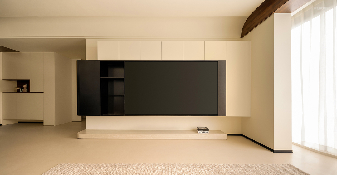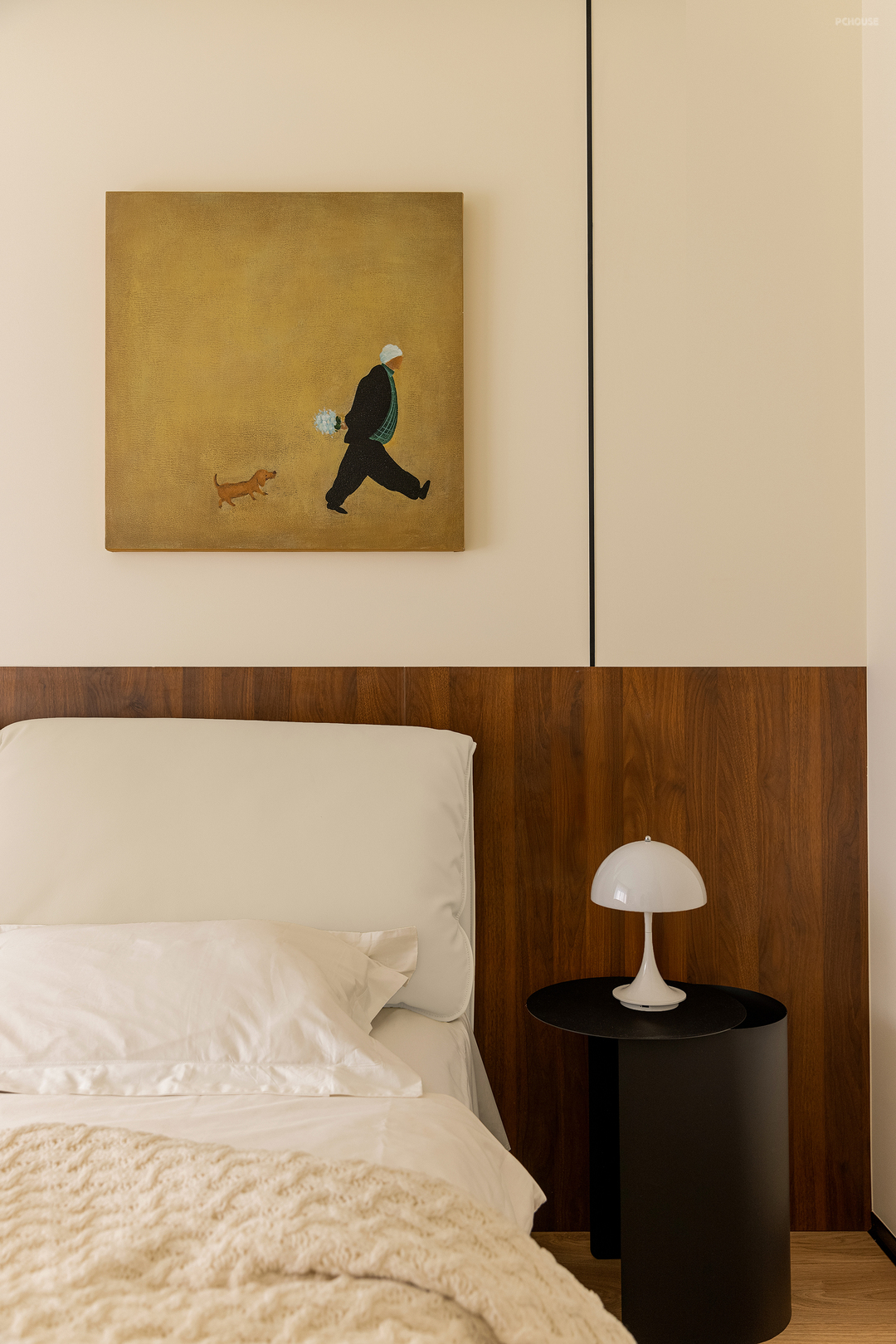 墙、顶、地统一色调,柔光砖搭配同色环氧彩砂美缝,缝隙隐于无形。悬浮柜体以黑色拉丝不锈钢层板点缀,兼顾收纳与陈列,不同材质和谐相融,质感丰富而克制,利落的线条语言,去繁就简,诠释极简精髓。胡桃木饰面横梁成为点睛之笔,破开奶油色柔腻感,注入沉稳气质,刚柔并济,层次分明。