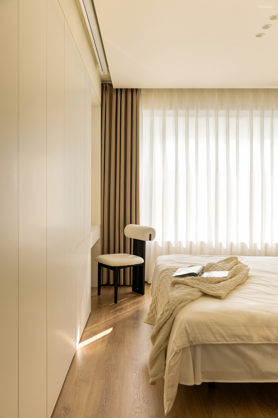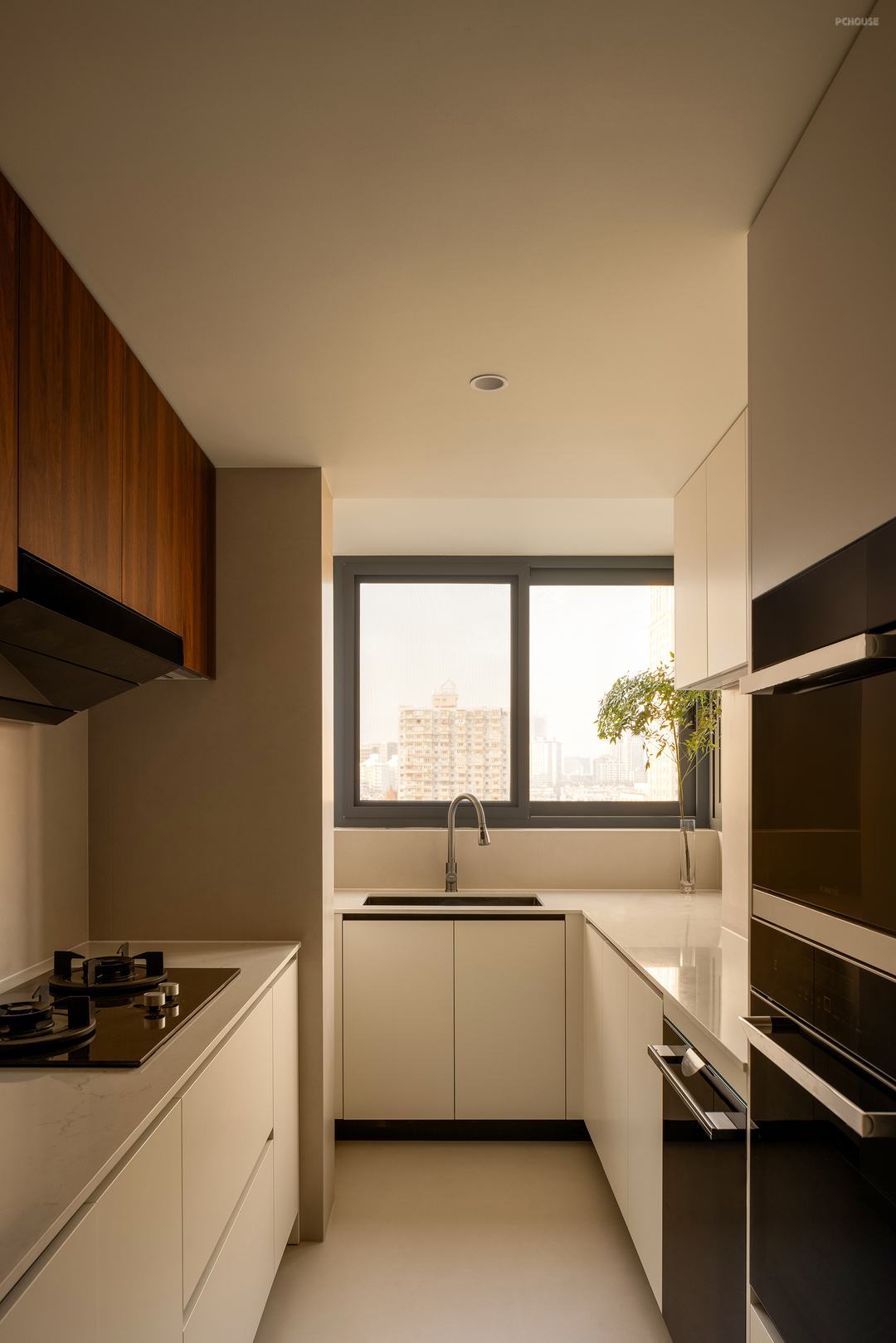 厨房与餐厅的关联通过三联动极窄吊轨移门灵活分隔,门扇可完全隐藏于定制高柜与嵌入式冰箱之间,生活的弹性,就藏在移门的一开一合中。阳台内包为U型厨房实现收纳与台面双重增容,纯白台面,无下挂无挡水条,极简美观,与同色地砖相辅相成,清爽洁净的氛围,那些切菜、煮咖啡的日常时刻,都成了治愈系的生活蒙太奇。