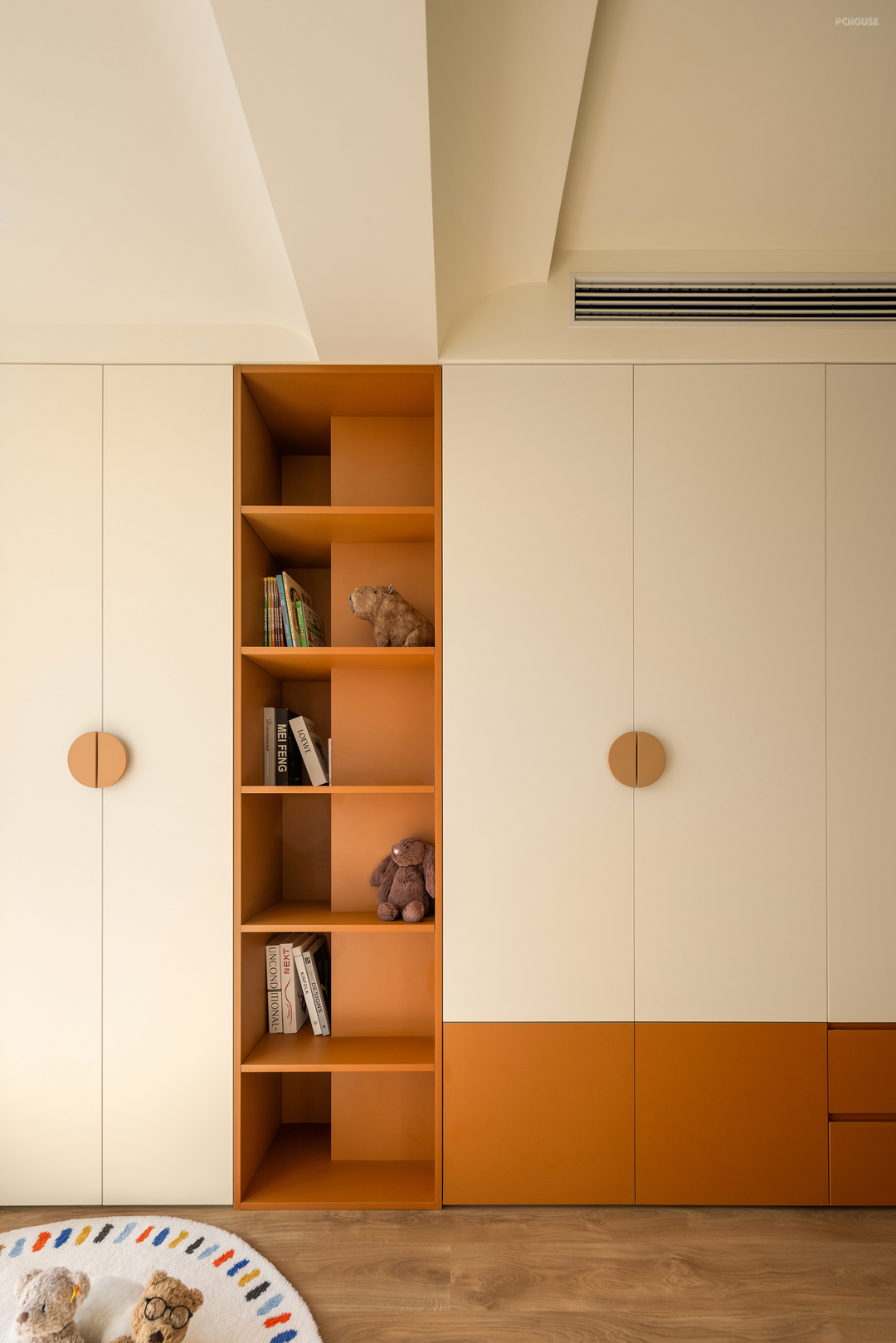 打破短暂陪伴的设计局限,以空间色彩叙事重构儿童房的生命力,活力橙碰撞沉稳的中性基底,既能承载天马行空的想象力,又能通过色彩的比例巧妙调配,让孩子在成长过程中灵活切换风格。