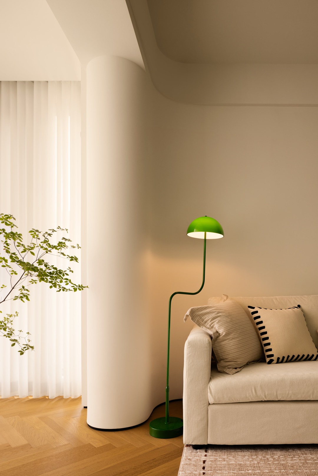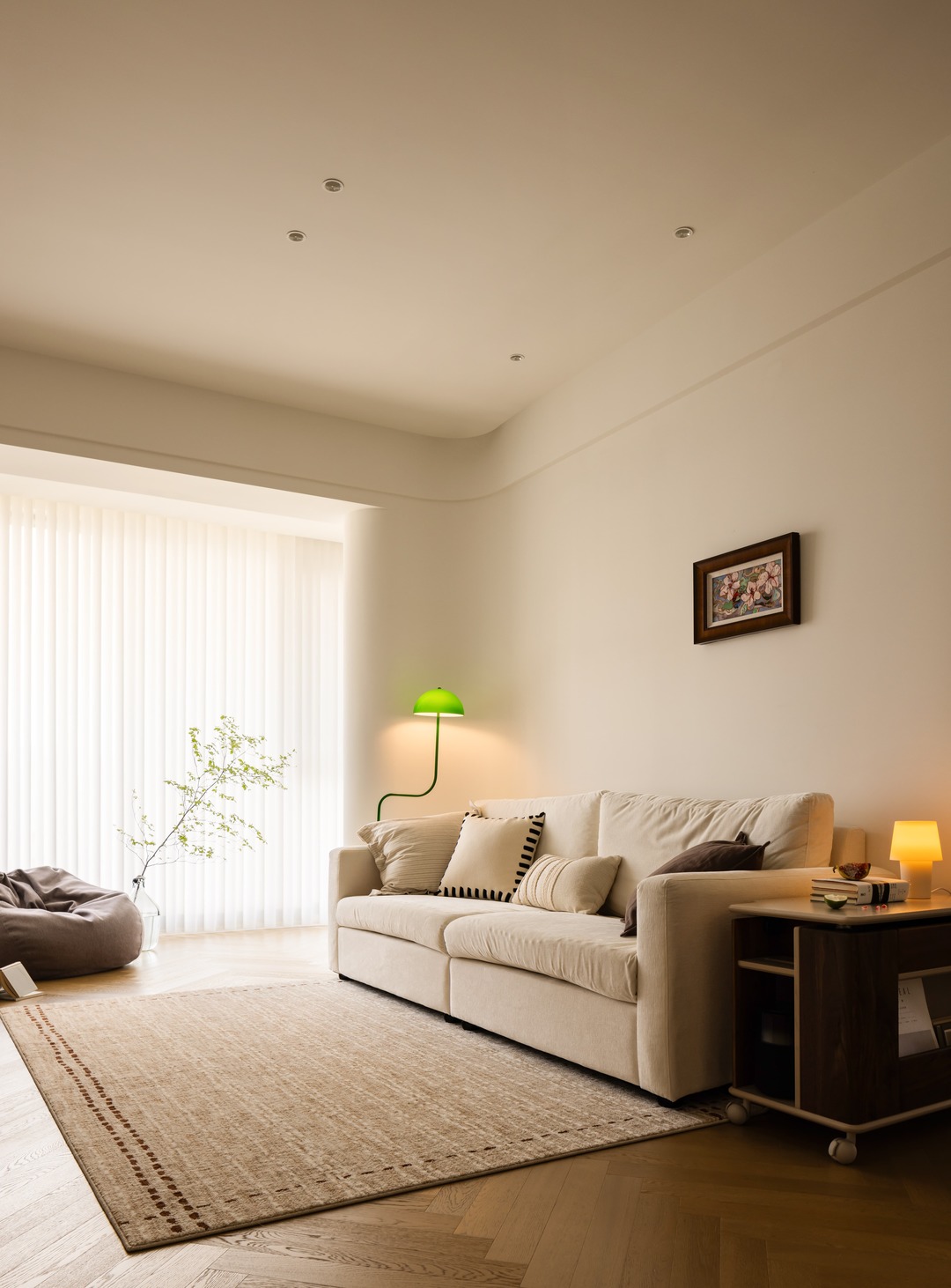 米色沙发与墙面完美融合,将柔和治愈之力呈现到底,一盏落地灯洒下绵延无尽的暖意,在日常生活中营造出一种富有活力和温馨的核心力。