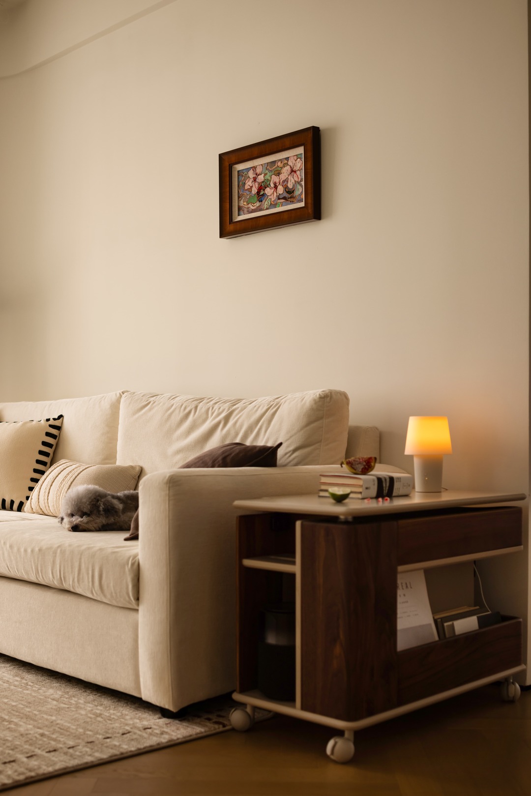 用宽阔的木质边几代替茶几,整个客厅呈现出一字横厅布局,光线从阳台贯通整个空间,奶油白带有的扩张感,空间便轩敞、明亮通透。