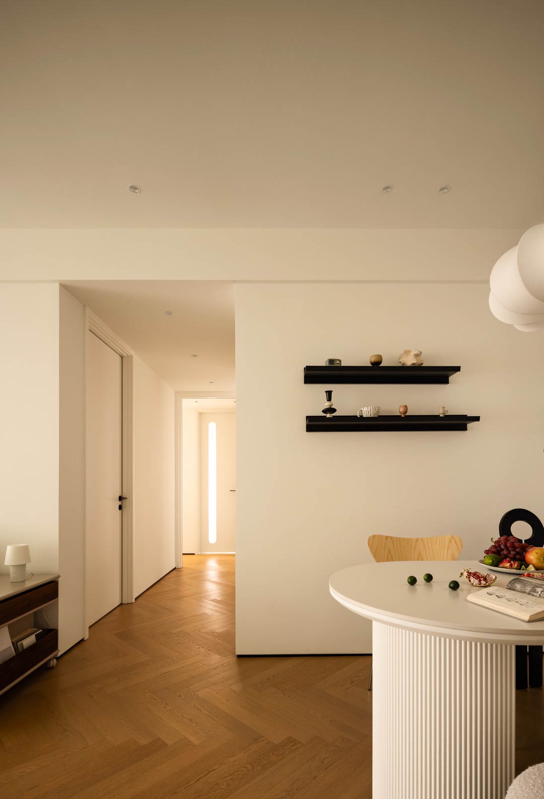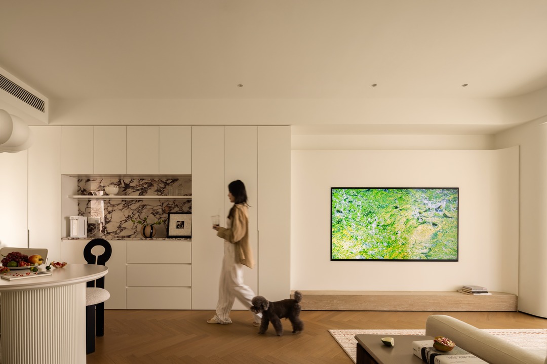 家的旋律与优雅,伴随着温柔而流畅的弧线,从木质地台里生长出温润的诗意,背景墙如同铺开的纸卷,上演着不同的世界。