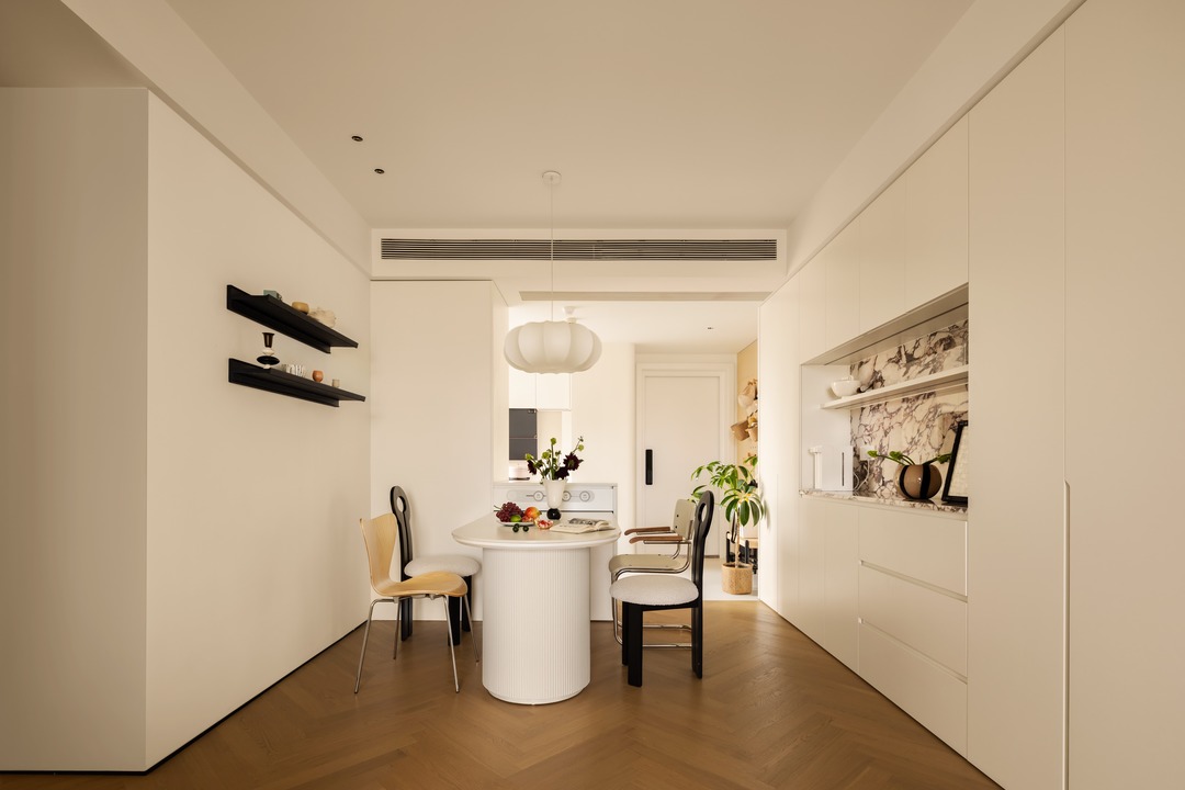 空间简化但生活从不简单,奶油系散发的治愈力徐徐散开,巧若无形的氛围,从视觉、触觉渗透,直达内心。设计将生活区域进行分划布局,把屋主对生活的态度融入到空间设计中,打造出属于他们的浪漫居所。