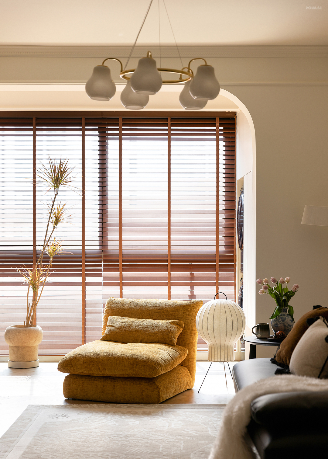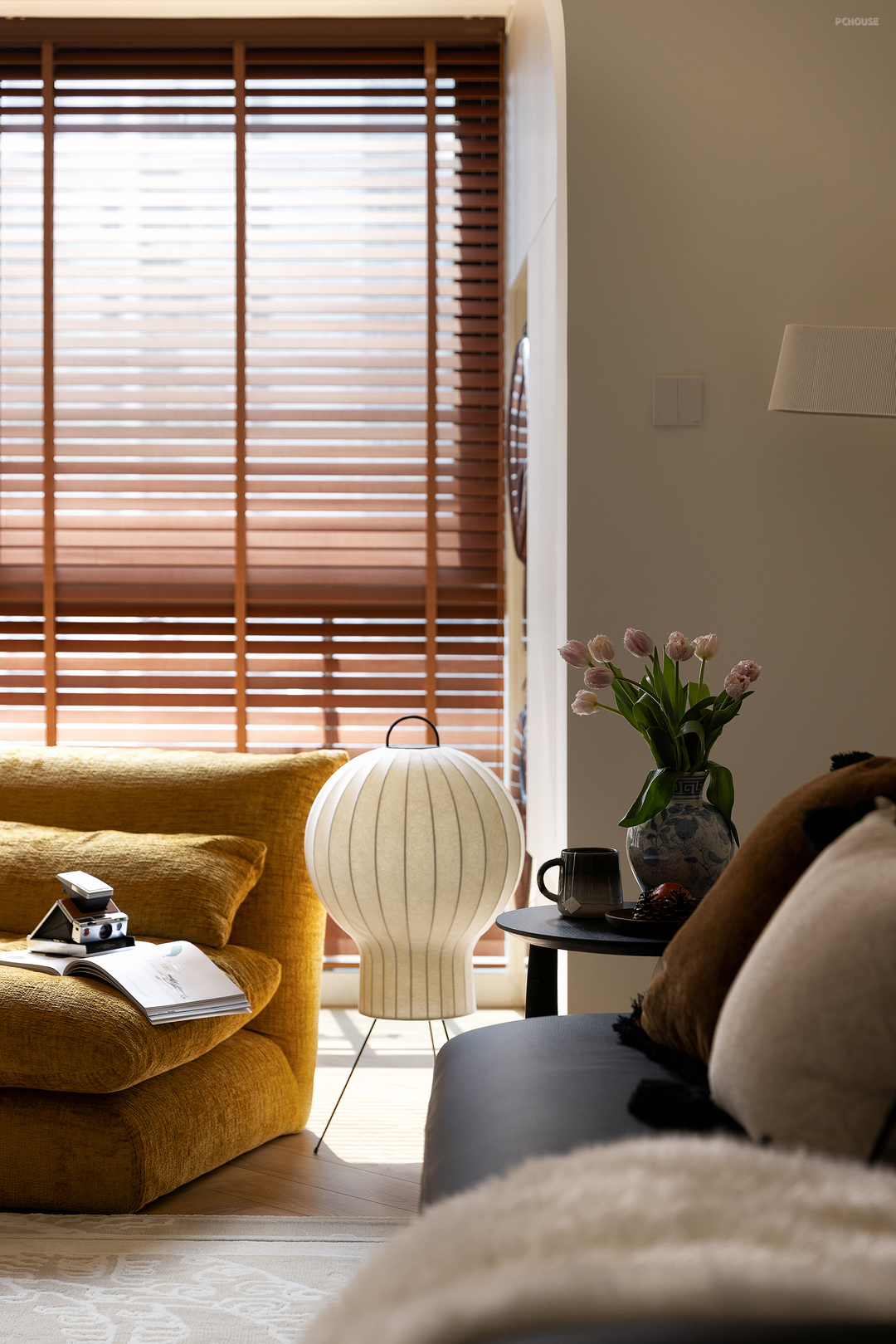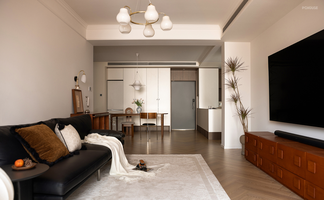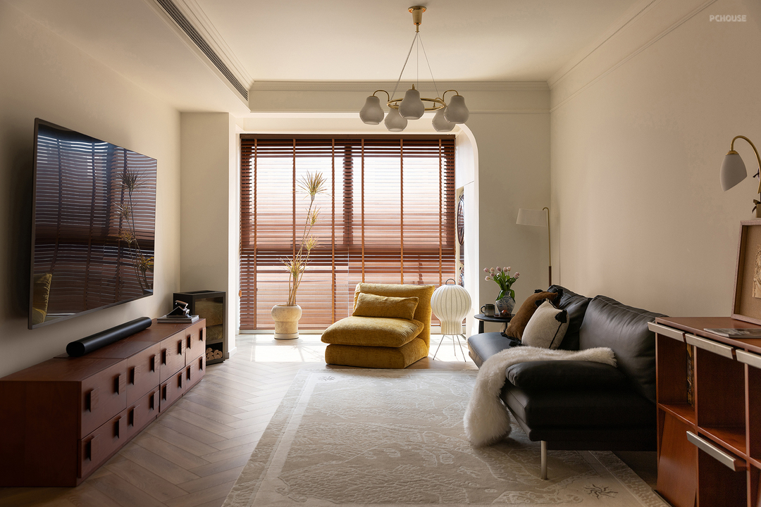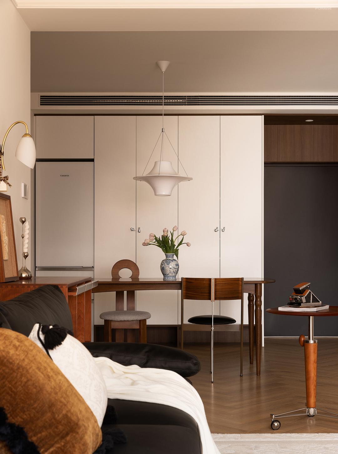 整个空间巧妙融合了现代质感与复古元素,皮质沙发、郁金香、纱帘与木质家具共同谱写出一曲静谧的生活乐章;中高柜的棕色系木门与浅色的人字拼地板形成了鲜明的对比,每一处对比设计都让空间更显立体,仿佛打造出一个远离喧嚣的治愈系居所。也让屋主在享受家居生活的同时,能够感受到设计带来的独特魅力