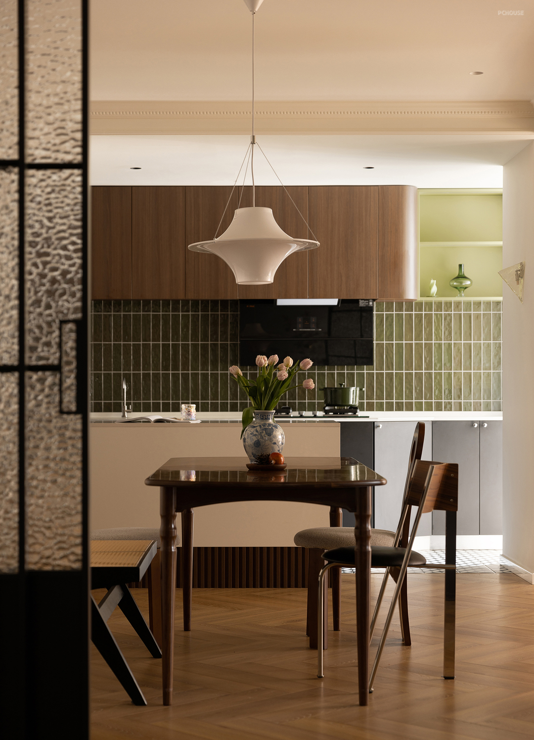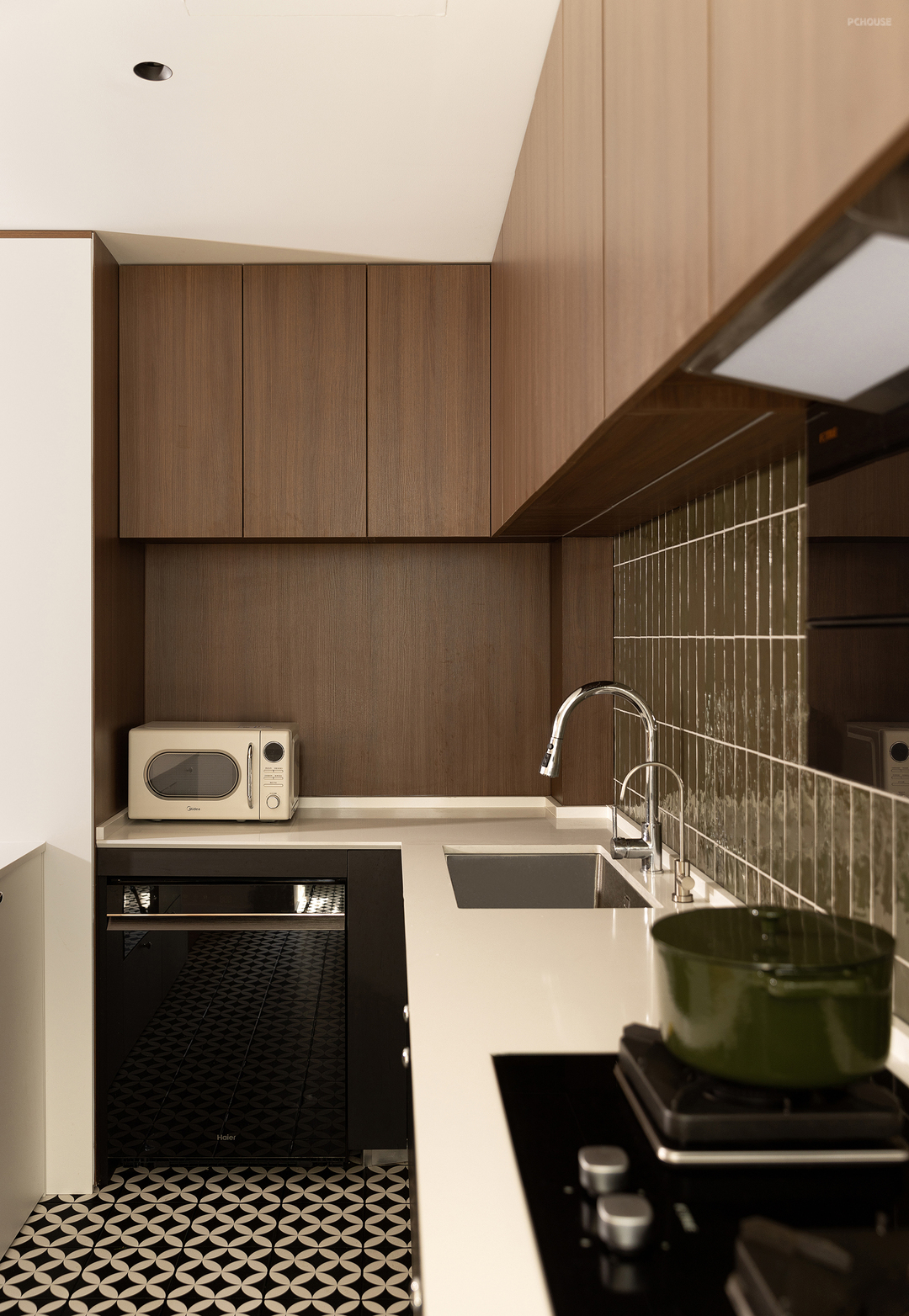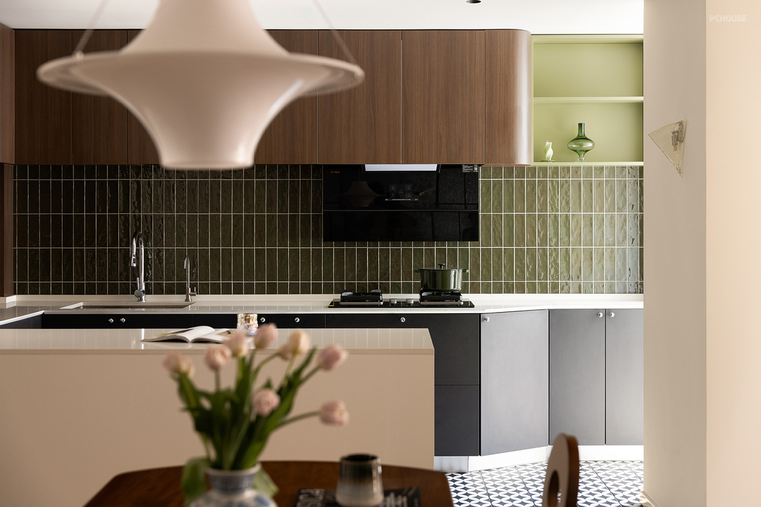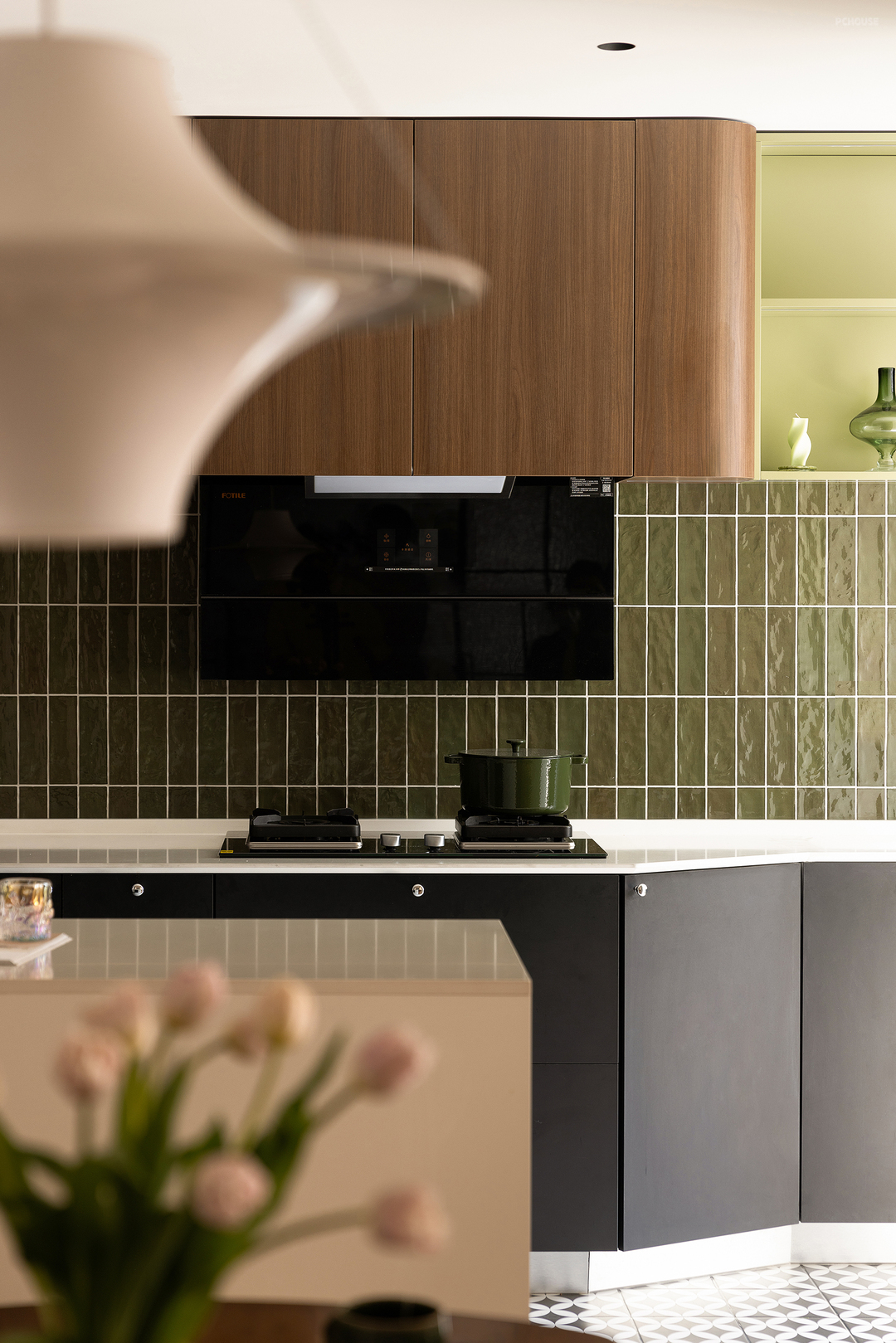 柜体设计中大胆使用高级灰与木色组合,诠释南洋风的纯粹与温暖。为打破可能产生的沉闷感,墨绿色手工砖为厨房增添一抹生机,清新悦目的设计让日常烹饪成为一种享受,在美食与美学的交融中感受生活的愉悦