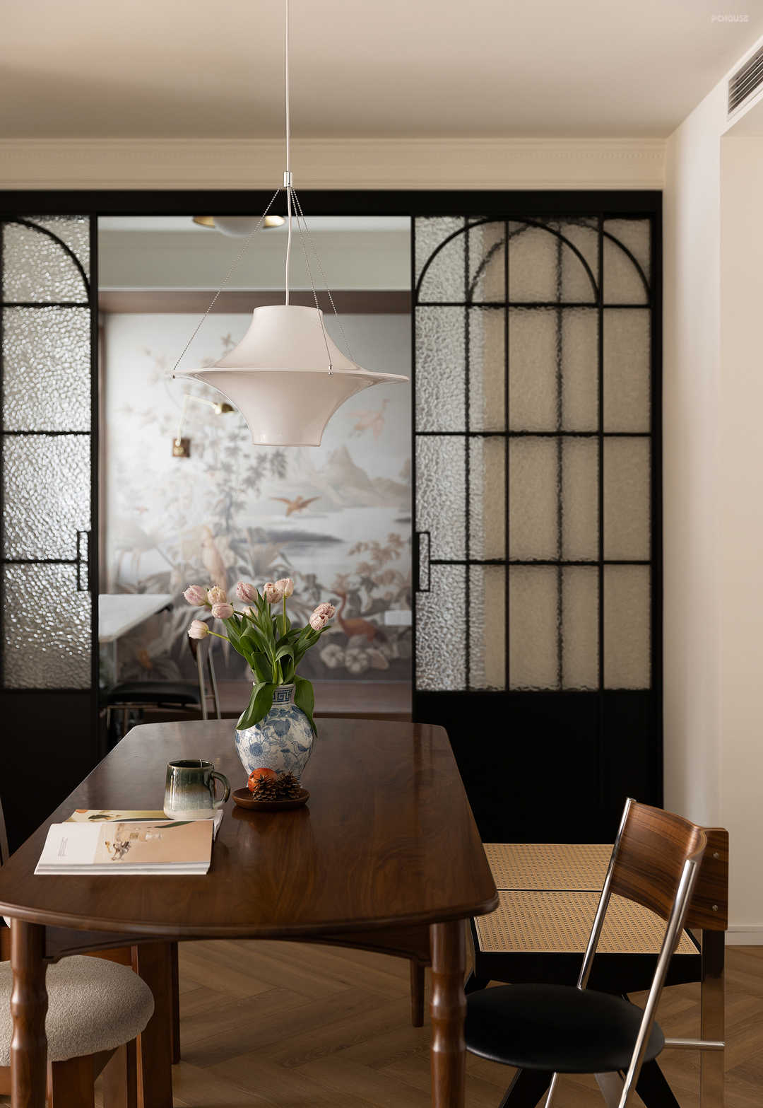 老钢窗框搭配钻石玻璃的移门,为书房注入复古美学的绝佳选择,既保留了历史韵味又兼顾了现代功能需求。胡桃木、鱼骨拼营造复古氛围,夜晚光线透过玻璃投射出朦胧光斑成为空间焦点