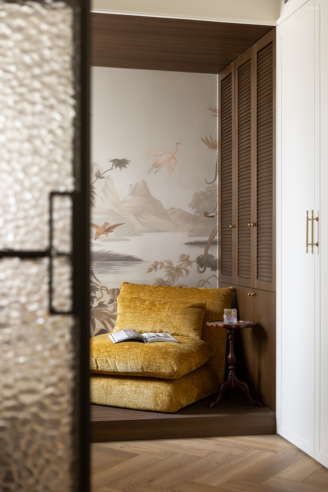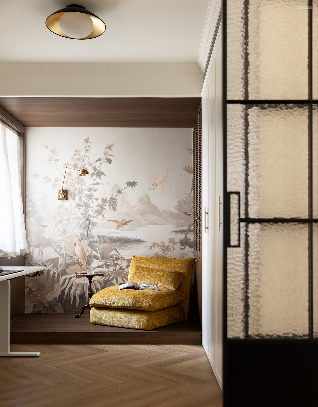 书房空间被巧妙地设计成一个多功能区域,局部地面抬高12公分做地台,长2.1m*宽1.3m既可以作为临时客卧,也可以作为独立书房,同时还是一个休闲放松的区域,实现了三合一多功能房。中古法式玻璃吸顶、充满生机的花鸟壁纸为空间增添了一份自然的气息。