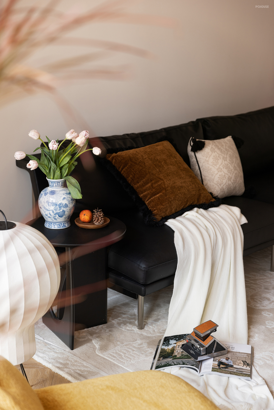 黑色的皮质沙发与一束优雅浅粉色郁金香花束相搭配,形成了一种独特的视觉对比。这种对比不仅展现了柔和与干练的反差之美,而且营造出一种时光沉淀的美感。沙几个复古风格的抱枕随意散落,为空间注入几分慵懒惬意,让人在忙碌中寻得片刻宁静。