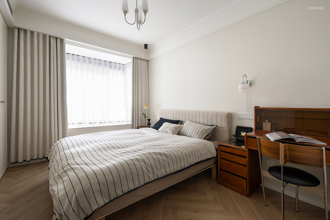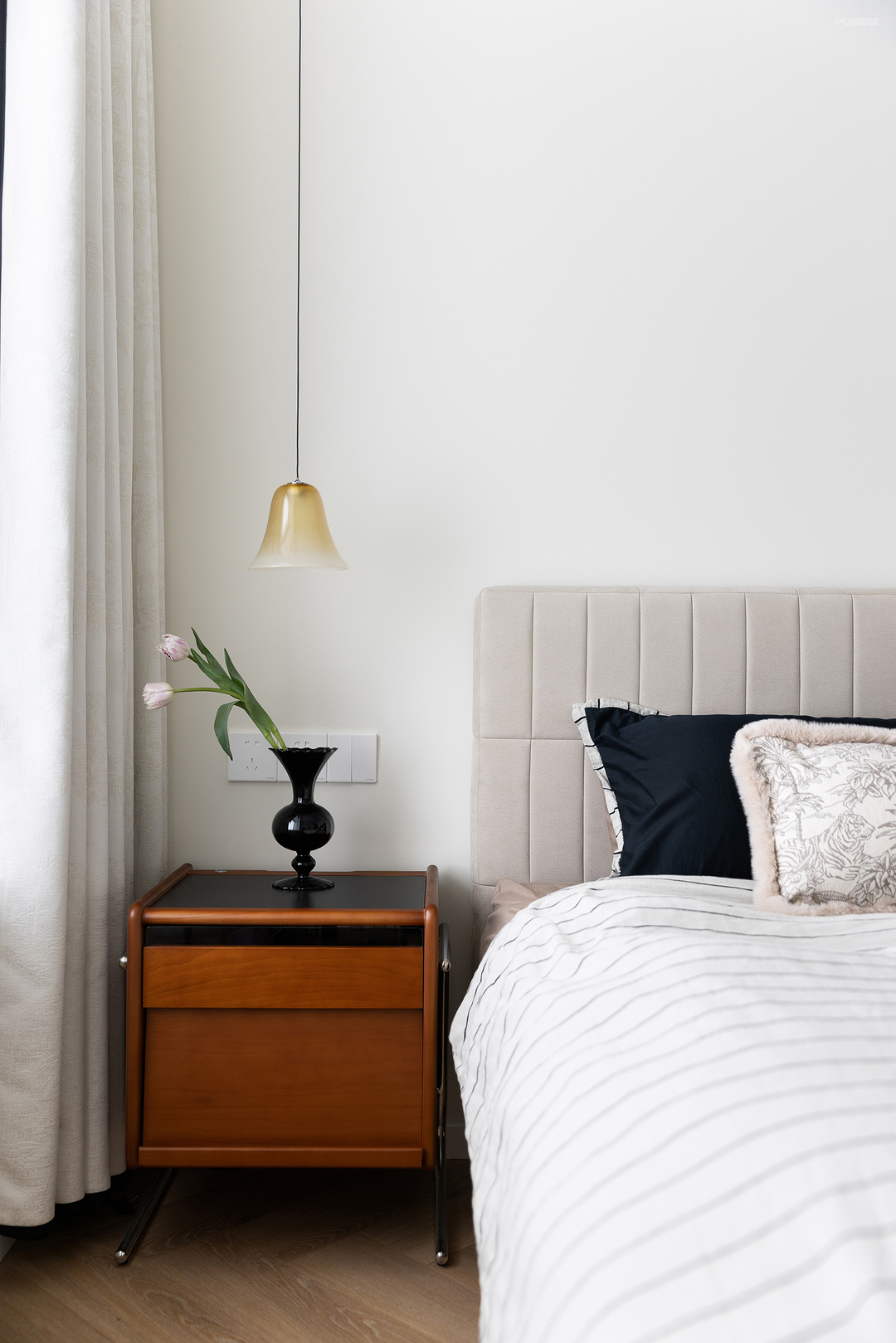 主卧木色和白色营造出温馨而自然的氛围,给人以宁静、舒适感。木色的家居和装饰品,都透露出一种质朴和原始的美感,而白色的墙面和床品则为整个空间增添了一抹明亮和清新,在这个空间中享受到真正的休息和放松。