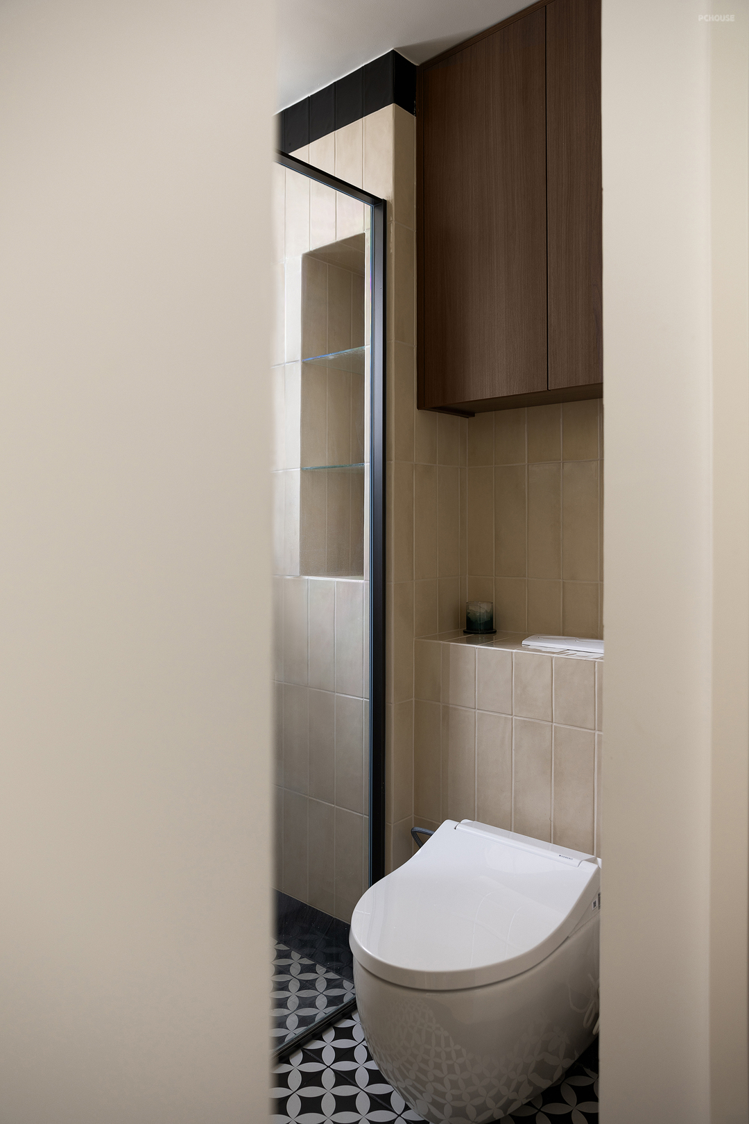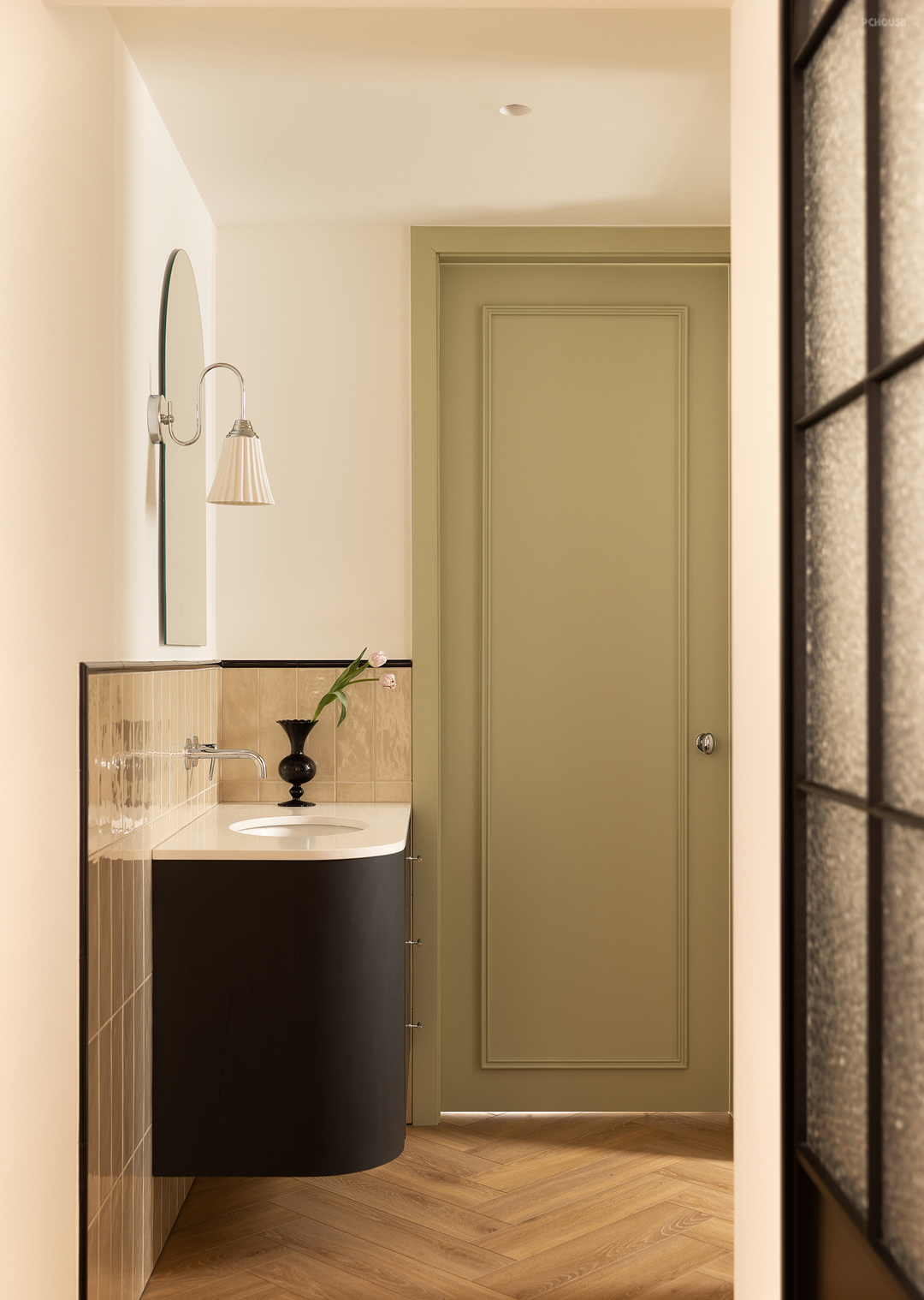 在卫生间干区的设计上,设计师巧妙地运用了浅棕色复古砖与黑色镶边的组合配色,赋予了这面原本普通的墙面一种独特的韵味。 黑色圆弧形台盆以其优雅的弧线设计,巧妙地融合了现代美学与实用功能,使得整个区域不仅仅是一个简单的洗漱空间,而是一个充满设计感和舒适体验的区域。这种设计的运用,在日常使用中能够享受到更加精致和有品质的洗漱时光,同时也体现了设计师对于空间细节的深刻理解和精心打磨。