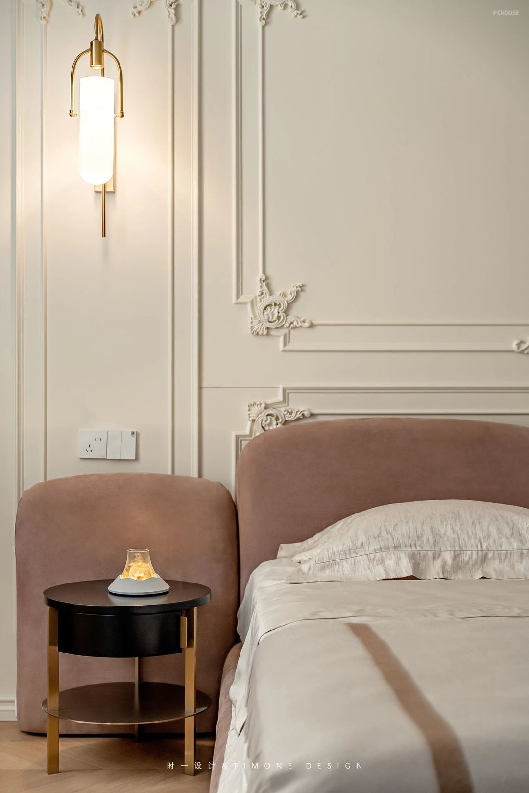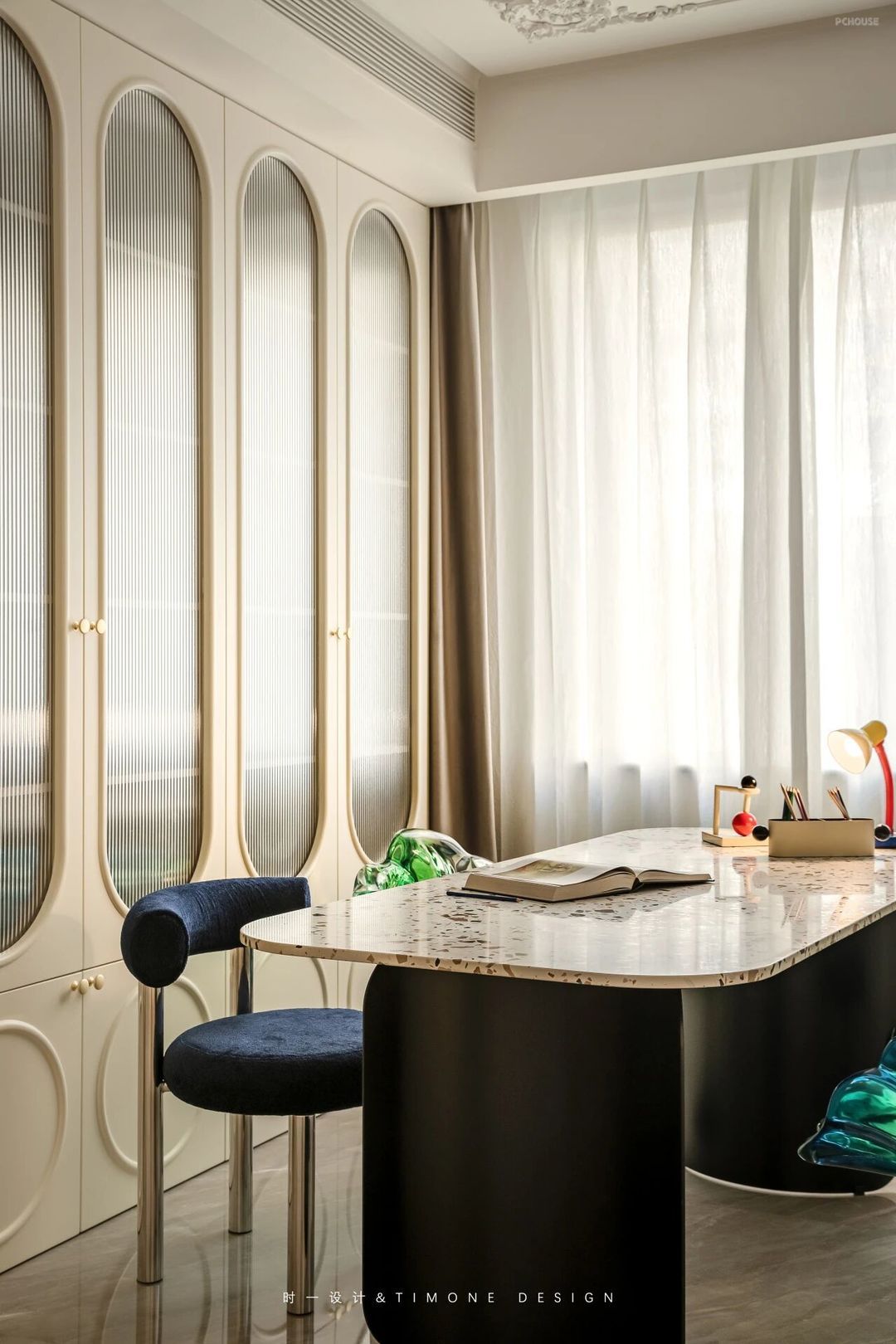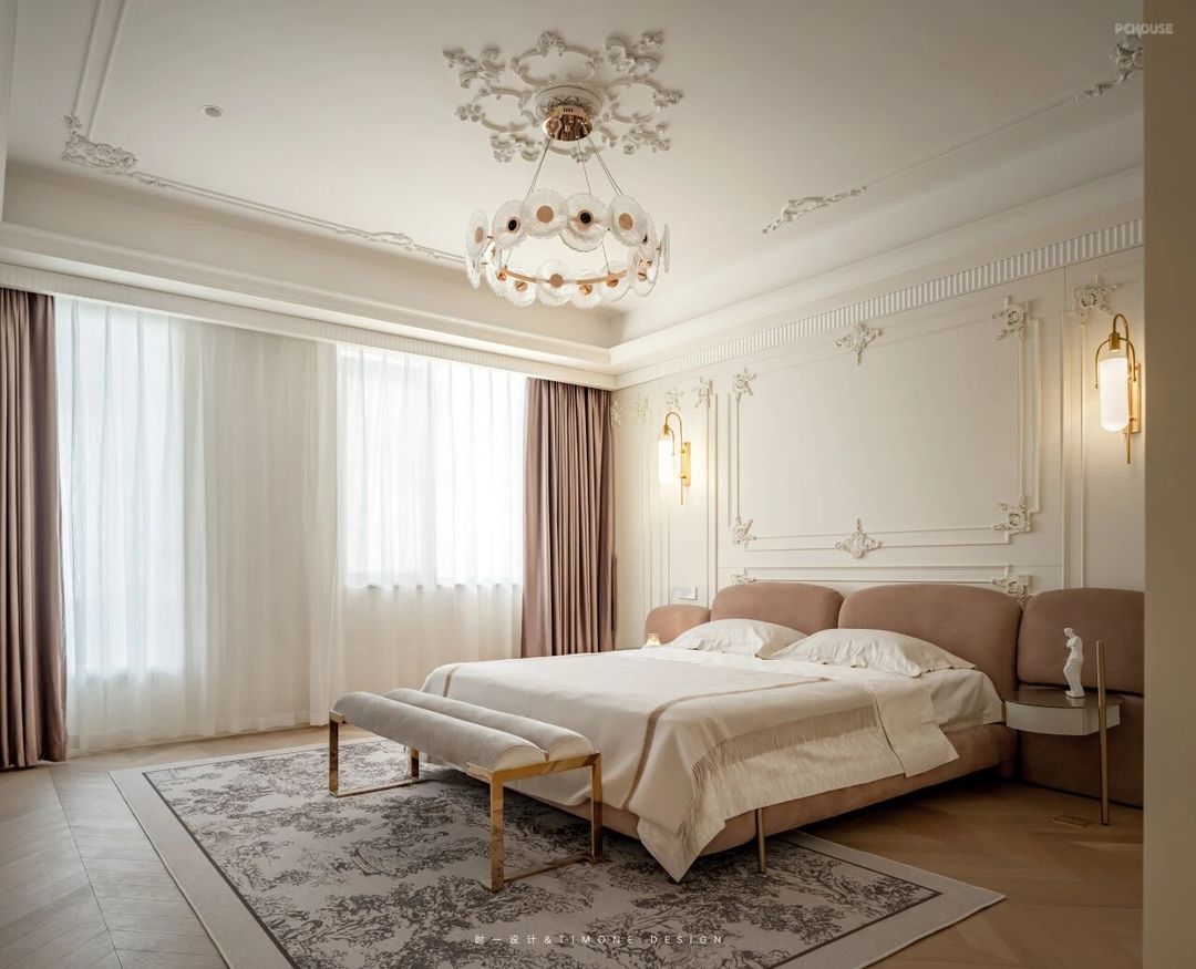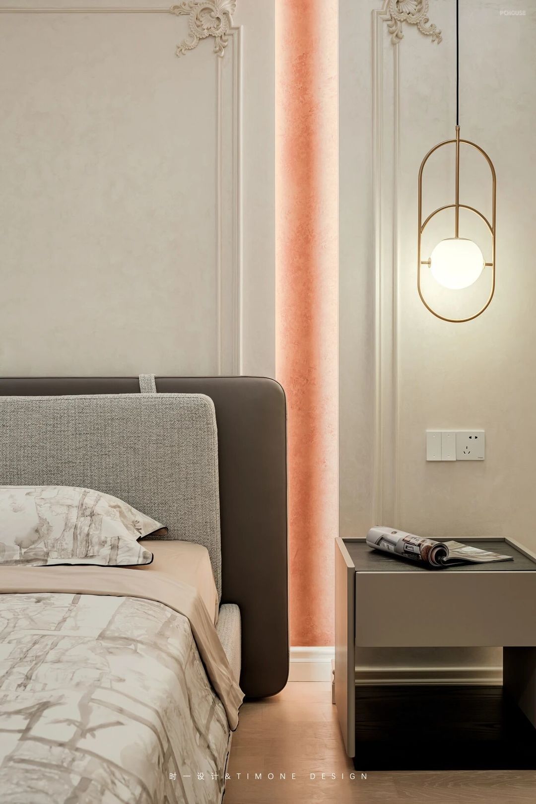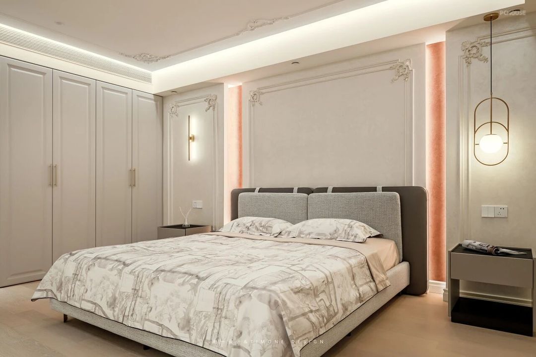 空间的色彩层次,由不同情绪质感的“白”演绎,调和均衡,令视觉感到松弛舒适。对于居住场景的设想,灵感源于“褶子”的美学元素,通过现代法式的特色符号演绎,以不规则、曲线等不同层次的造型,演绎优雅生活的艺术美学。